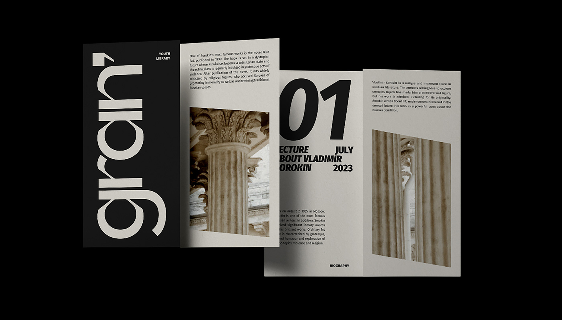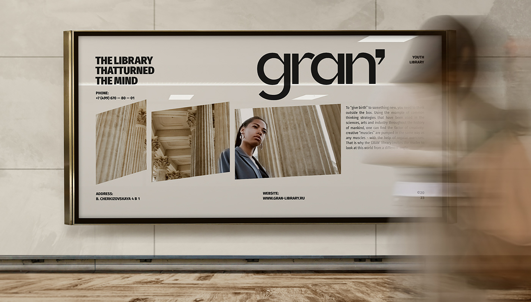 За основу визуального стиля мы взяли метафору граней ра-зума подобных гранённому стакану: грани — прямоугольники, разворачивающиеся в пространстве. Нам важно было показать сдвиг — то самое влияние литературы на мозг человека. Мы связали стиль классицизм — стиль здания с его монументальностью, граненными колоннами и масштабом с полётом мысли человека, деформацией разума, взглядов, решений, образа мыслей при прочтении книг.