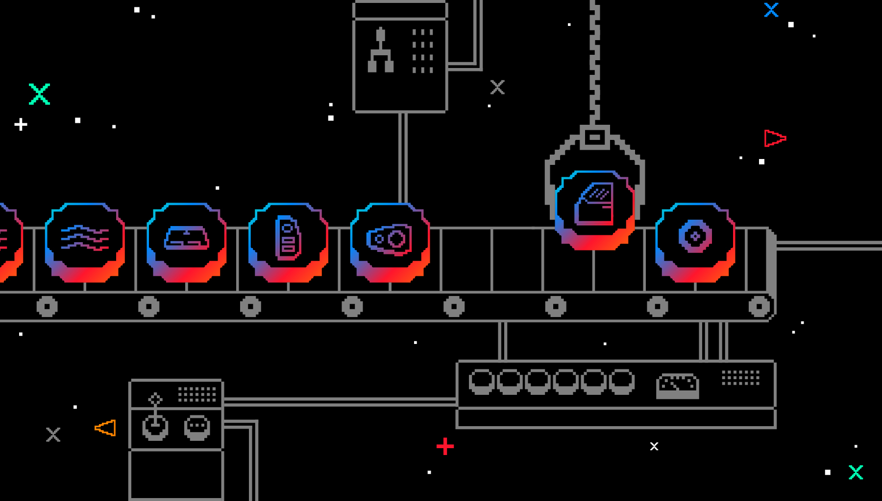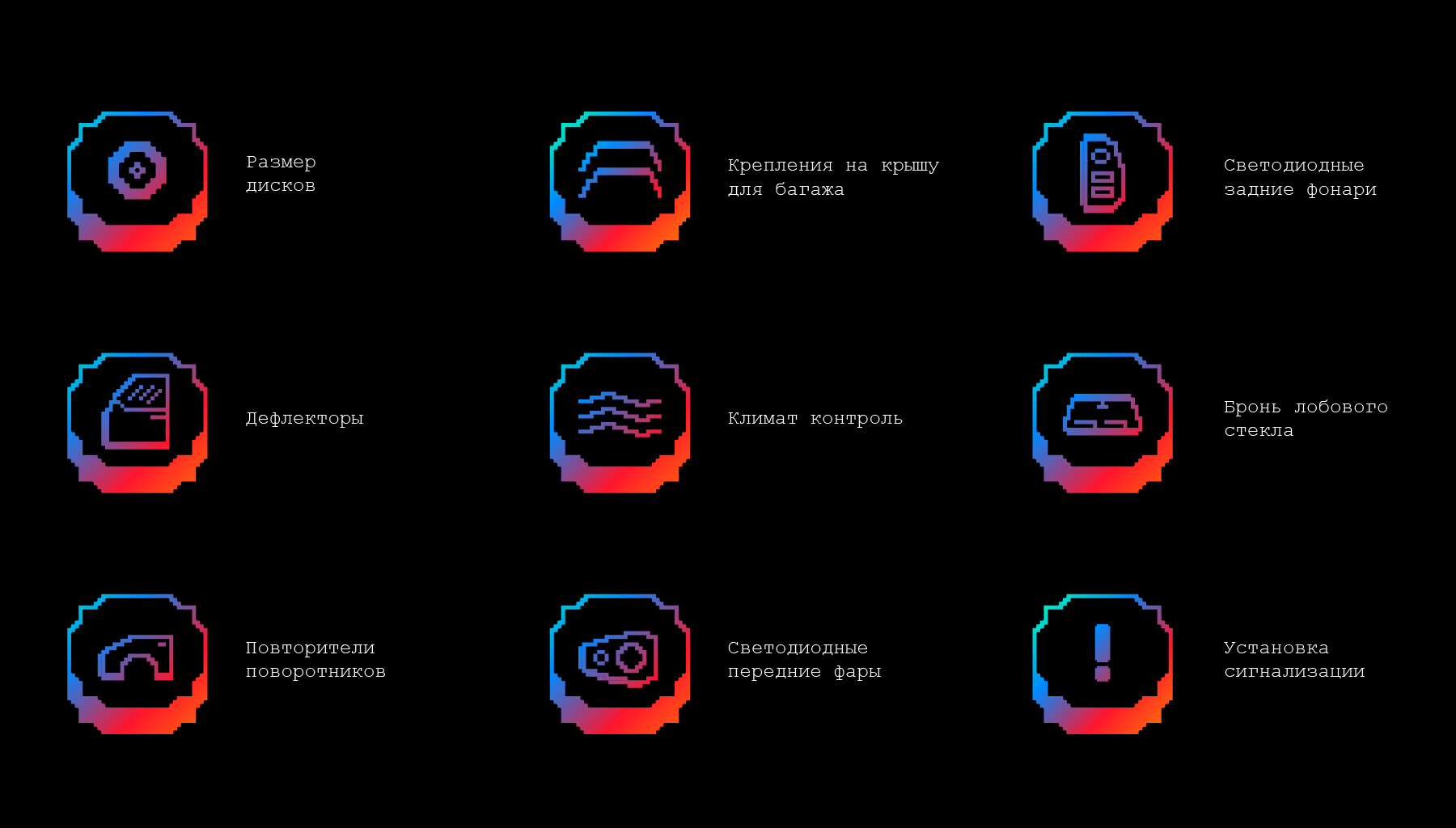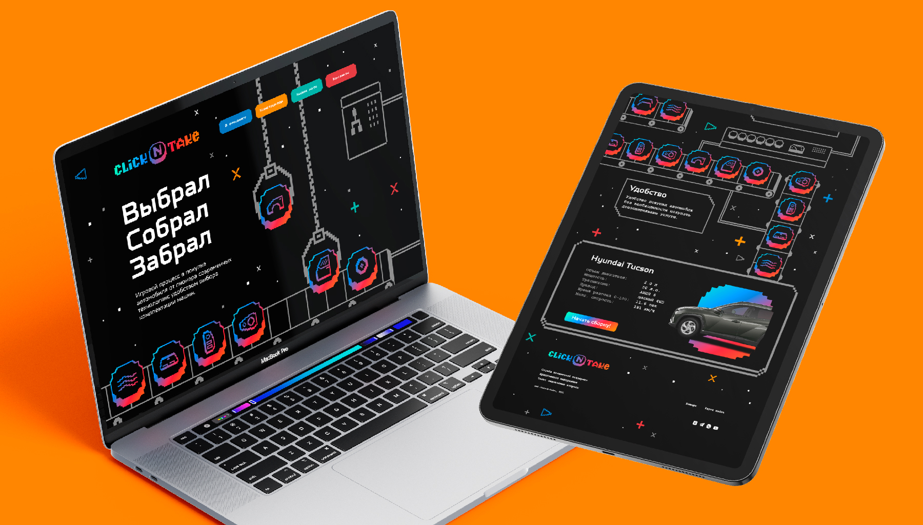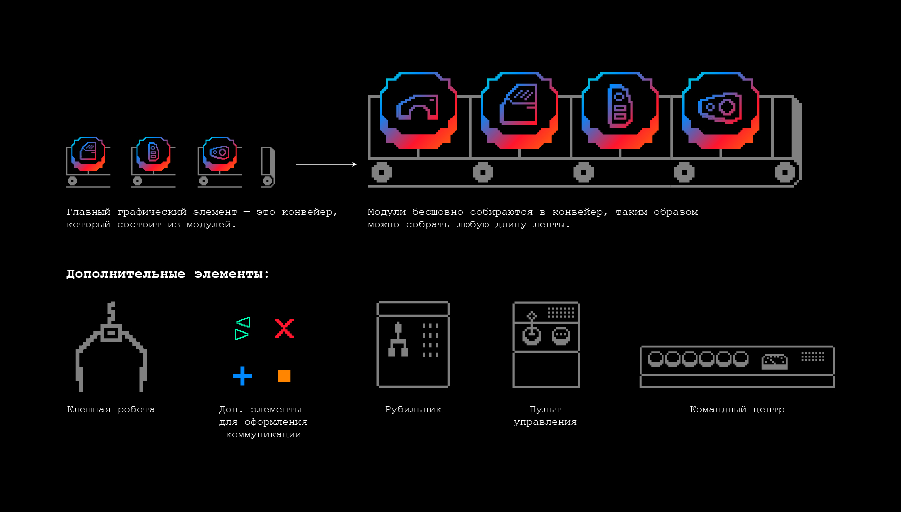 В основе образ конвейера. Это метафора того, что можно собрать самому комплектацию машины и получить долгожданную ласточку. Отсюда применения пиксельной графики — это современные технологии и внедрения игрового процесса.