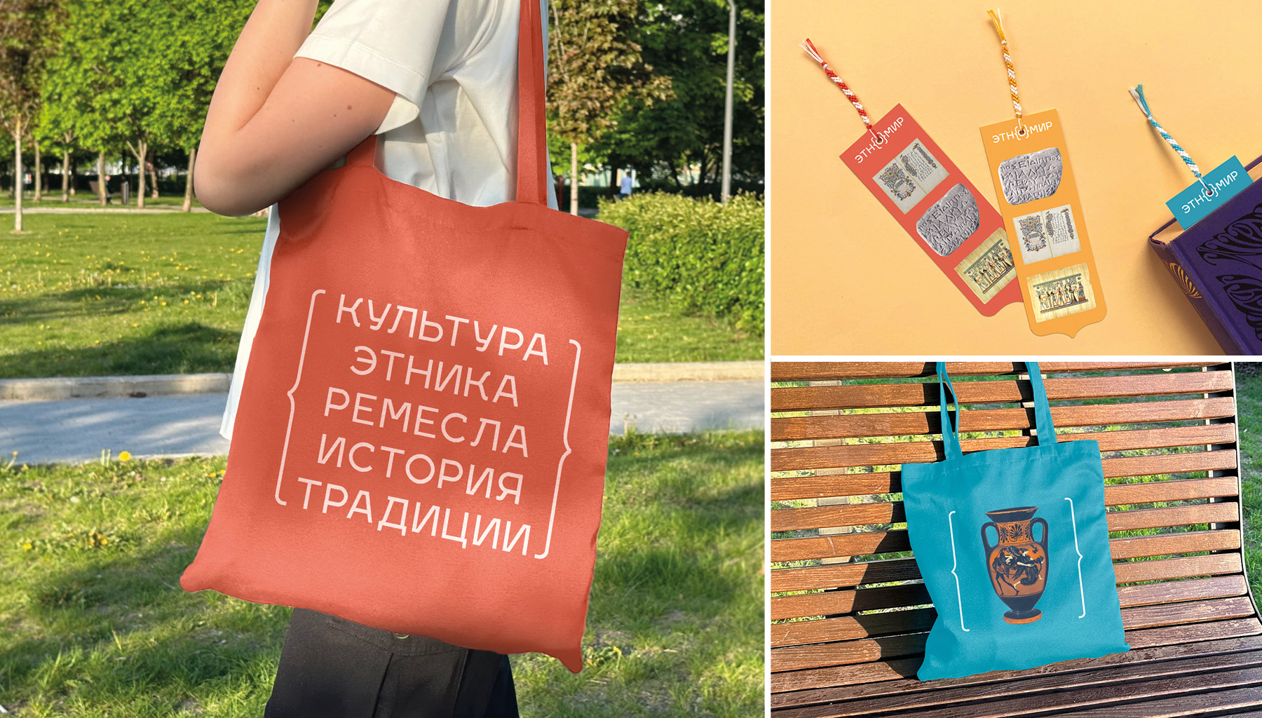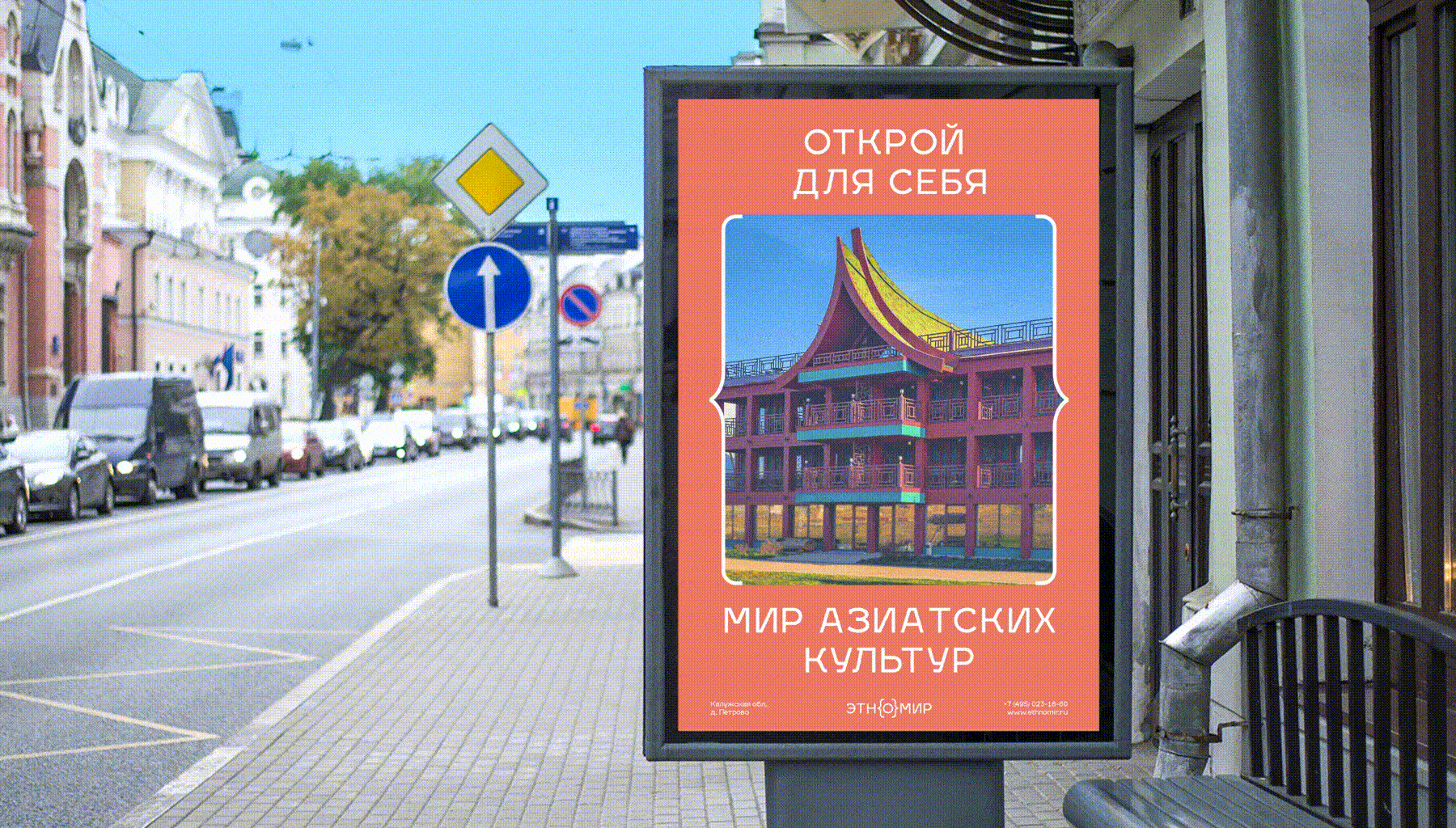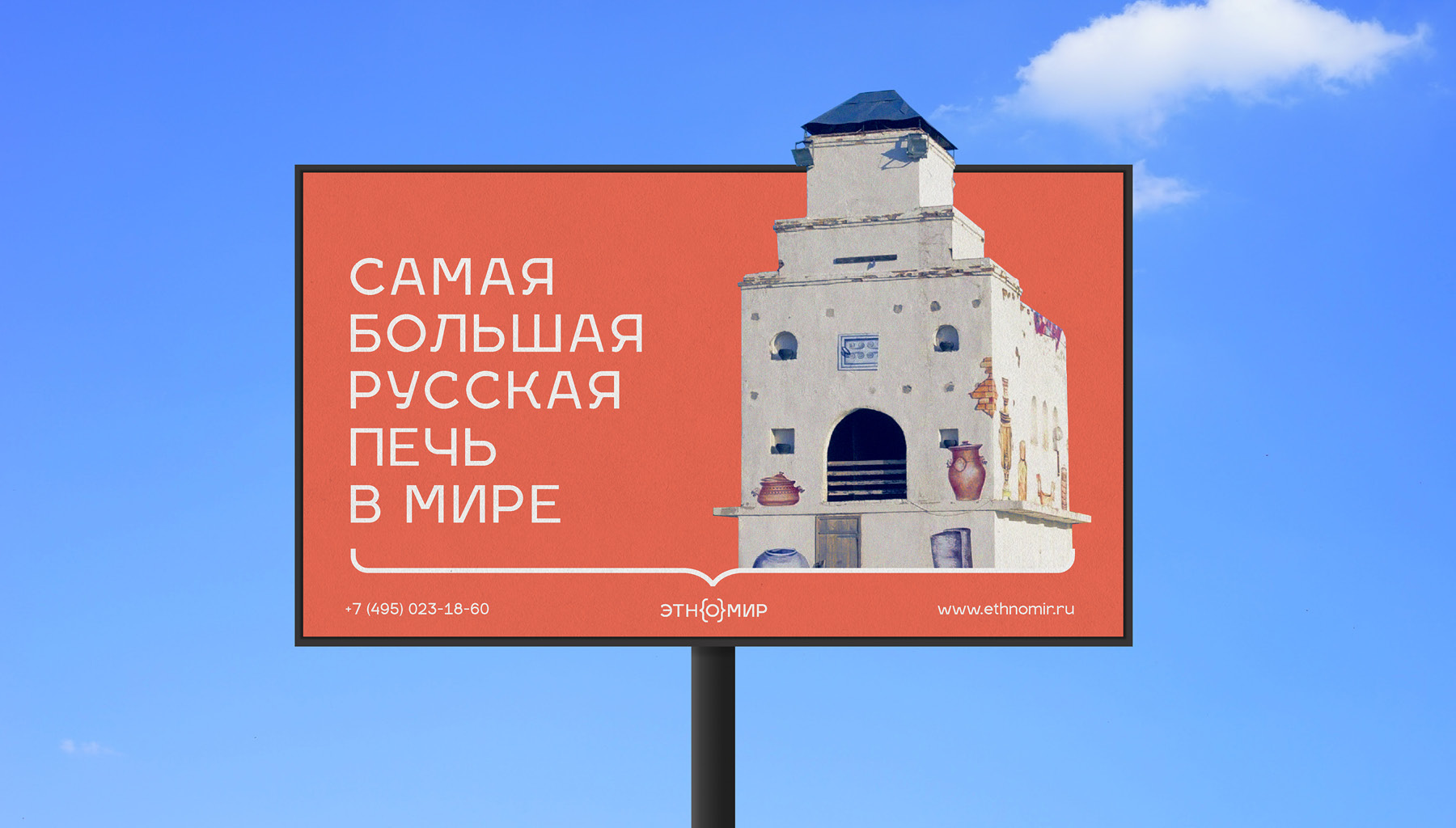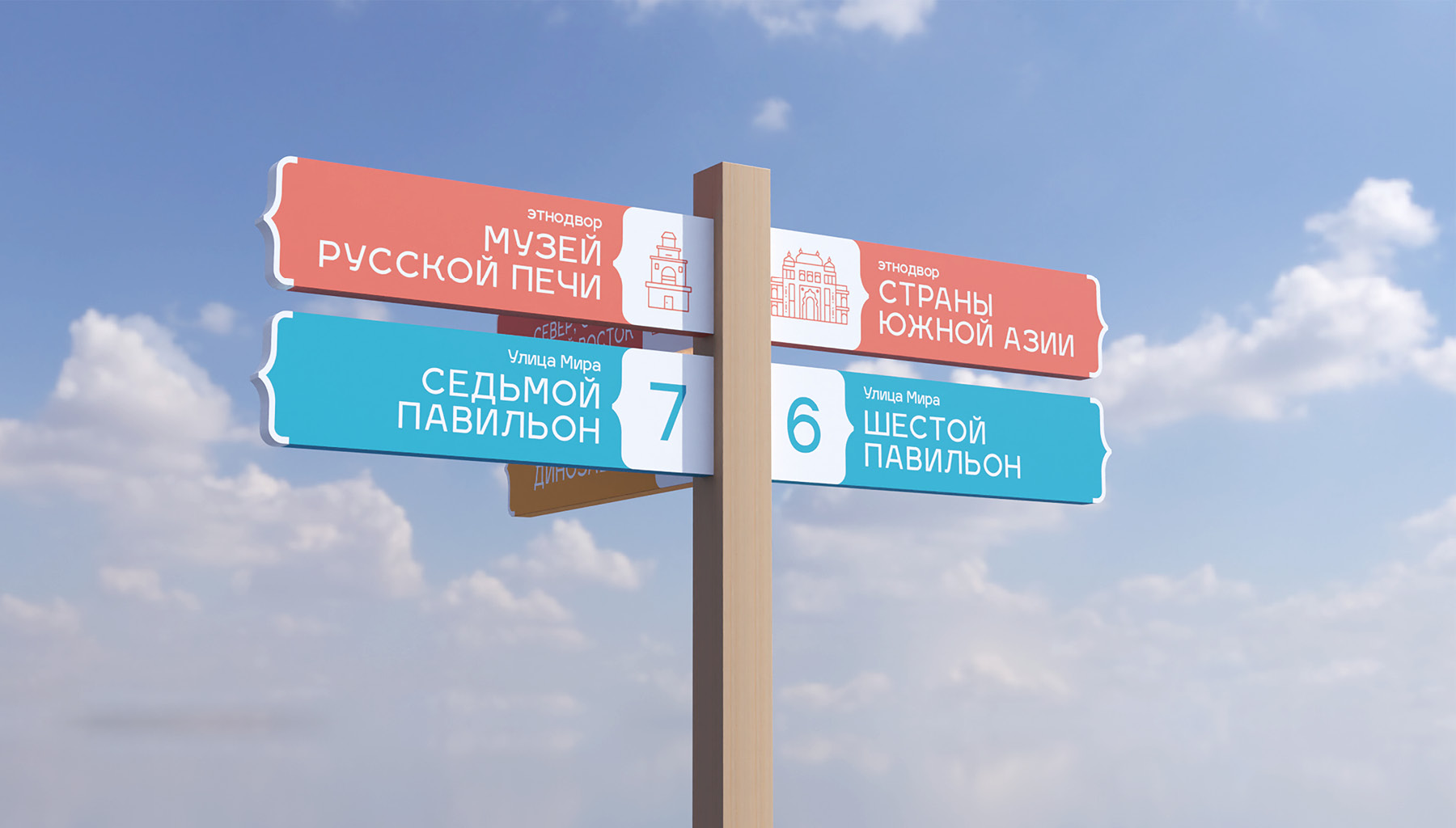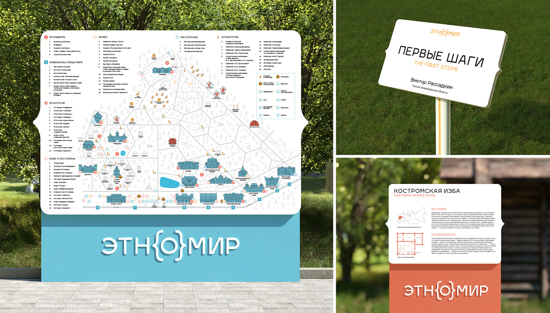 Главная особенность парка — объединение множества различных народов всего мира. И символом объединения стала фигурная скобка. Именно на ней строится вся айдентика Этномира.