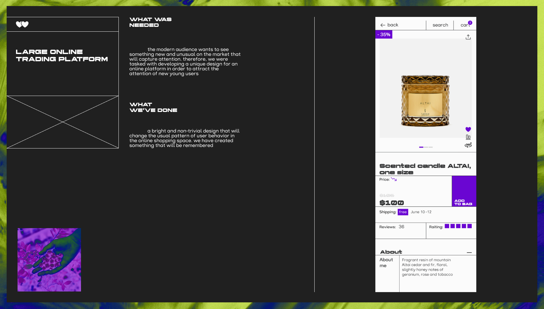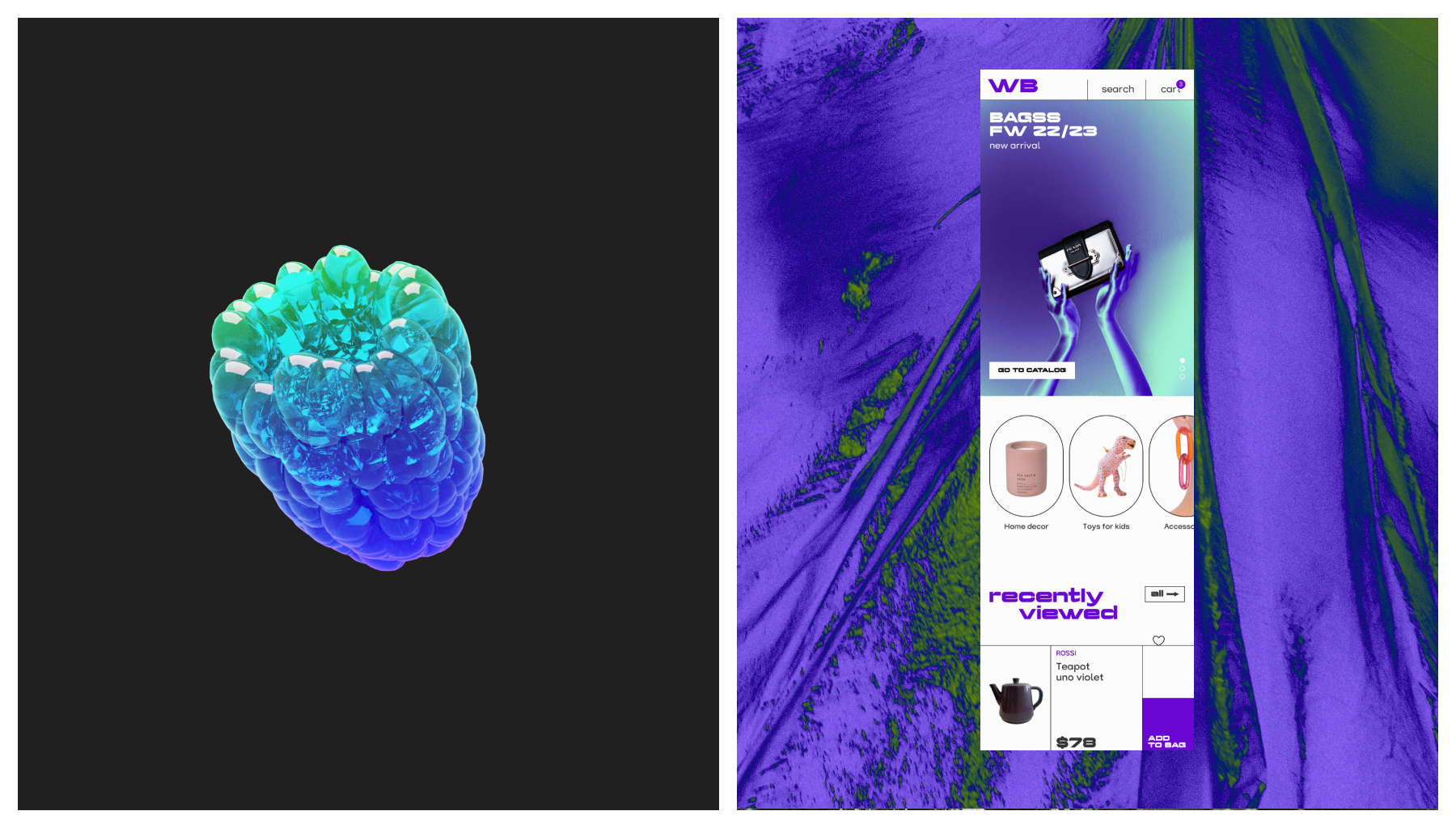 Wildberries — международная торговая площадка товаров. Работает в России, Польше, Казахстане, Армении, США, Франции и других странах. Нам захотелось сделать яркий концепт приложения и брендинга, который больше бы соответствовал названию