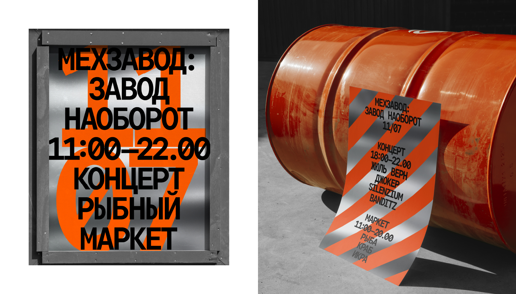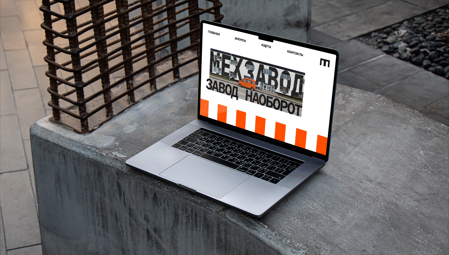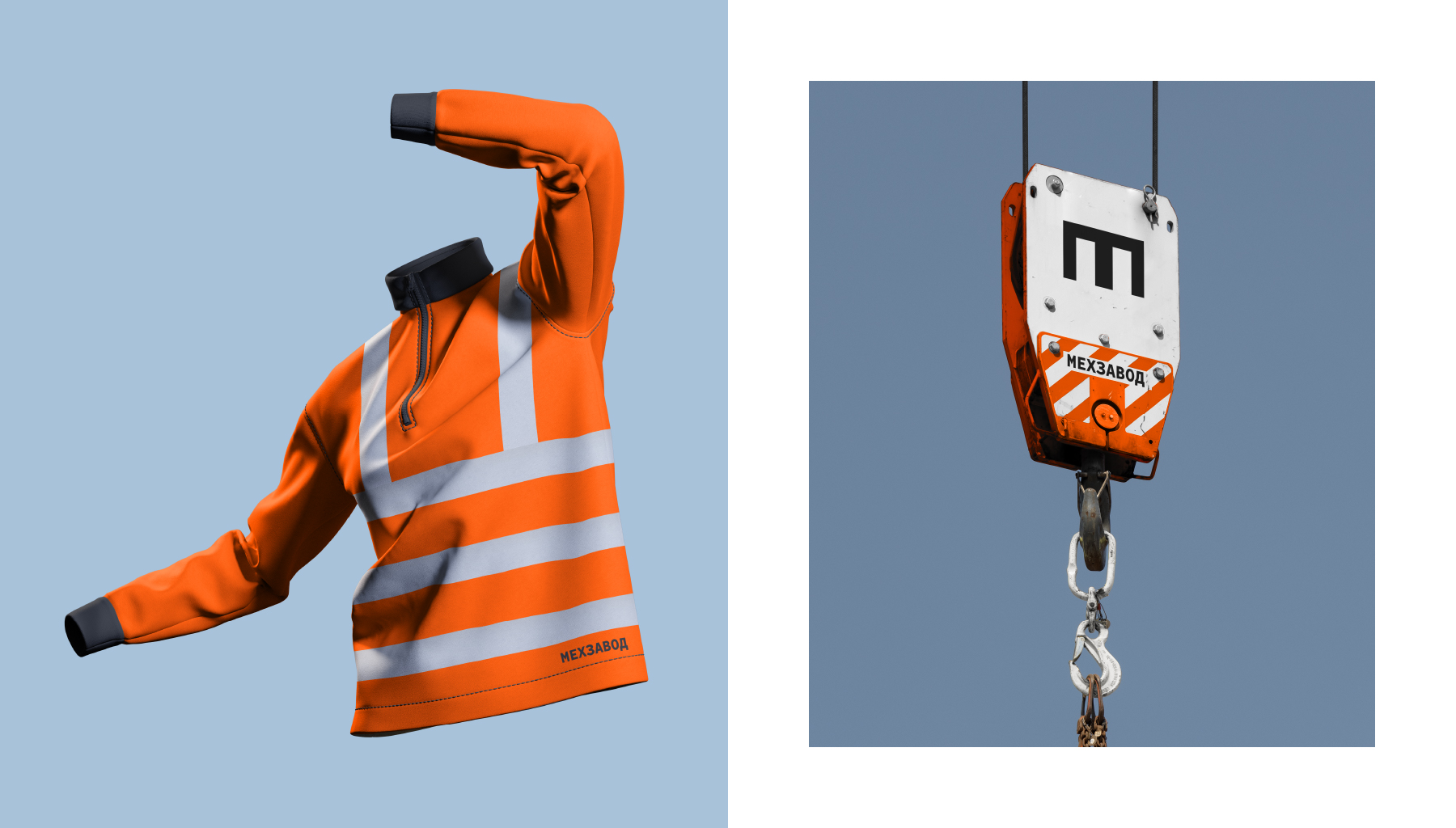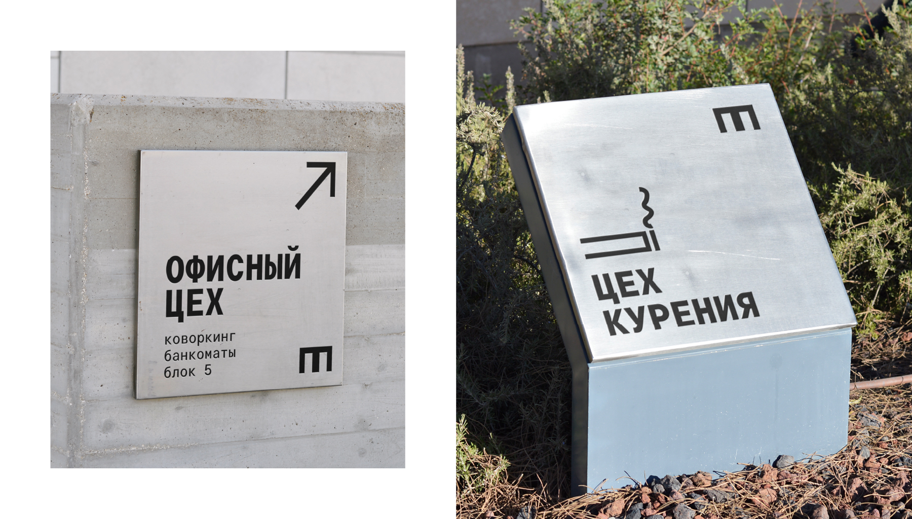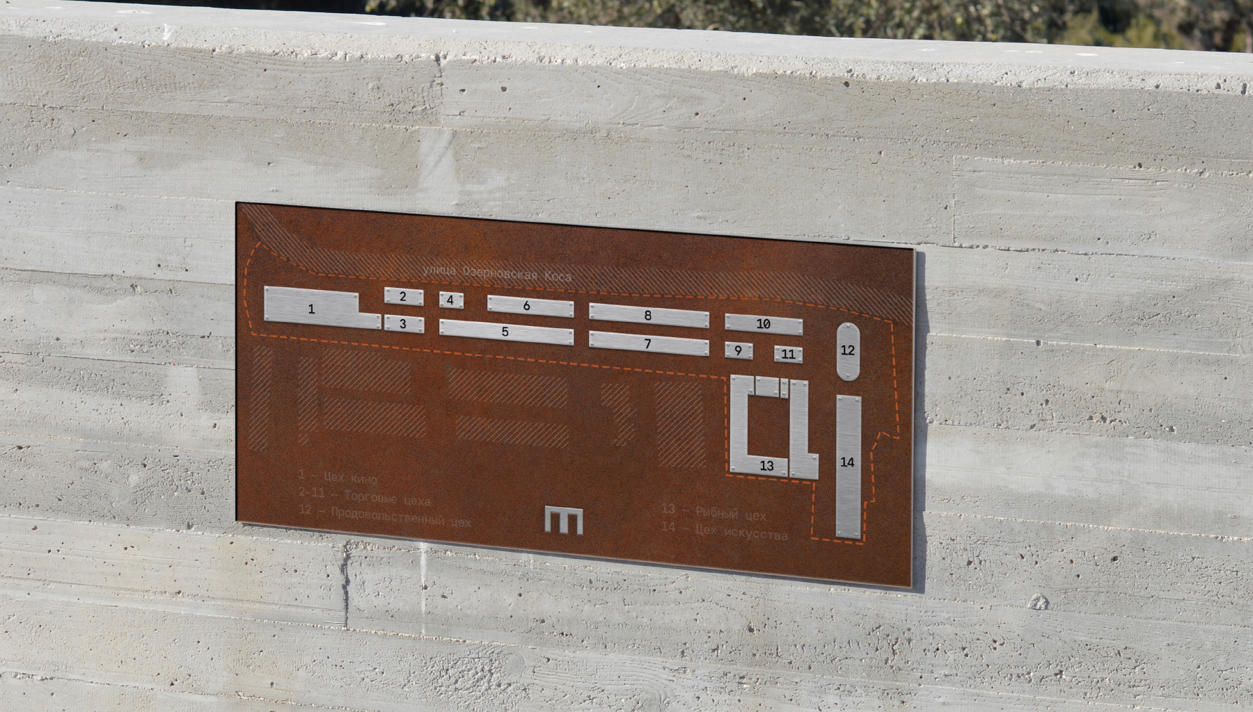 Логотип представляет собой пластину сердечника трансформатора и монограмму названия «Мехзавод», «М» она же «З» при повороте, поддерживая историю об изменении образа промышленной территории в центре города и сердцах людей. Концепция поддерживается в копирайтах-перевертышах.
