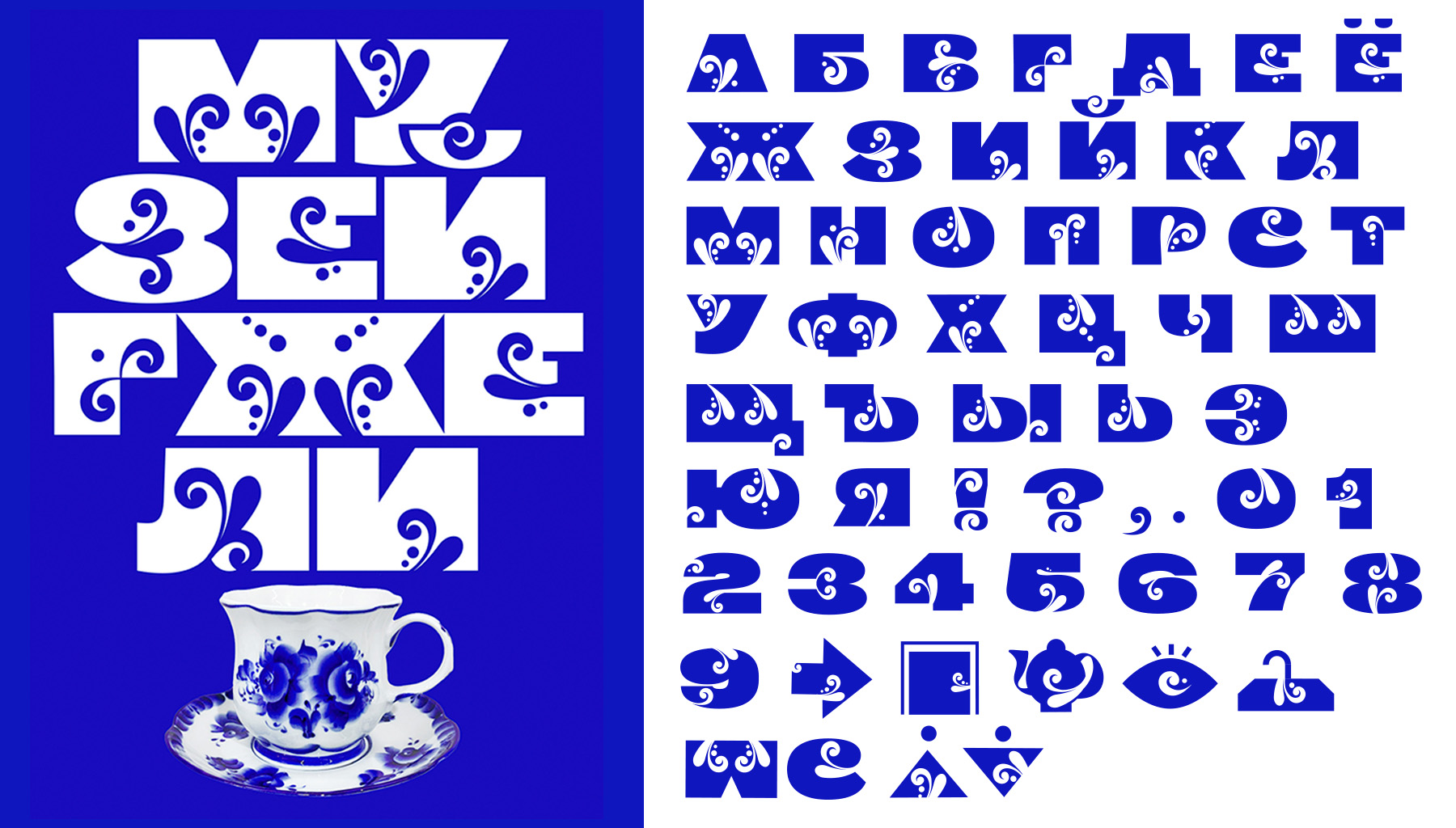Для проекта был разработан фирменный шрифт, основаный на слиянии керамического бруска и изящного гжельского орнамента.