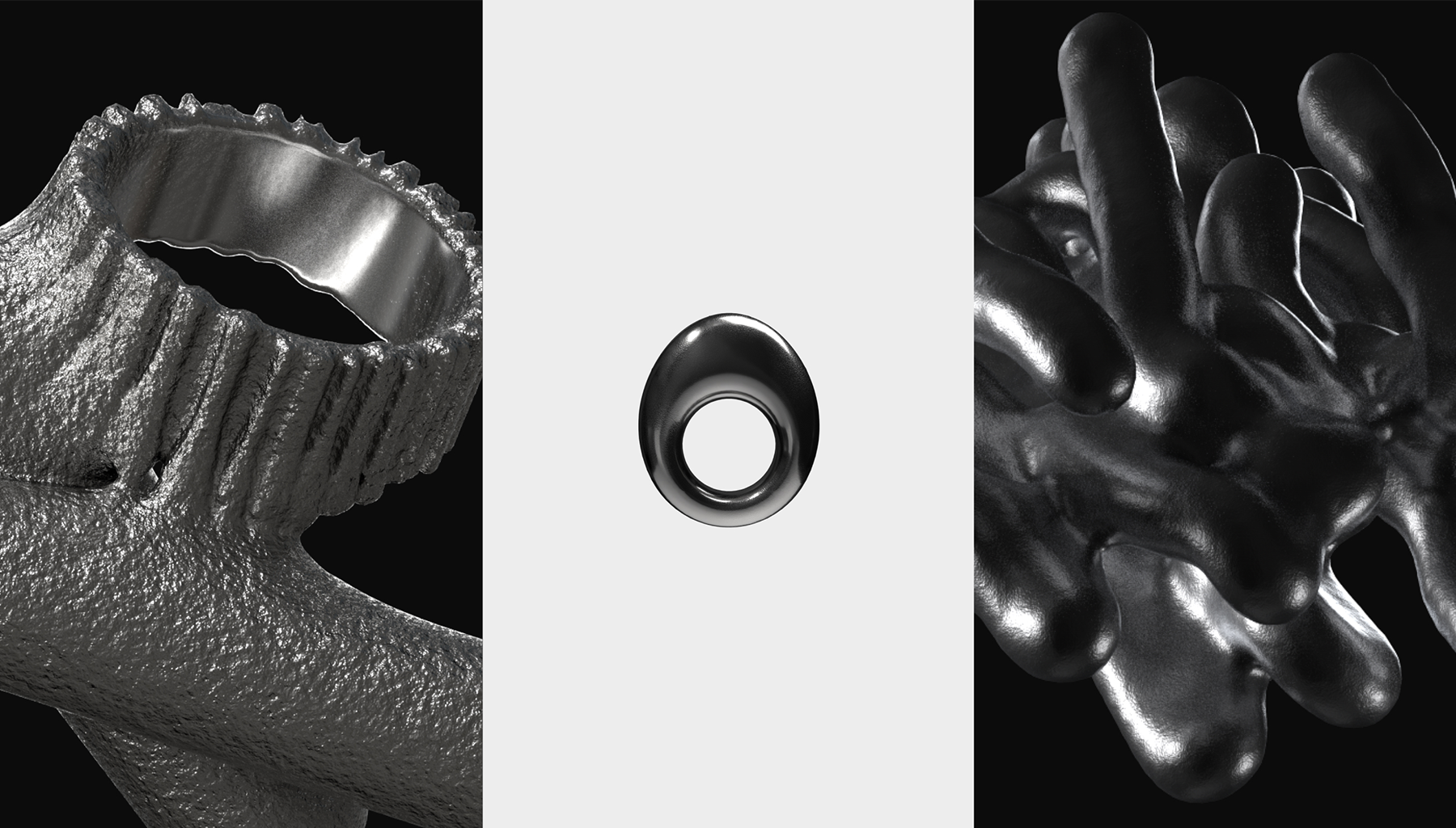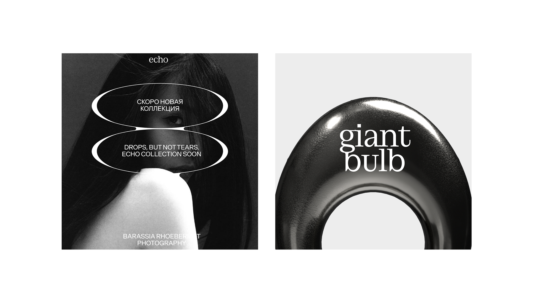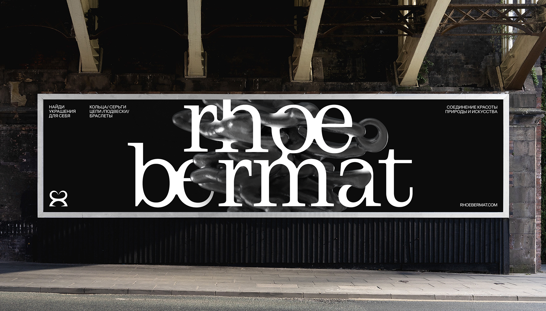 в единый «сплав», из которого создаются украшения. Все формы в айдентике стремятся к объединению и сливанию: Логотип состоит из первых букв названия бренда (R и B), сплавленных друг с другом, 3д графика сливается с типографикой, слитые овальные шейпы создают контейнеры для текста и так далее. Во многом идея подчеркнута и способом производства украшений — большинство из них созданы с помощью ювелирного литья.
