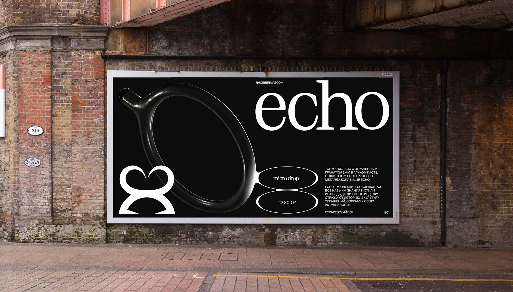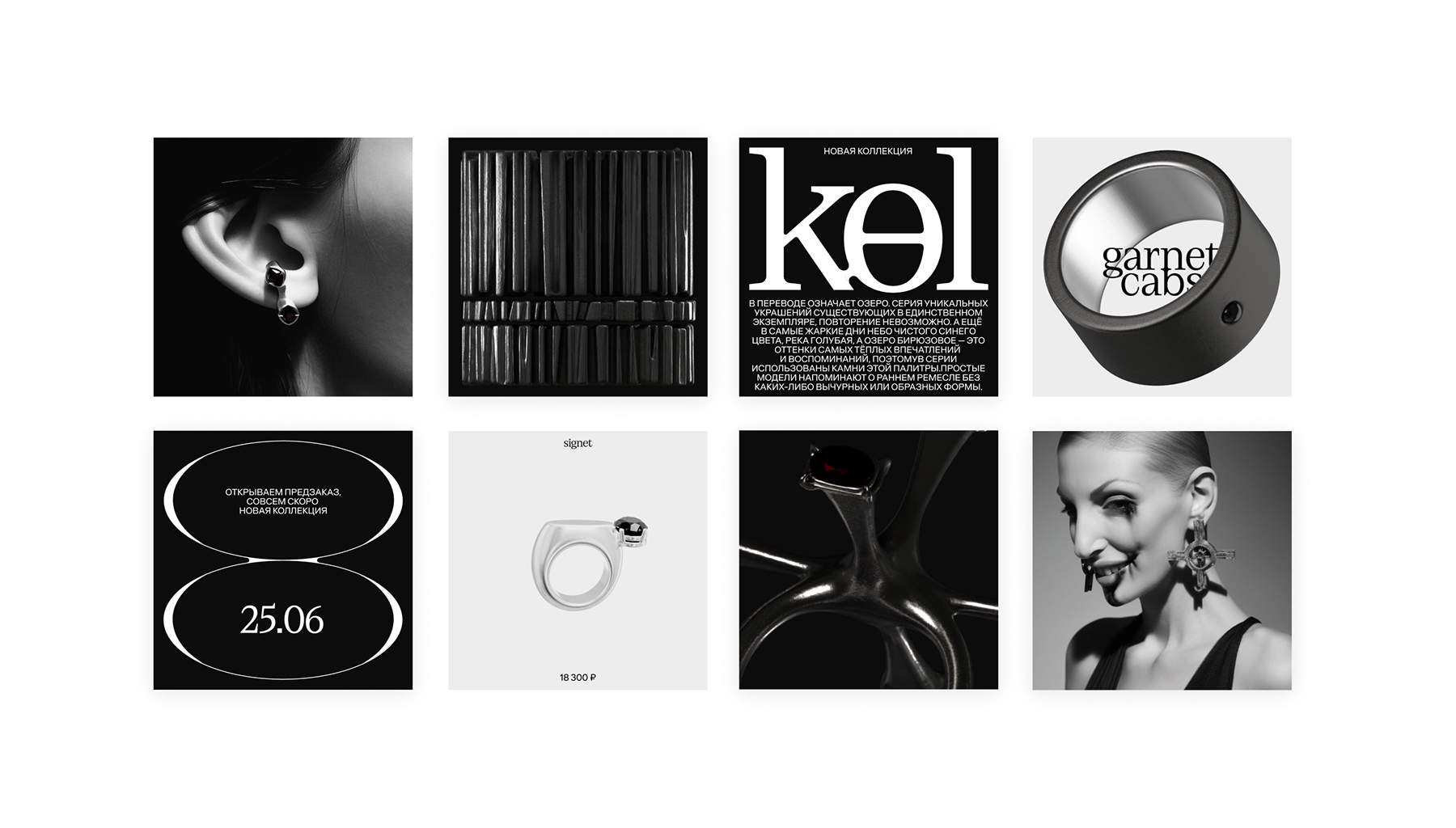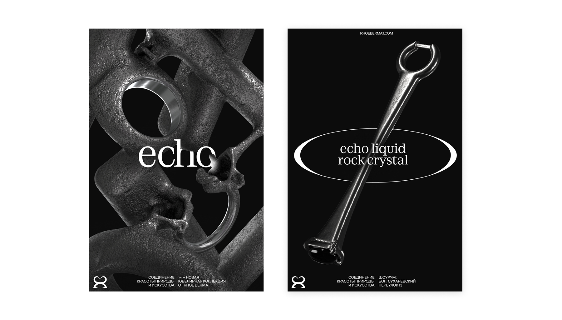 Rhoe Bermat насчитывает 6 коллекций: ALI, ECHO, INFINITY, KӨL', PEAK и KAGAN. Главной задачей фирменного стиля было сохранить акцент на них , и уже через то, как показаны ювелирные украшения, проявлять тон оф войс всего бренда. Поэтому важнейшей функциональной частью айдентики является 3д графика. Она разделена на 3 составных части: 3д модели украшений, силуэты слившихся украшений и полностью абстрактные формы из расплавленного металла.