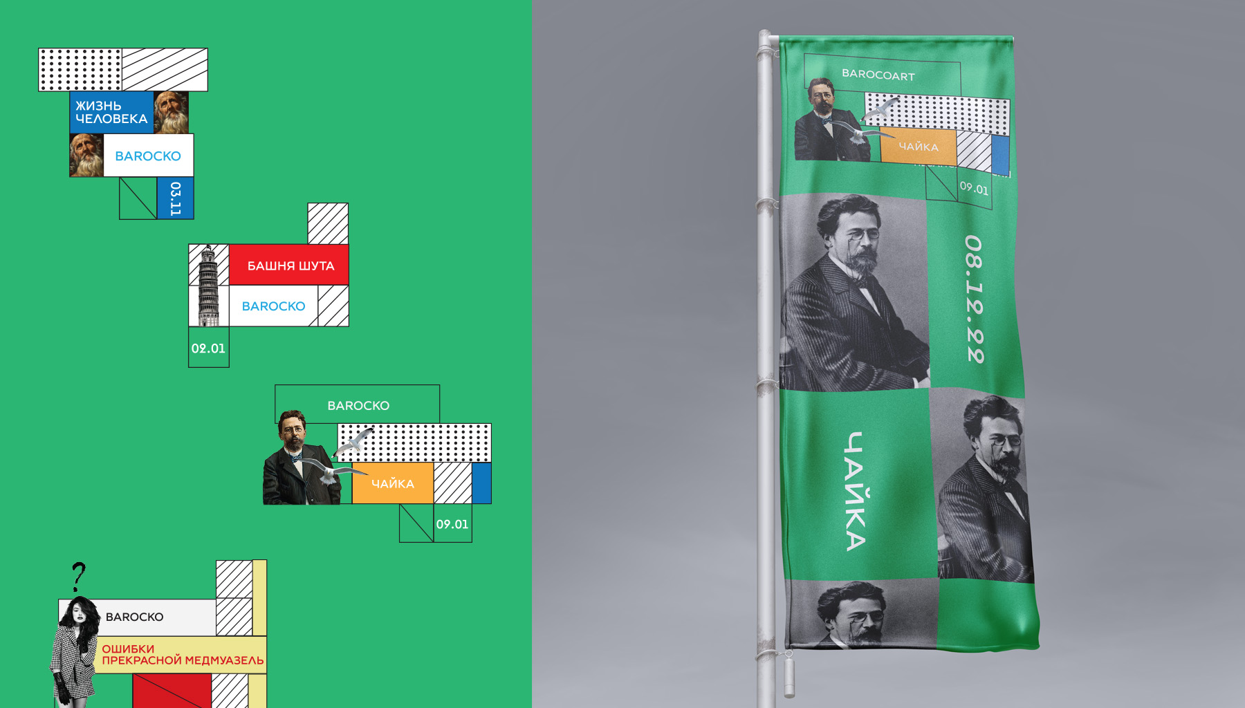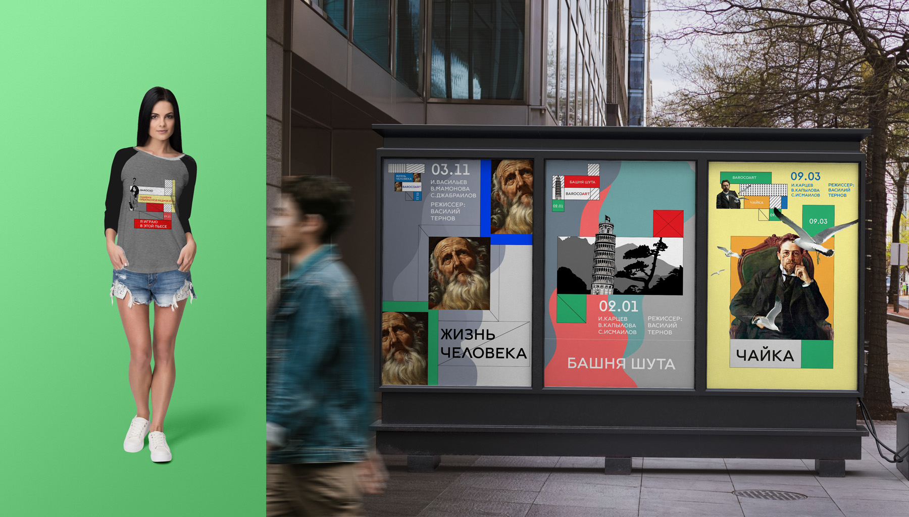 Создание айдентики для театра небольшой труппы. Главным условиям было выделить "Барокоарт"