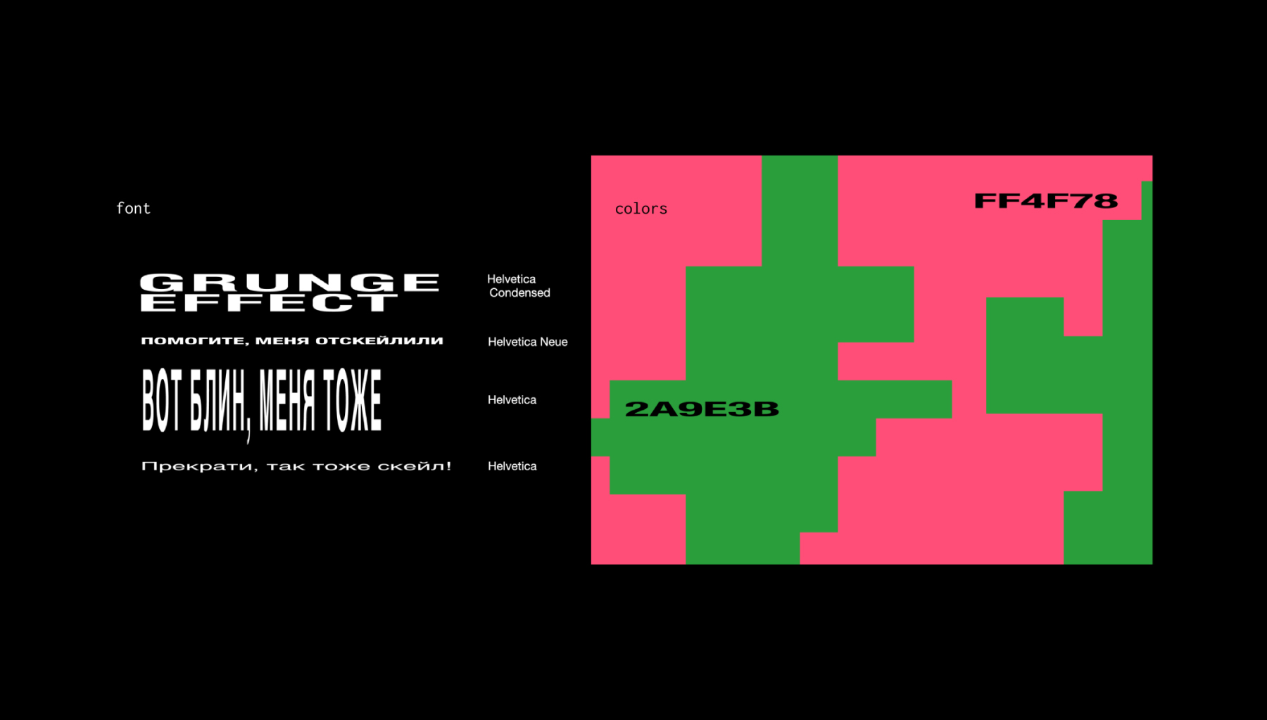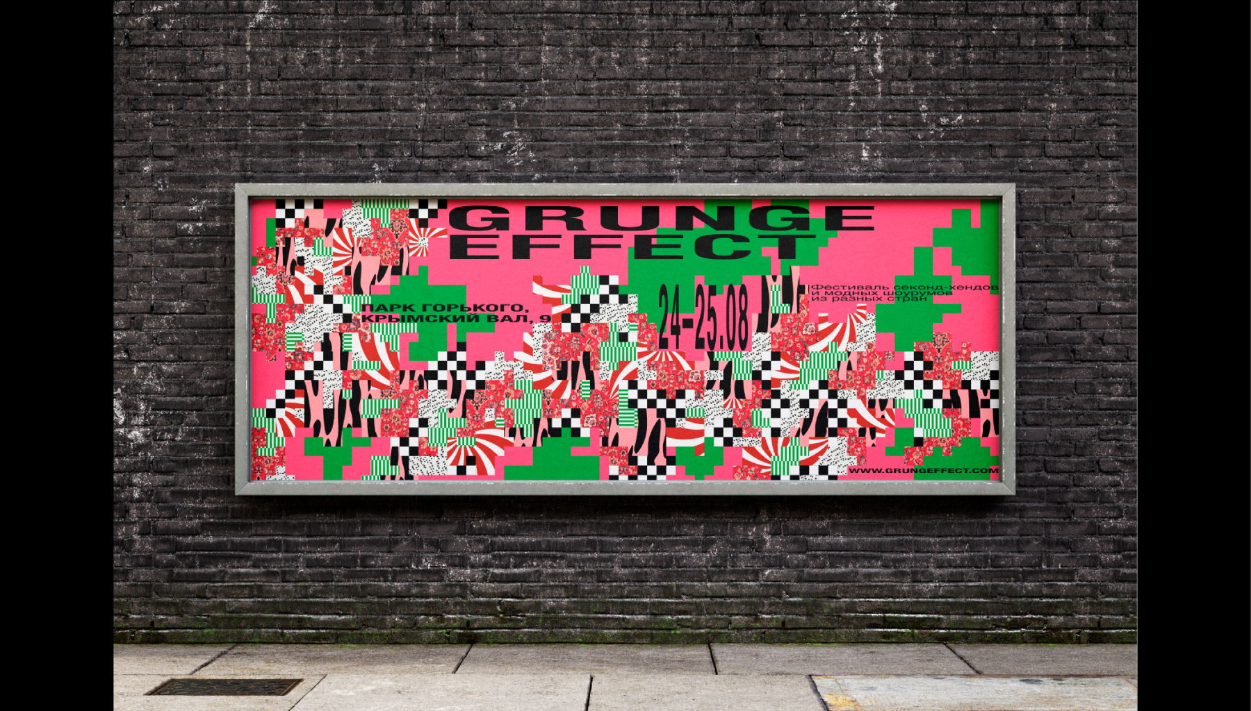 После исследований, проведенных в рамках проекта и поиска вдохновения, было принято решение использовать в дизайне яркие сочные цвета, добавить пиксельных элементов, которые являются отсылкой к китчу, создать паттерновое полотно, которое напоминает лоскутки и тем самым связывает нас с темой одежды, все это приправить отскейленной гельветикой, добавляя хулиганства этой истории. Все вместе это очень точно передает саму атмосферу фестиваля, с креативной средой и гранжевым эффектом.