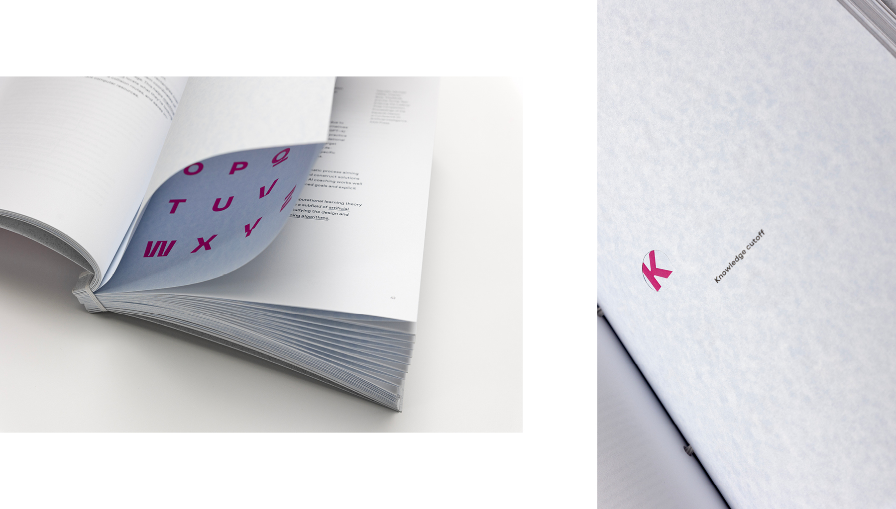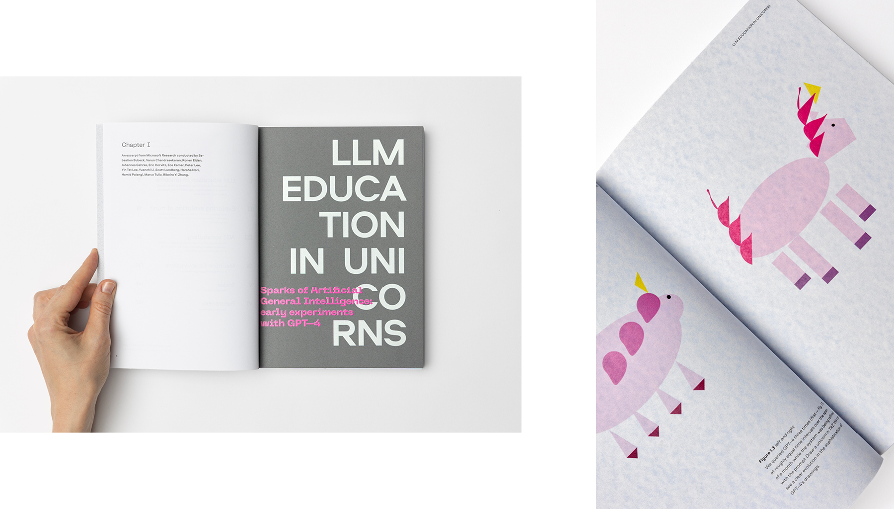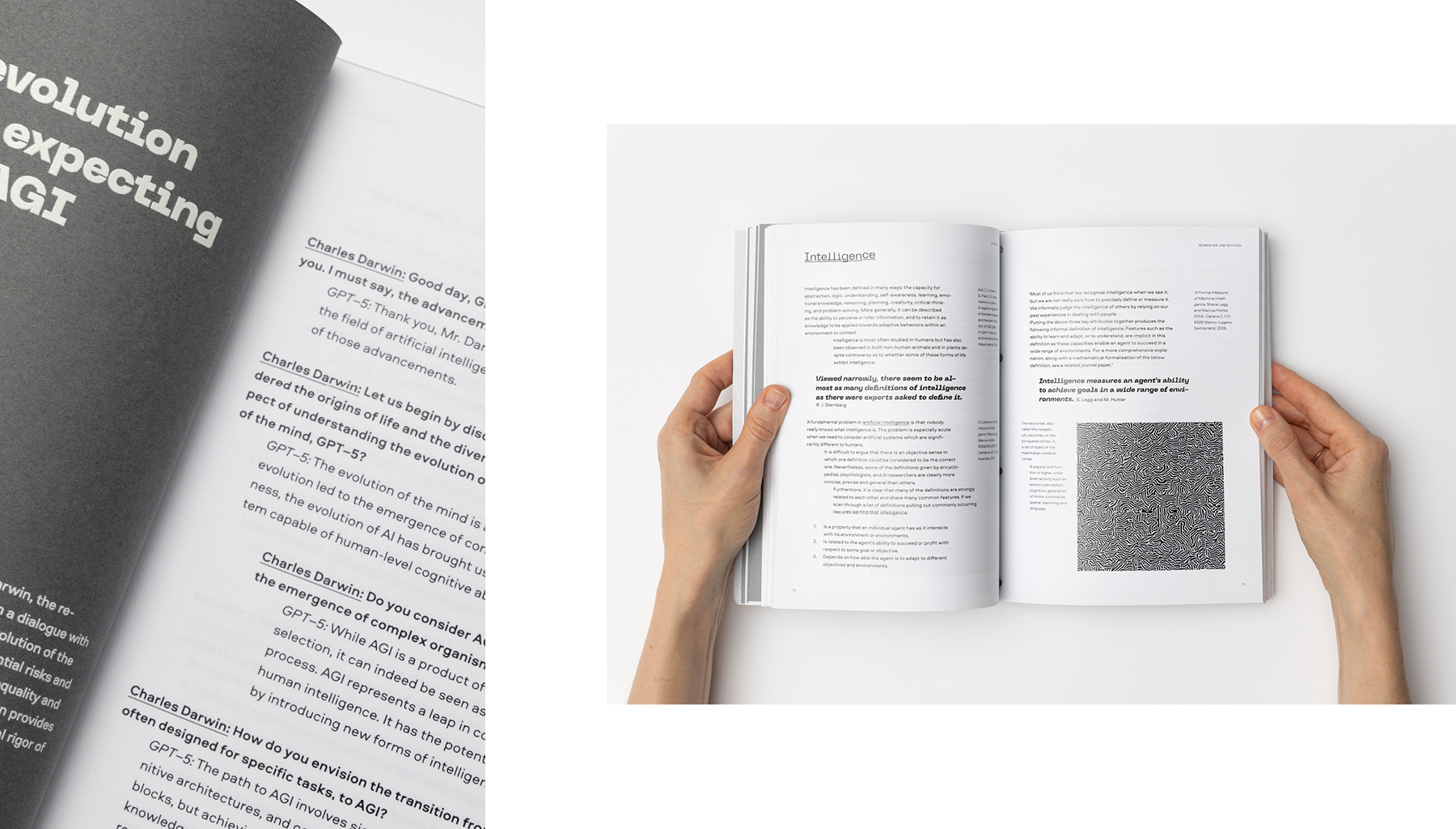 Набор текста в структуре чата имитирует голос машины. Динамика абзацев становится ключевым принципом макета: гибкая сетка позволяет разворотам вести себя свободнее или сдержаннее от страницы к странице, отражая естественные колебания, которые испытывают все живые существа изо дня в день. Смещения базовой линии — случайные отклонения от строгого порядка — также указывают на живое в машинном.
