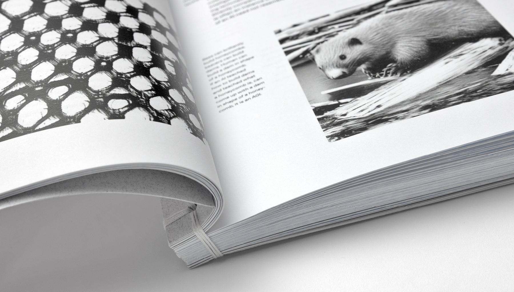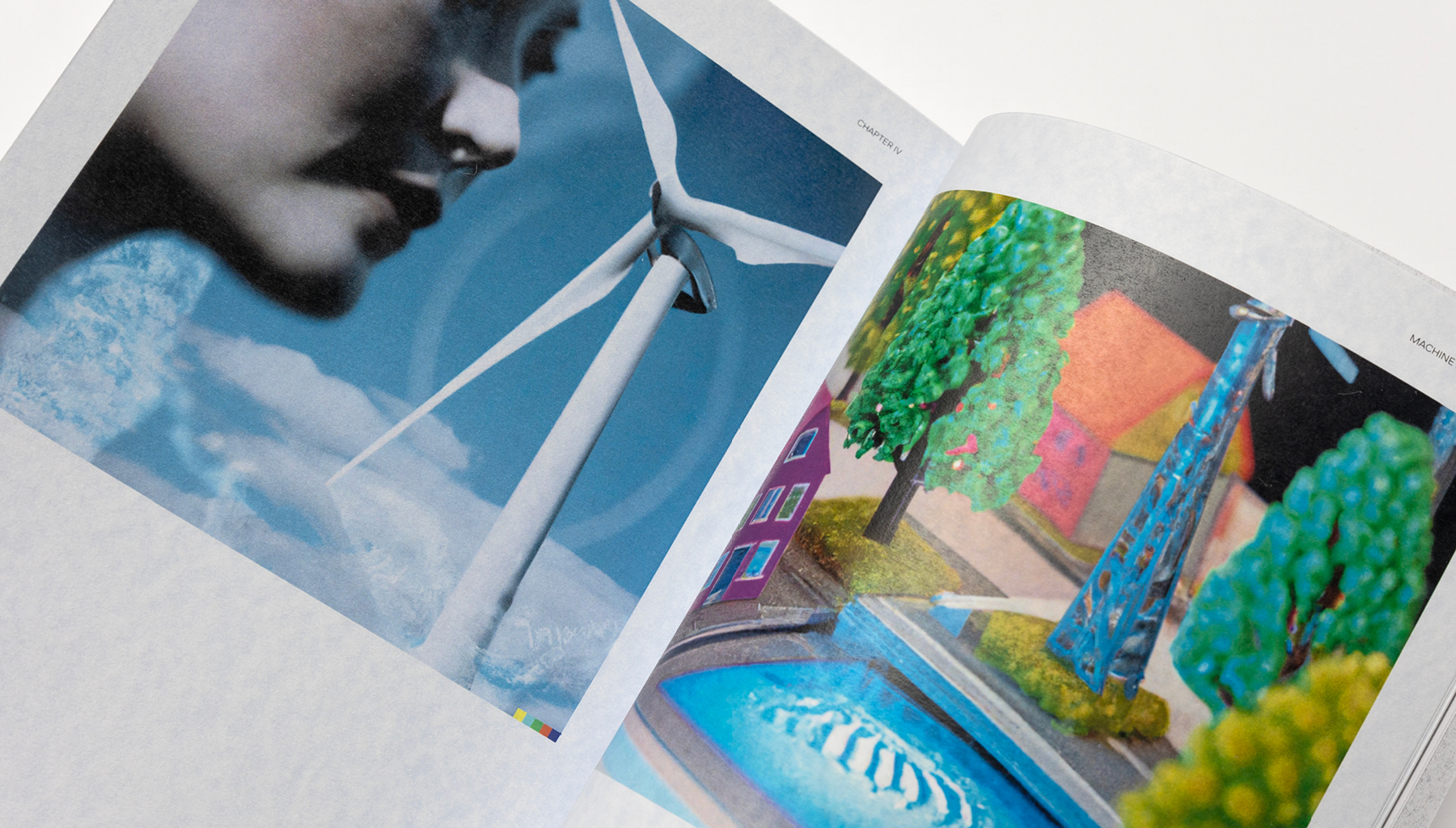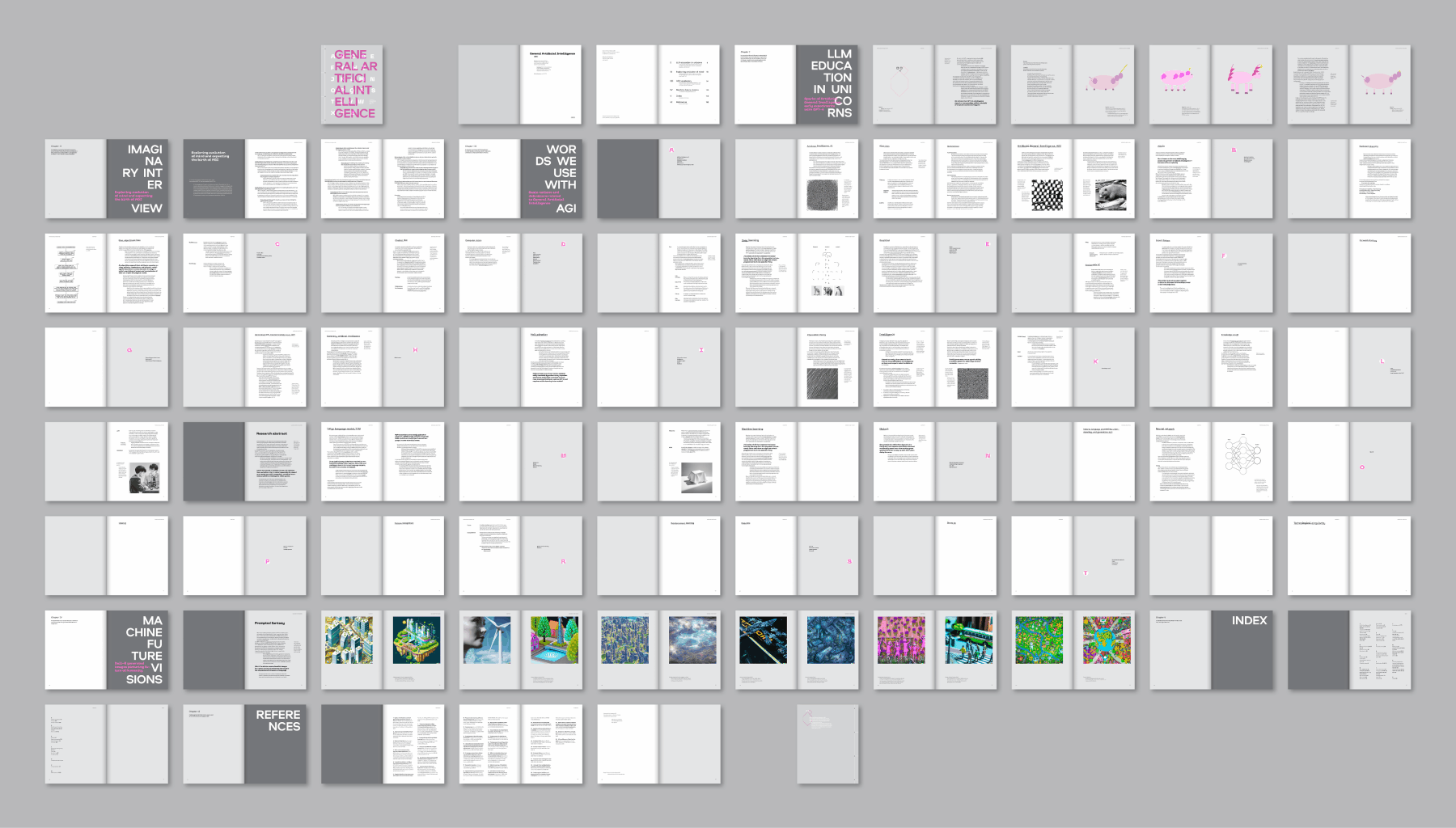 Набор текста в структуре чата имитирует голос машины. Динамика абзацев становится ключевым принципом макета: гибкая сетка позволяет разворотам вести себя свободнее или сдержаннее от страницы к странице, отражая естественные колебания, которые испытывают все живые существа изо дня в день. Смещения базовой линии — случайные отклонения от строгого порядка — также указывают на живое в машинном.