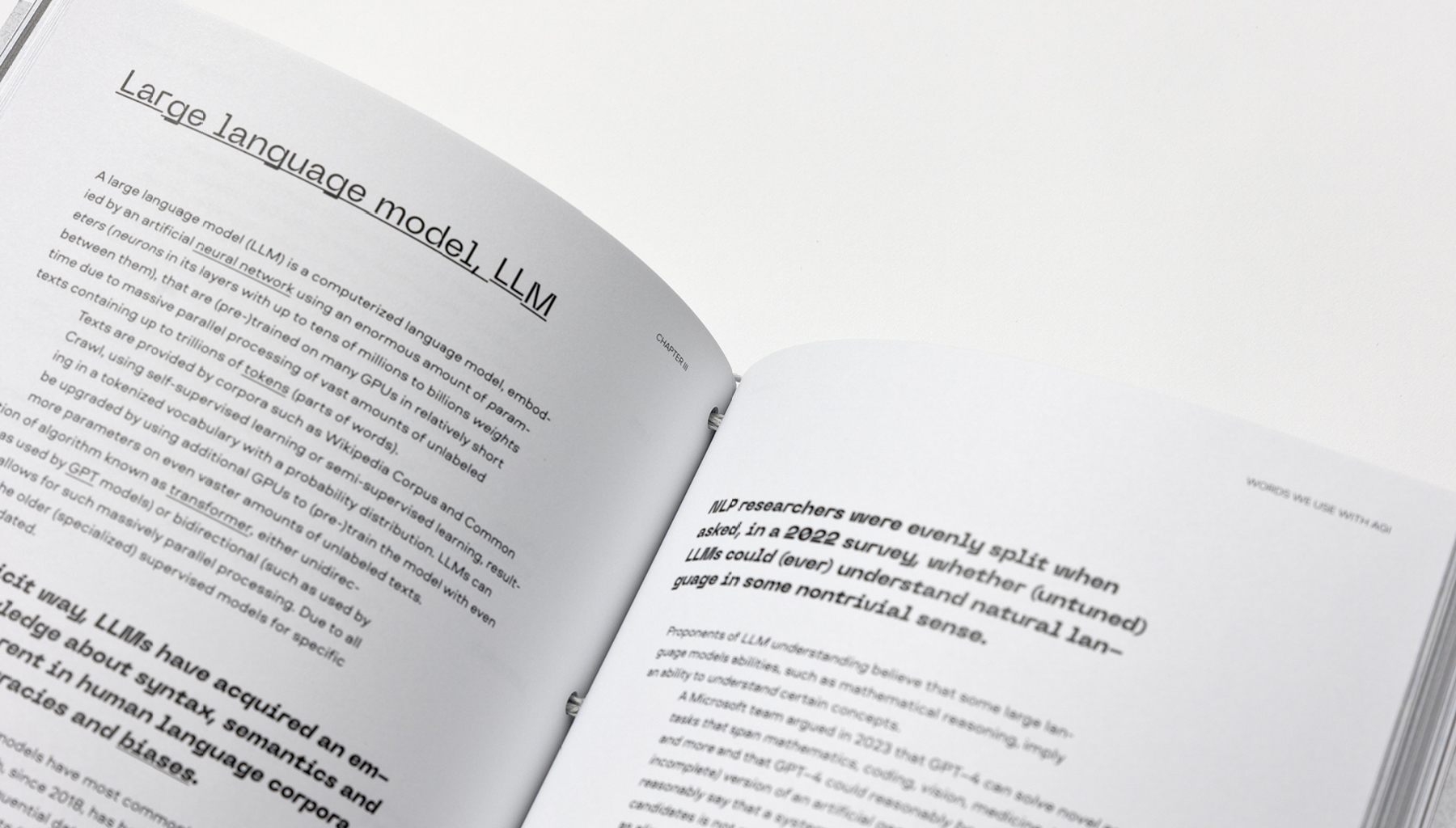 Японский переплет позволяет дополнять книгу новыми страницами — сегодня словарь AGI только появляется. Ручная сборка отражает надежду на будущее, в котором люди и машины будут внимательны и добры друг к другу.