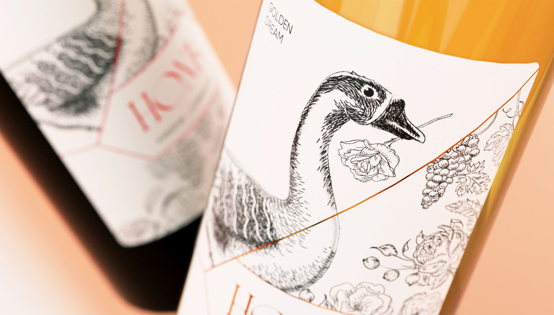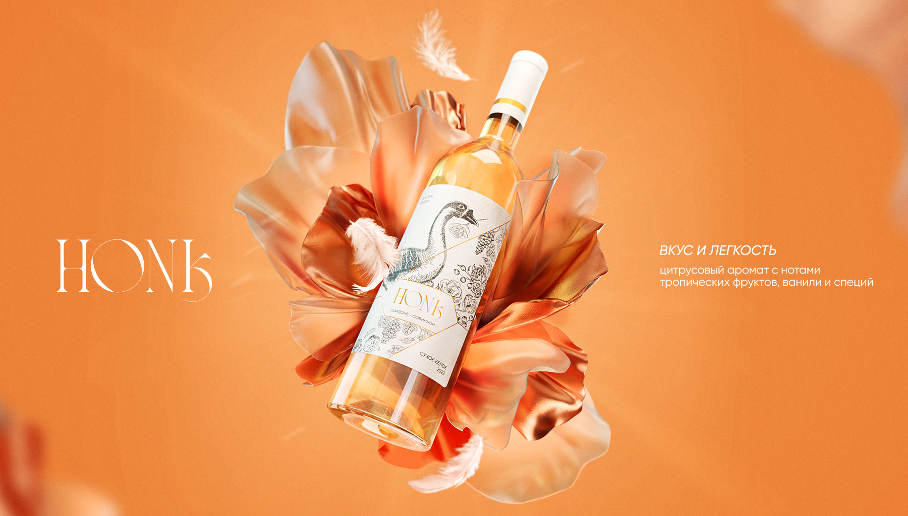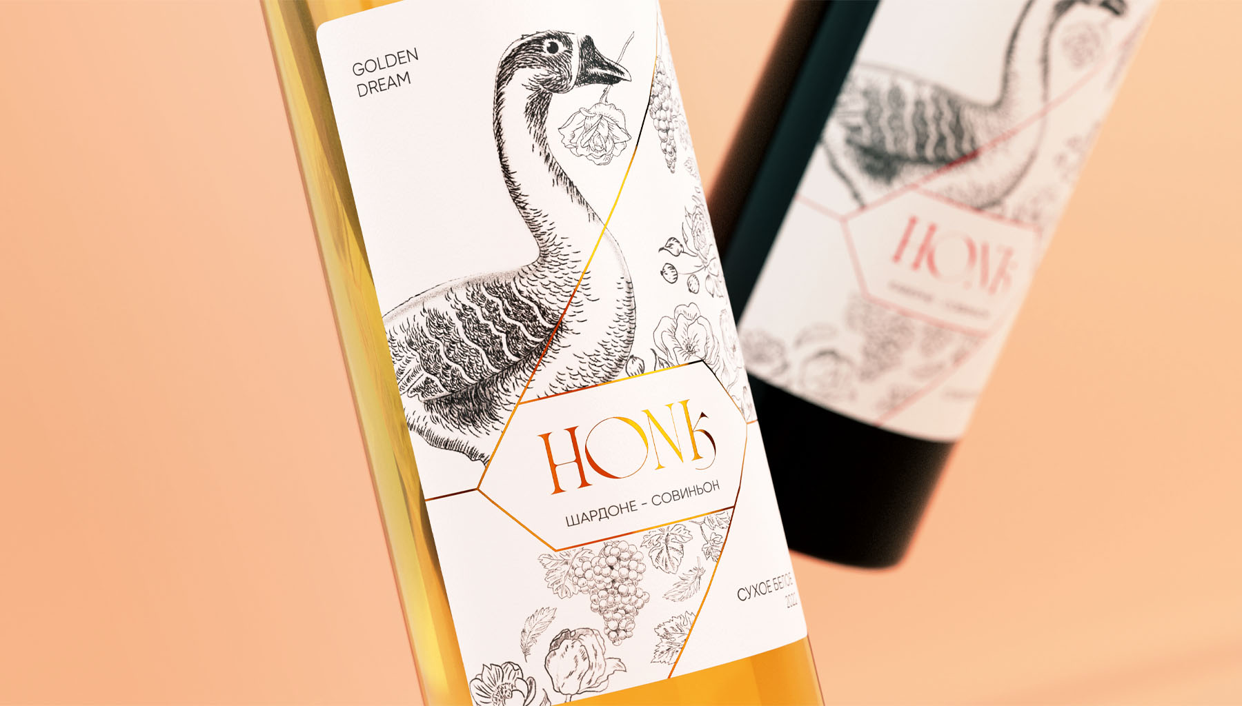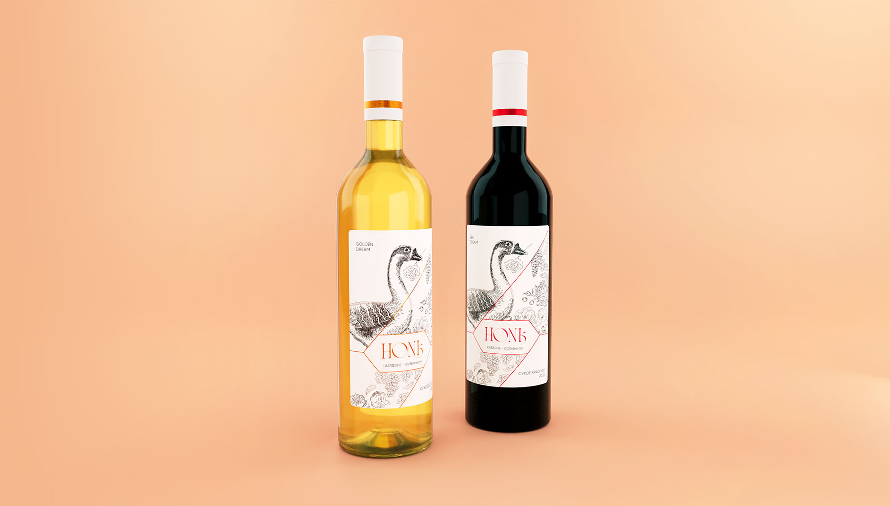 Honk - молодой бренд вина с характерным маскотом. На фоне "строгих" конкурентов, бренд выделяется легким и чистым дизайном. Благодаря кокетливому маскоту на этикетке, вино сможет запомниться многим. Даже не помня названия вина, его с легкостью можно описать - "Возьми того белого вина, там на этикетке был гусь!".