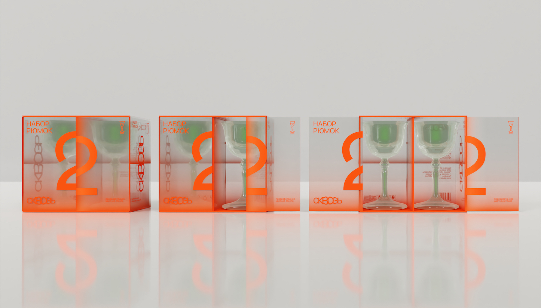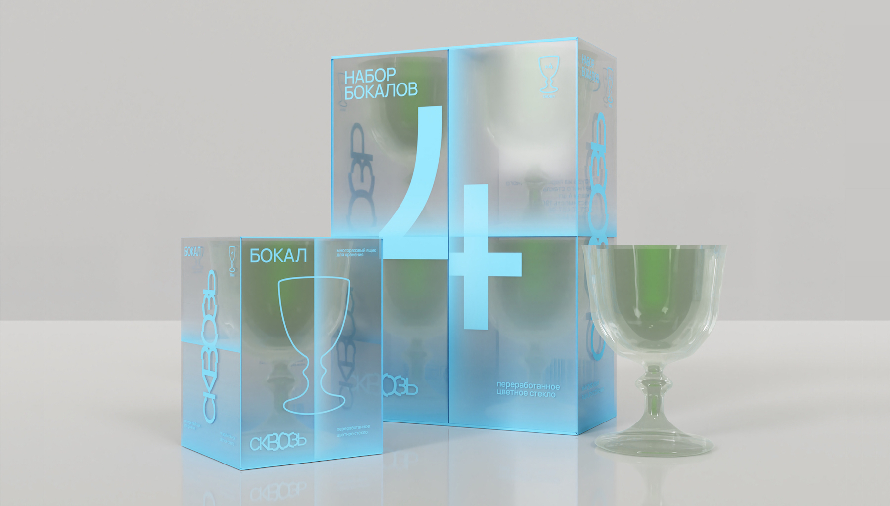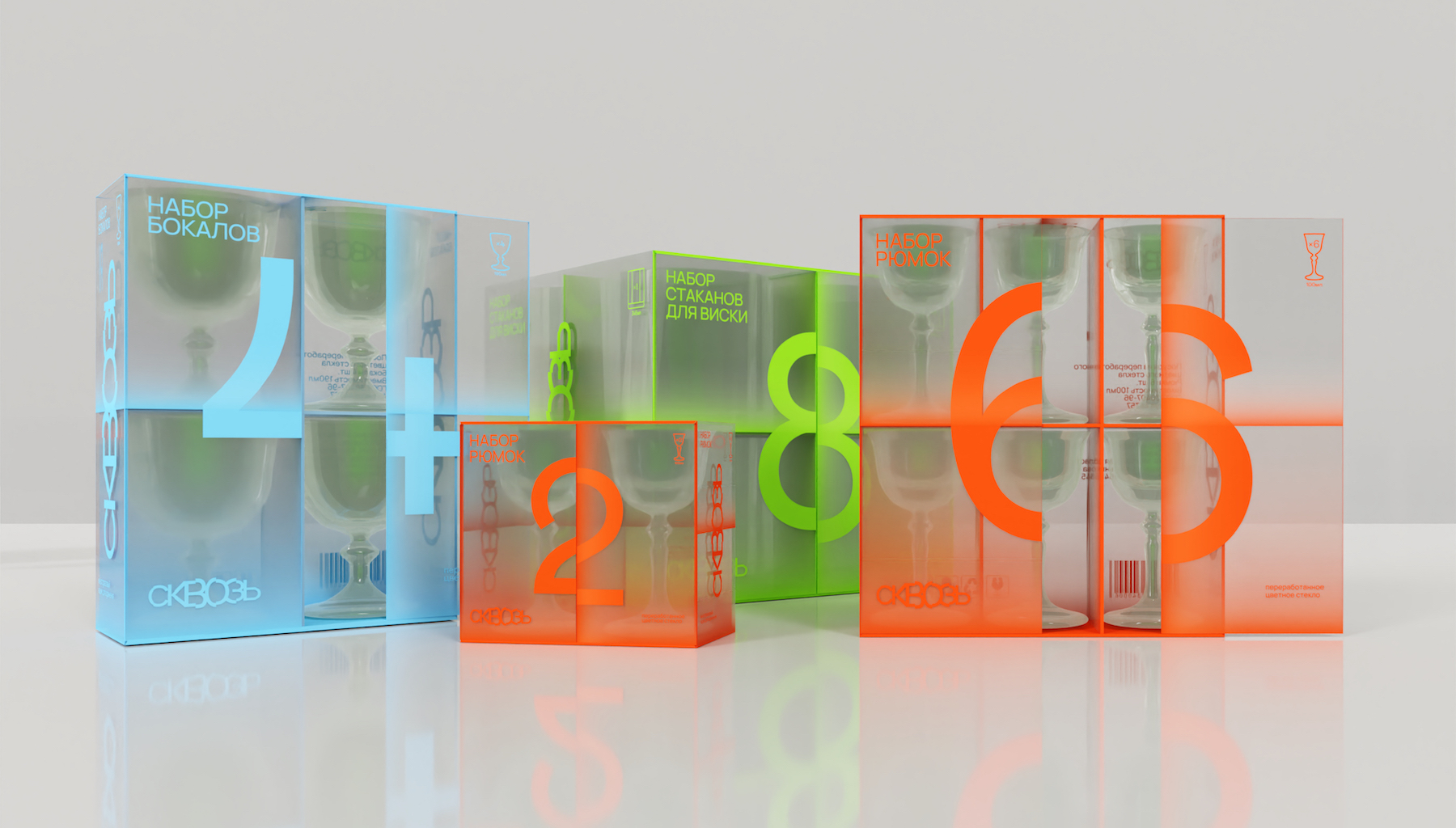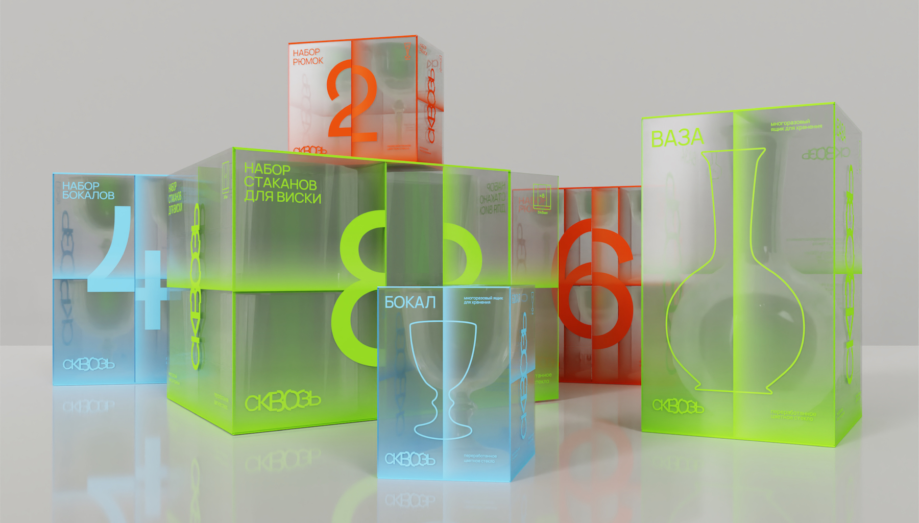 Сквозь – бренд посуды и предметов быта из переработанного стекла. Упаковка посуды разработана исходя из концепции и сущности бренда – слияния красоты и разумного потребления.