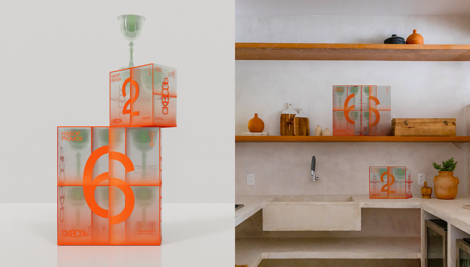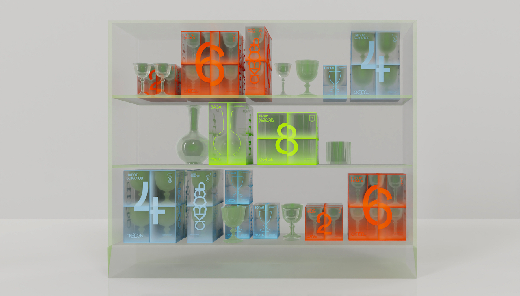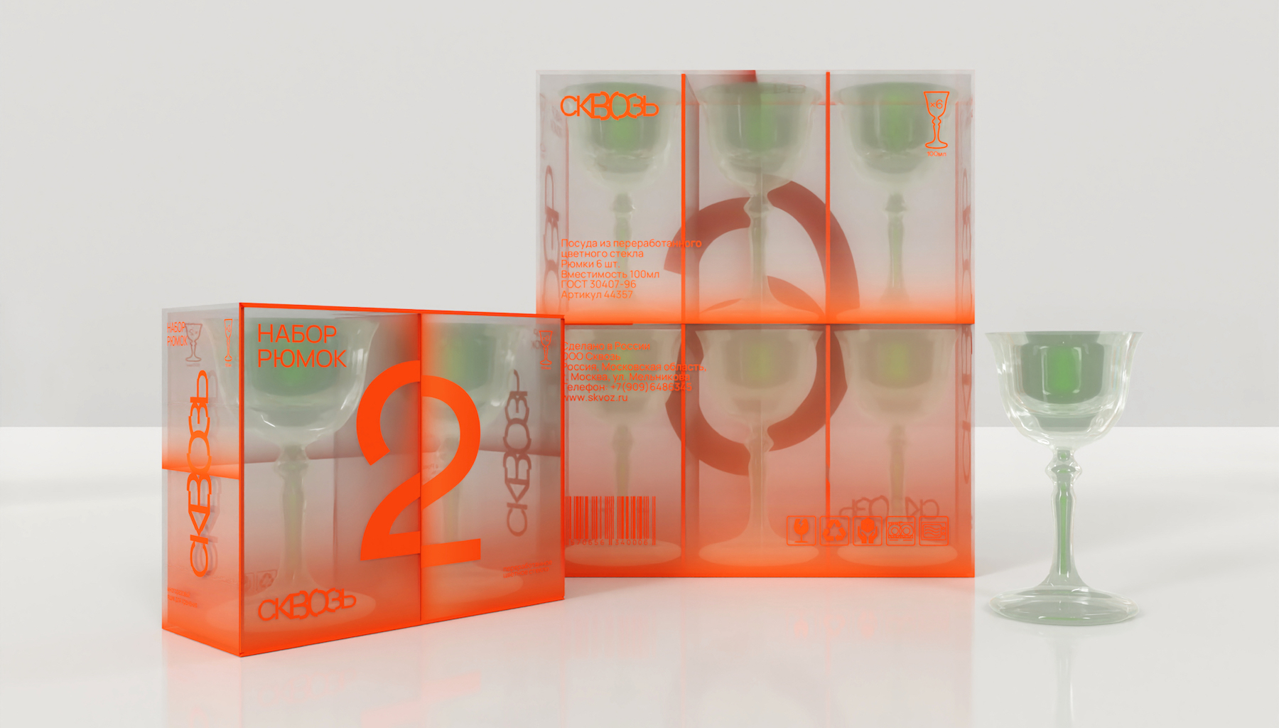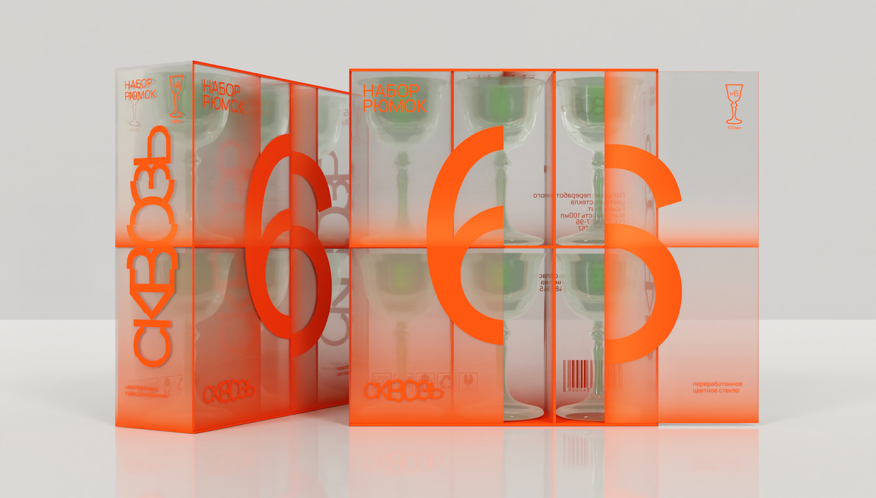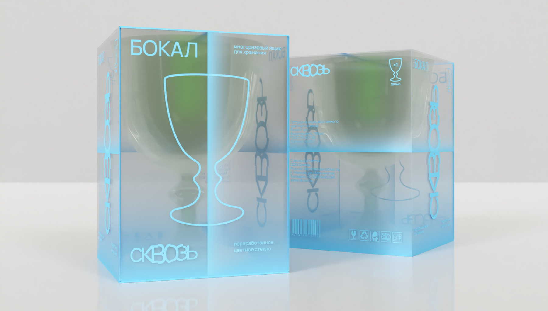 Сквозь – бренд посуды и предметов быта из переработанного стекла. Упаковка посуды разработана исходя из концепции и сущности бренда – слияния красоты и разумного потребления.