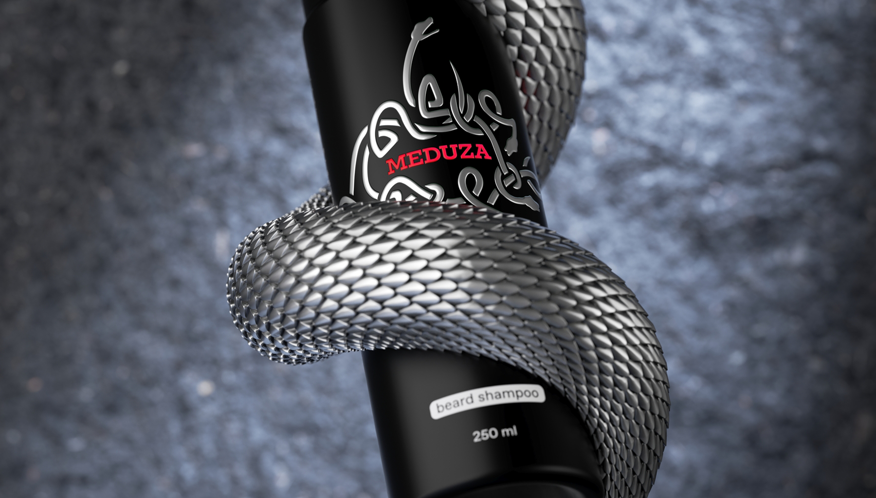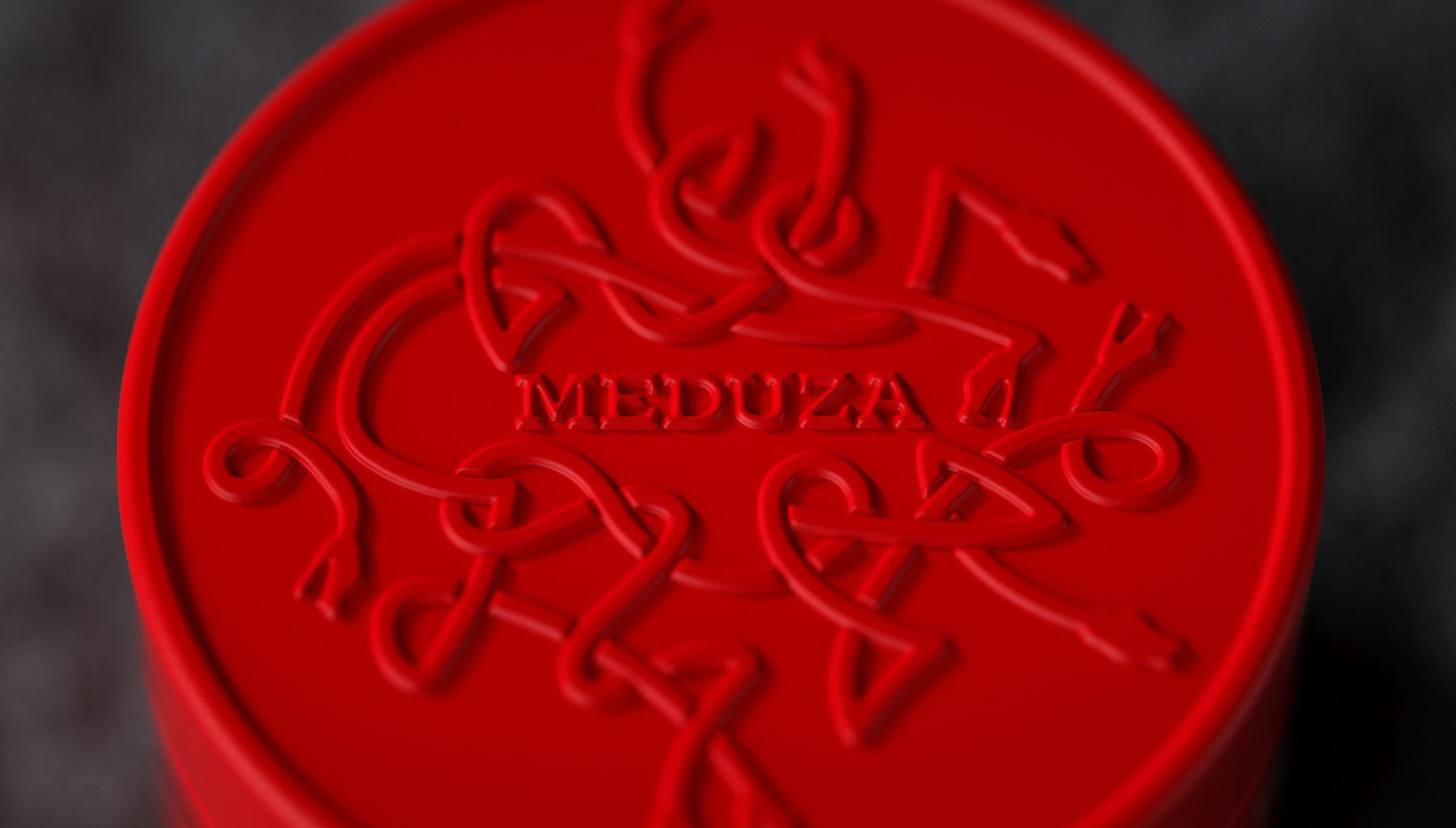 Основной графический элемент — орнамент из змей, метафорически показывающий бороду и усы мужской версии Медузы Горгоны.