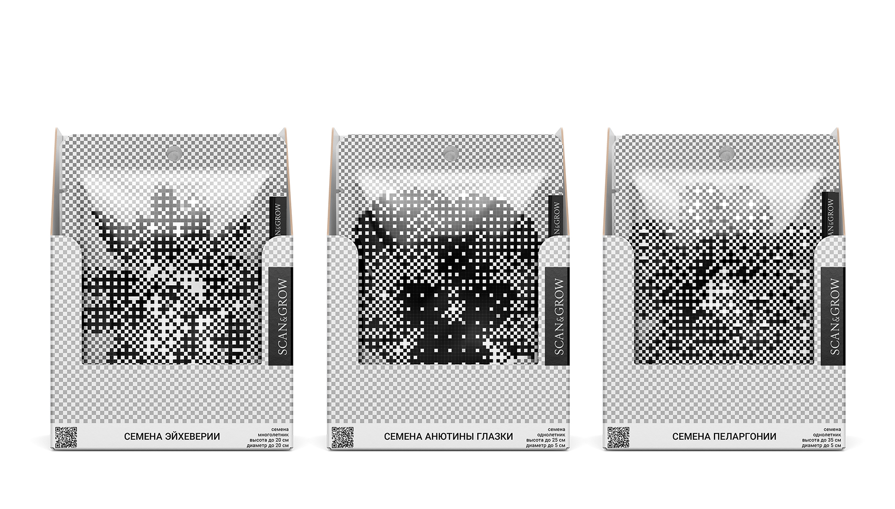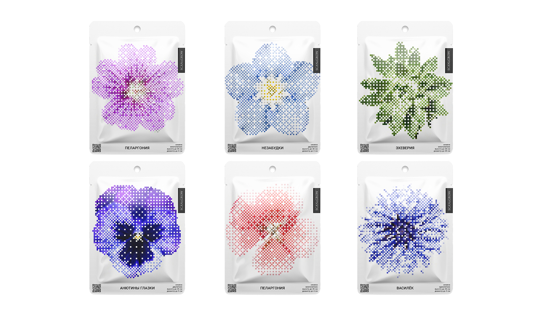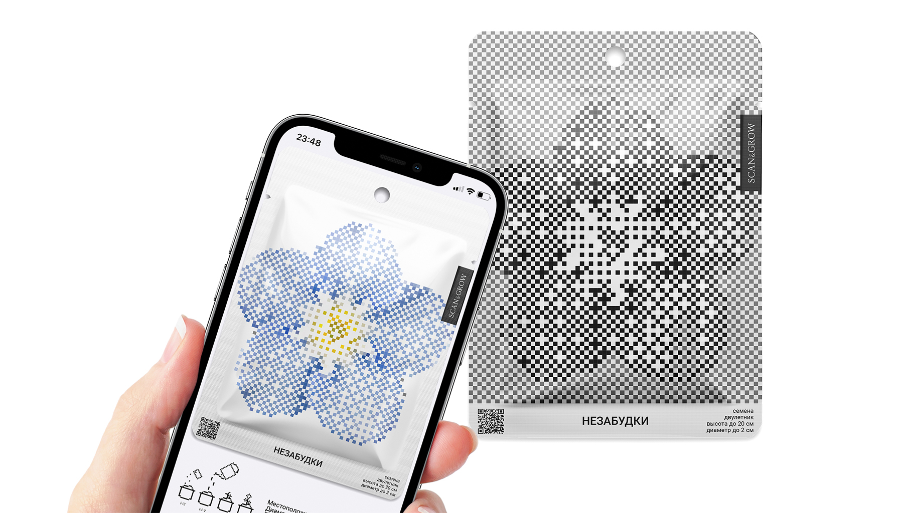 Упаковка семян Scan&Grow интригует своим видом, qr-код раскрывает цвет растения и инструкцию по уходу.