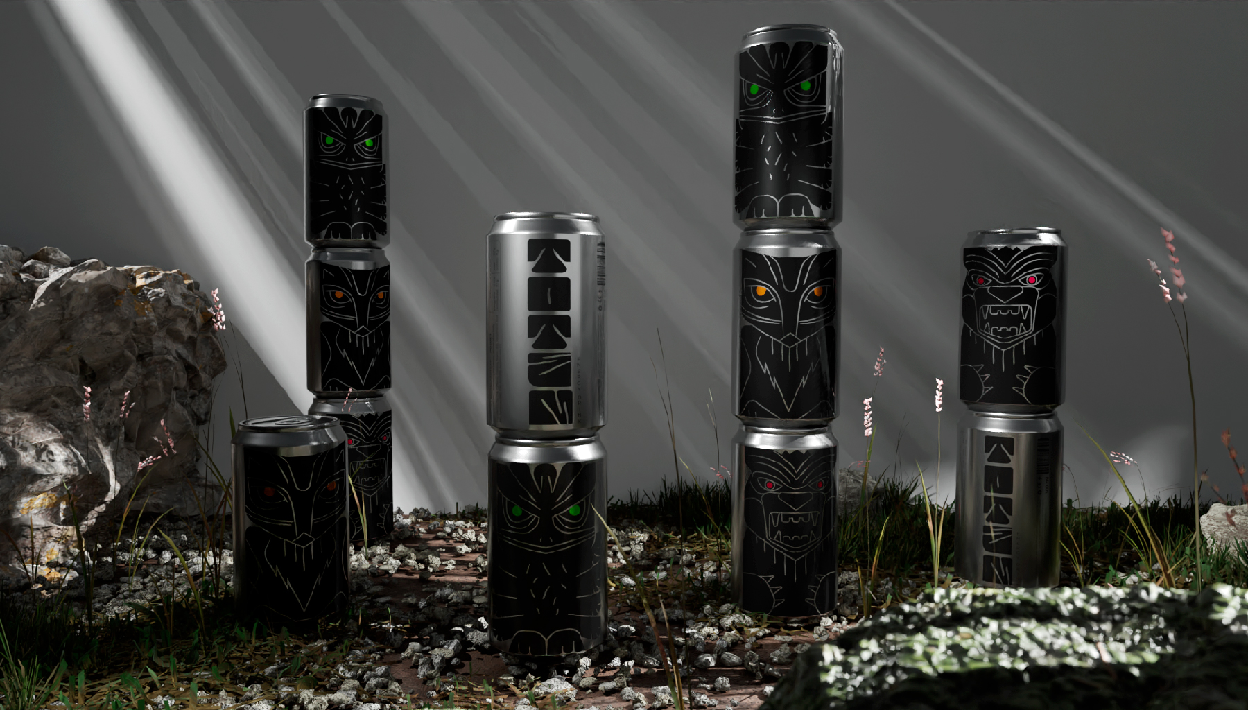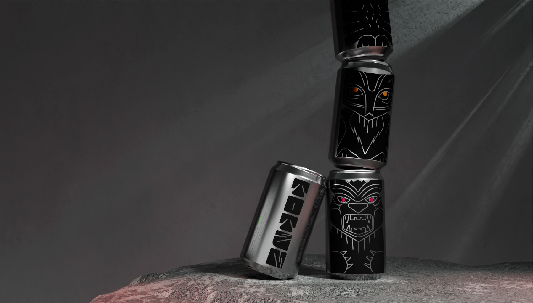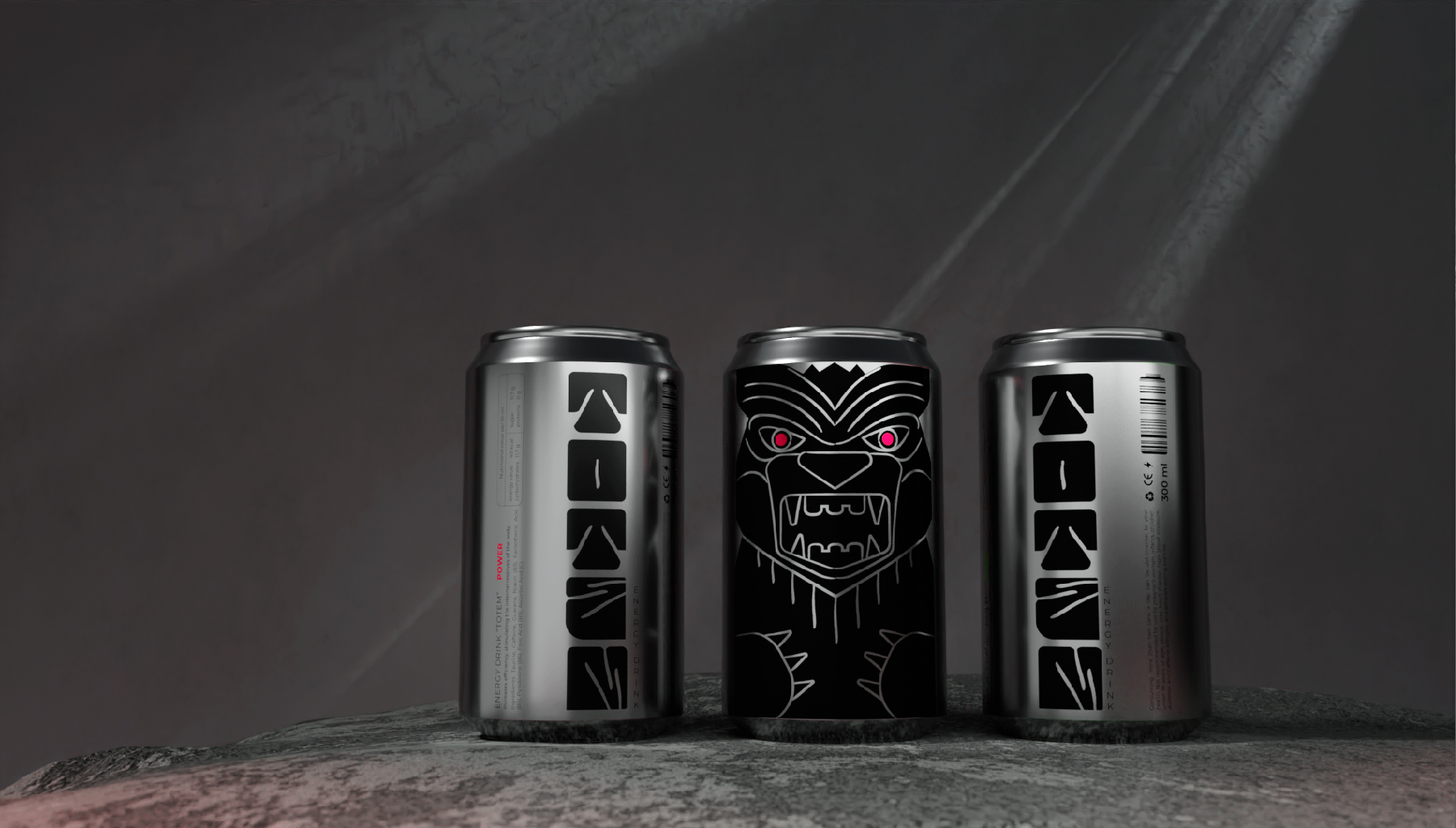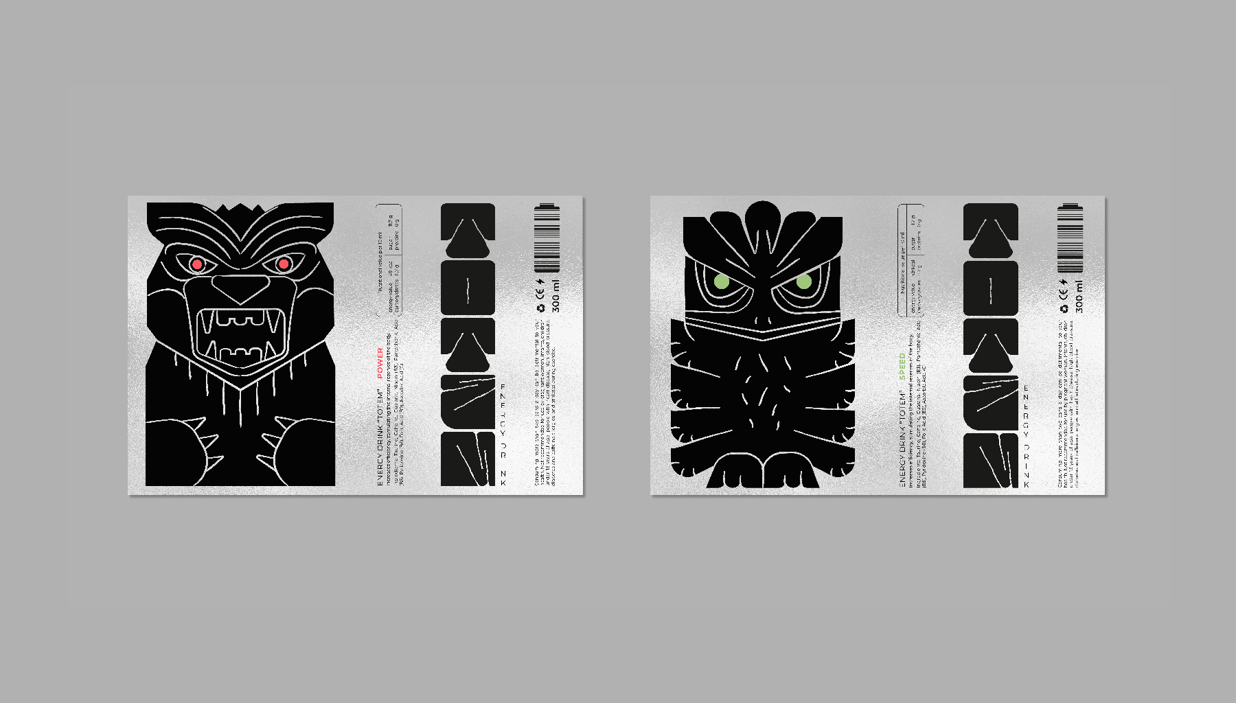 Тотемы - древний символ силы, энергии и защиты. Каждый элемент и образ тотемов вырезался не просто так, каждое животное несло свой сакральный смысл. Для энергетических напитков взято три образа со своим характером: медведь - пробуждает силу и выносливость, лиса - активизирует мозг и внимание, орел - превозносит энергию и скорость. В концепции раскрывается игровая метафора, складывая банки друг на друга получается цельный тотемный столб.