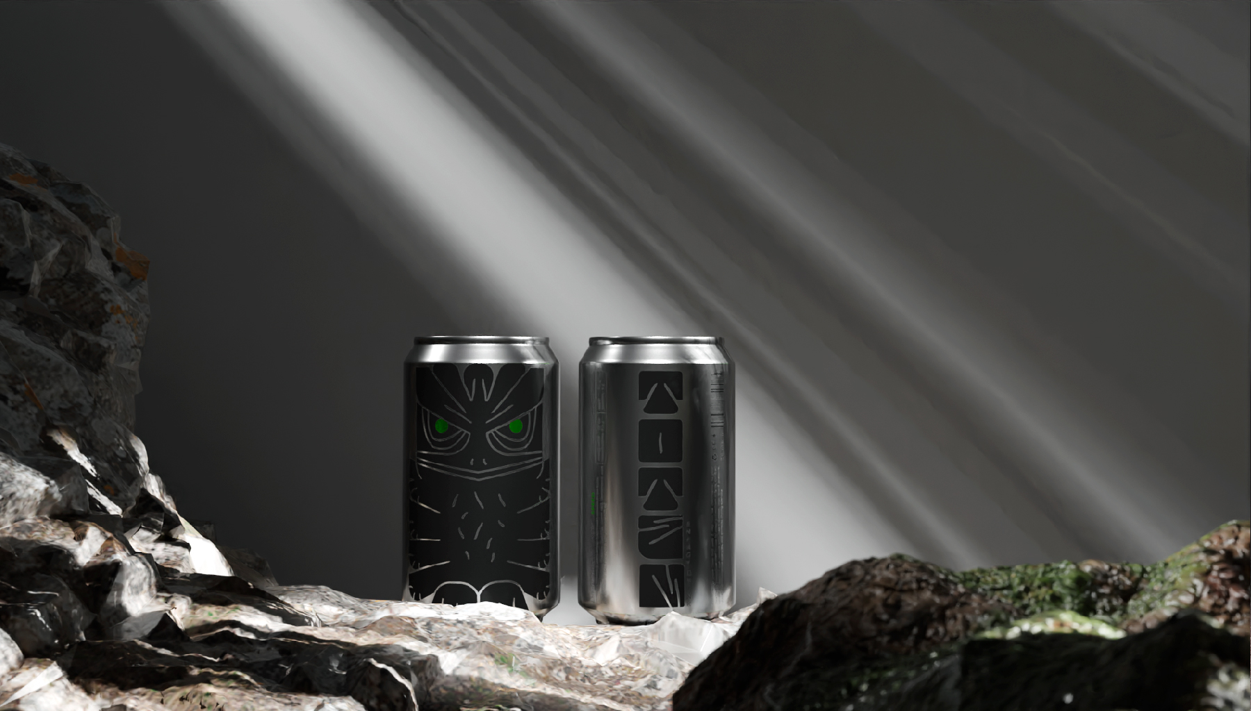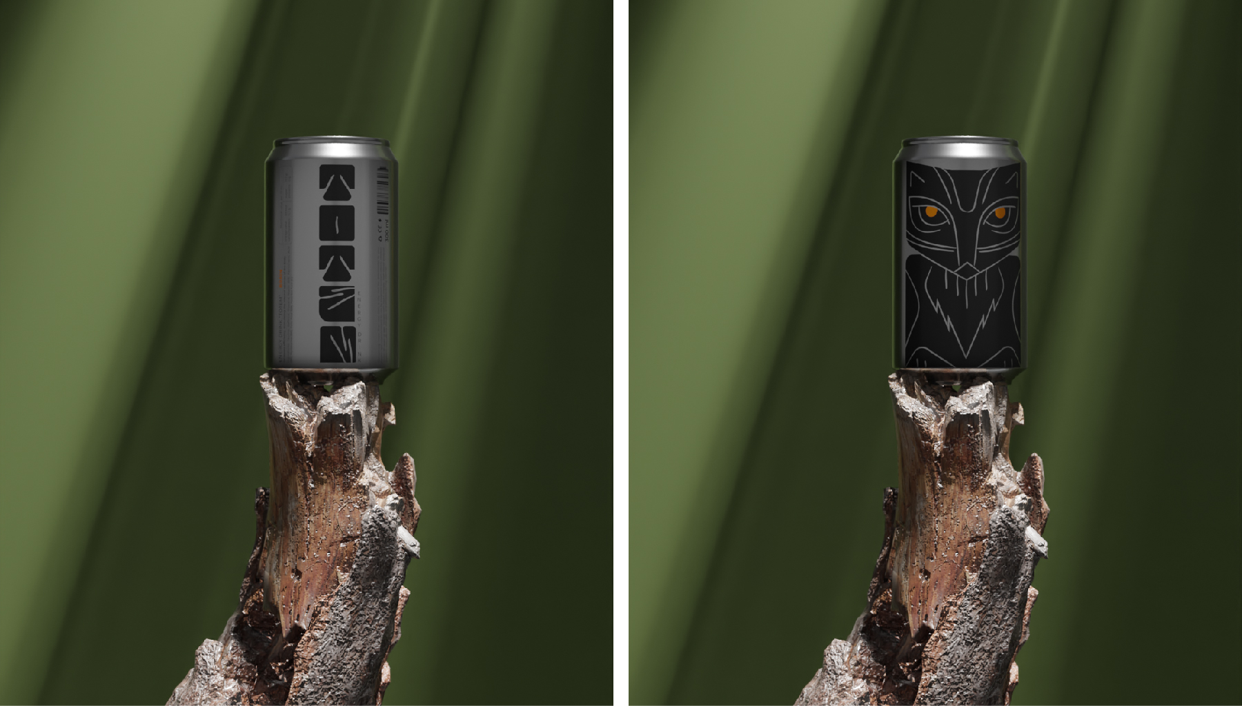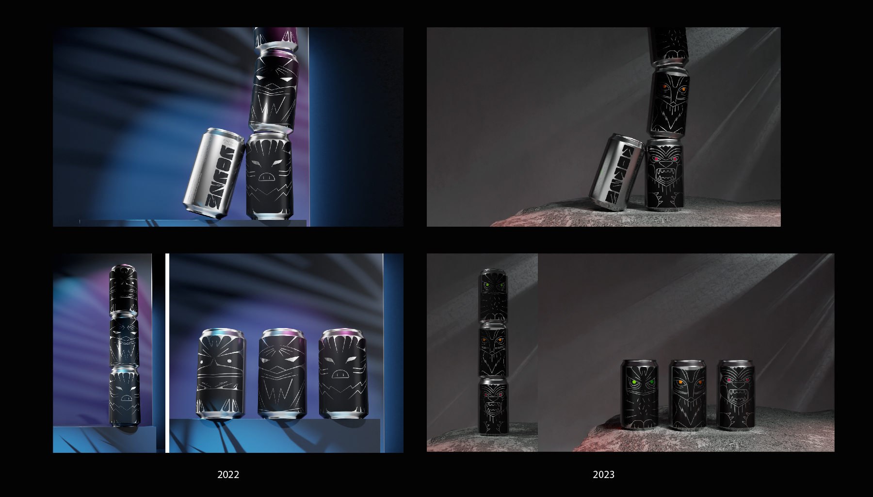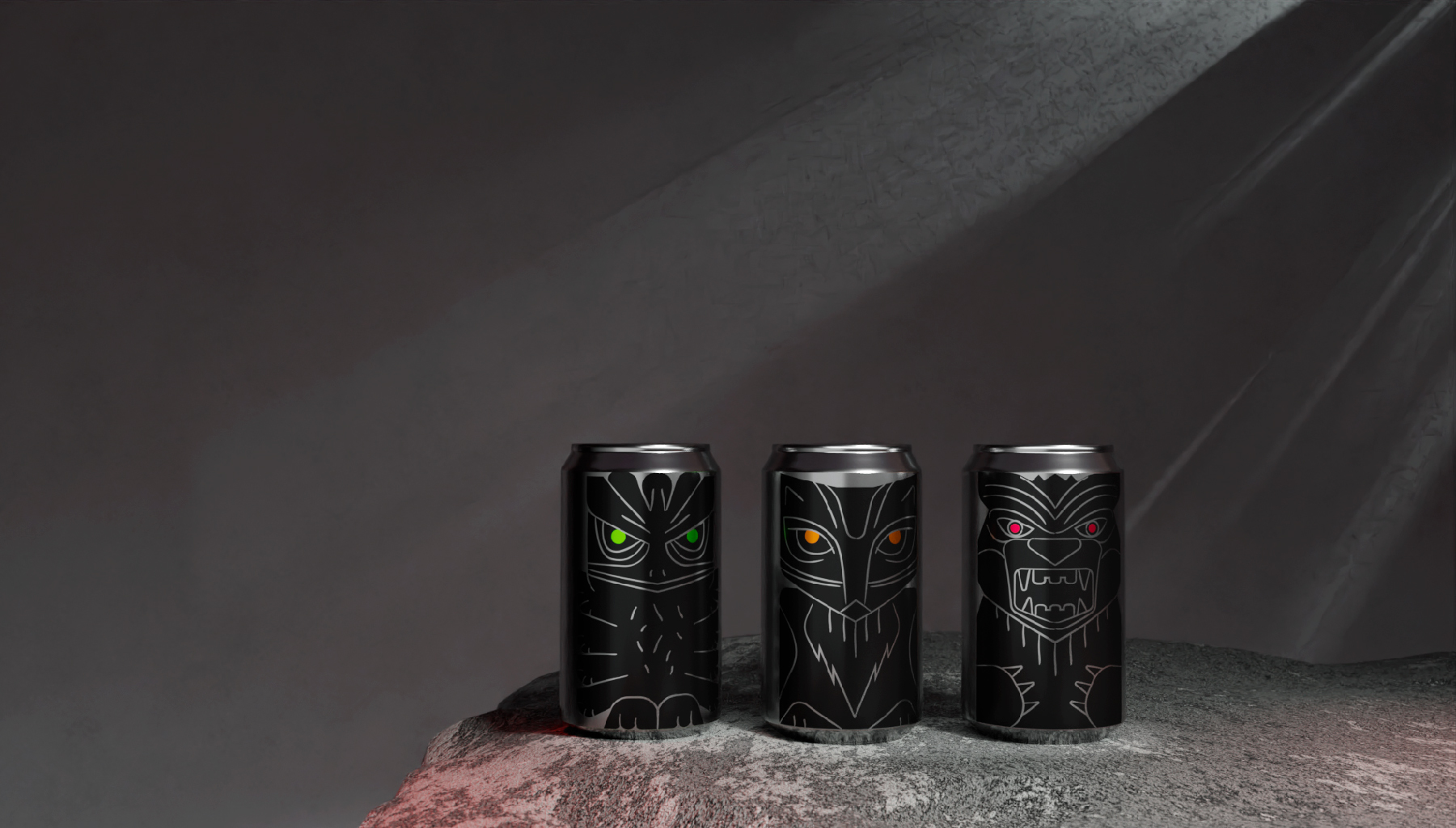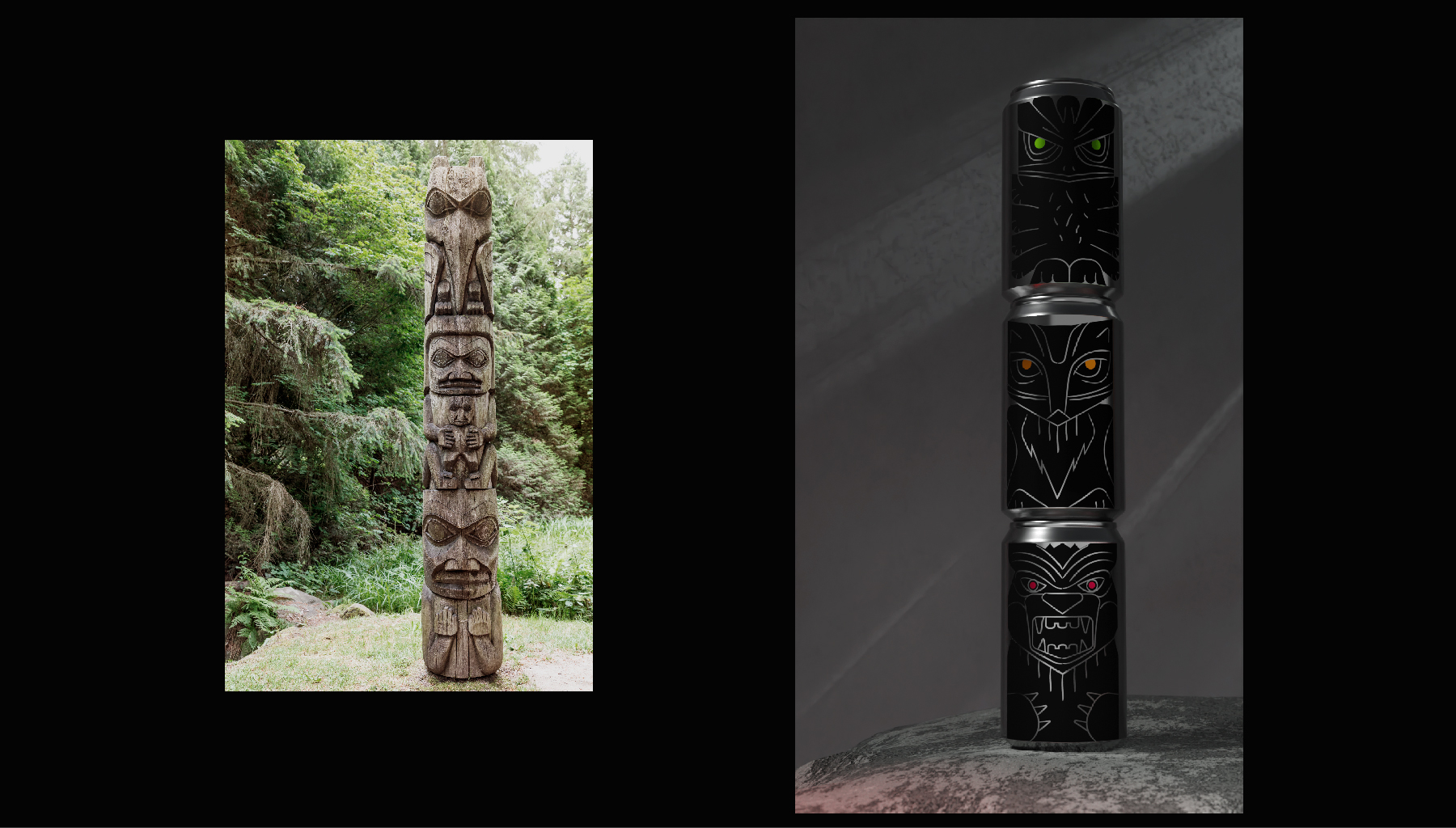 Тотемы - древний символ силы, энергии и защиты. Каждый элемент и образ тотемов вырезался не просто так, каждое животное несло свой сакральный смысл. Для энергетических напитков взято три образа со своим характером: медведь - пробуждает силу и выносливость, лиса - активизирует мозг и внимание, орел - превозносит энергию и скорость. В концепции раскрывается игровая метафора, складывая банки друг на друга получается цельный тотемный столб.