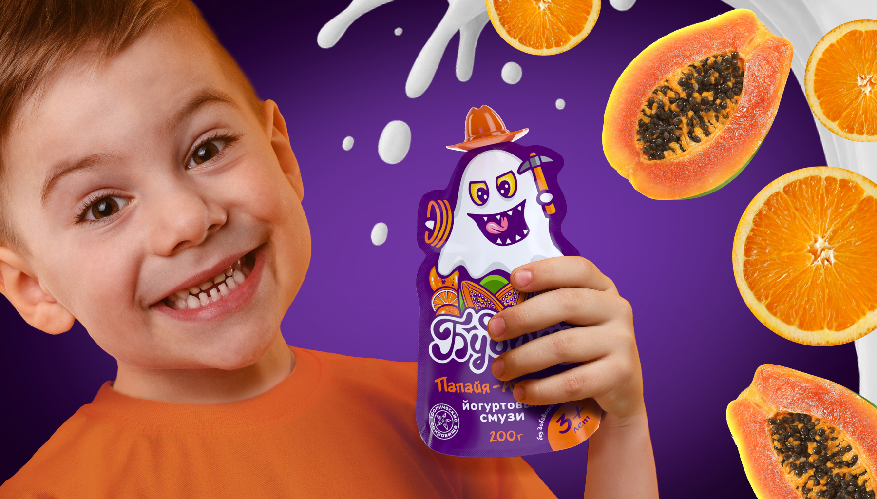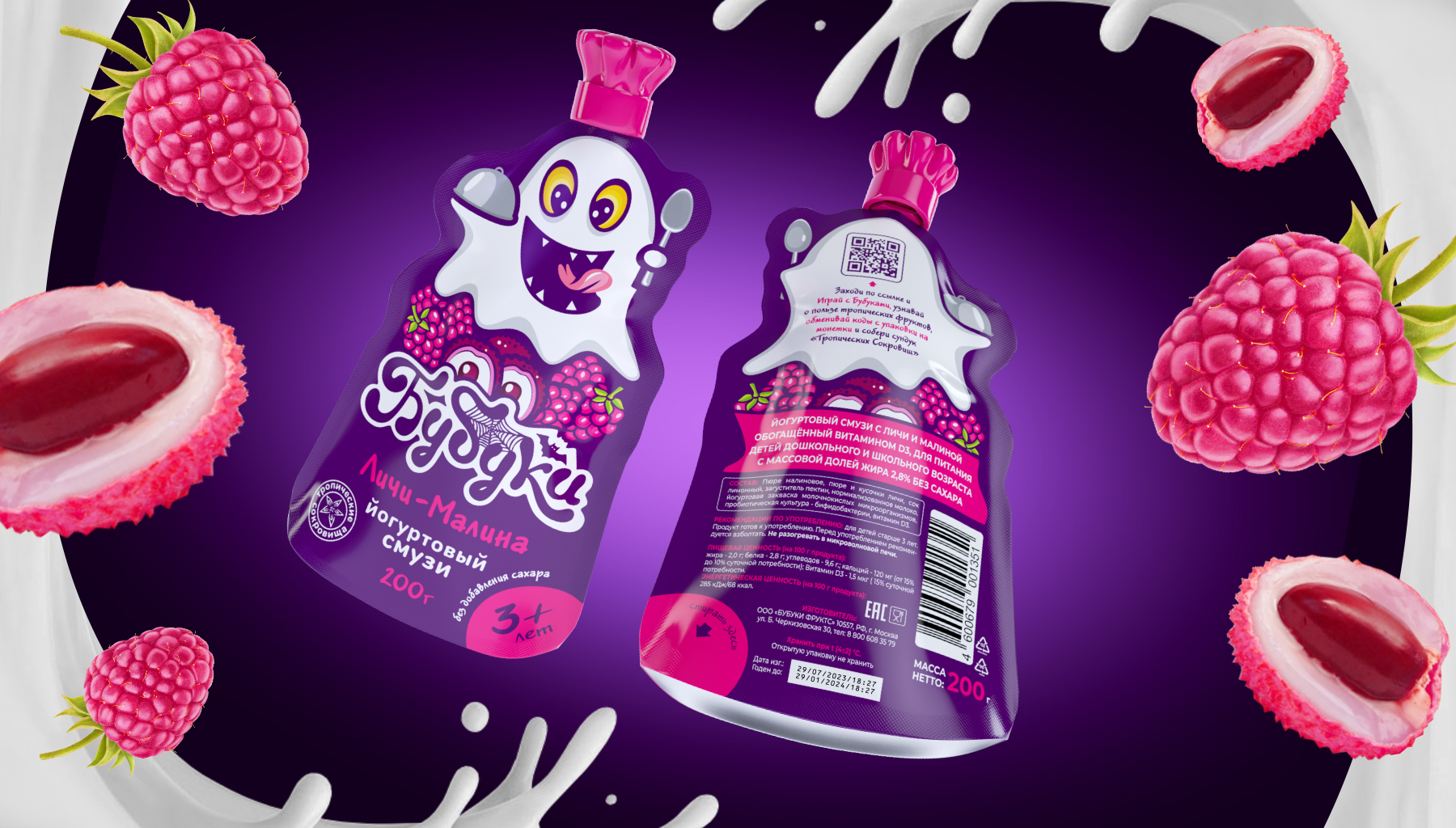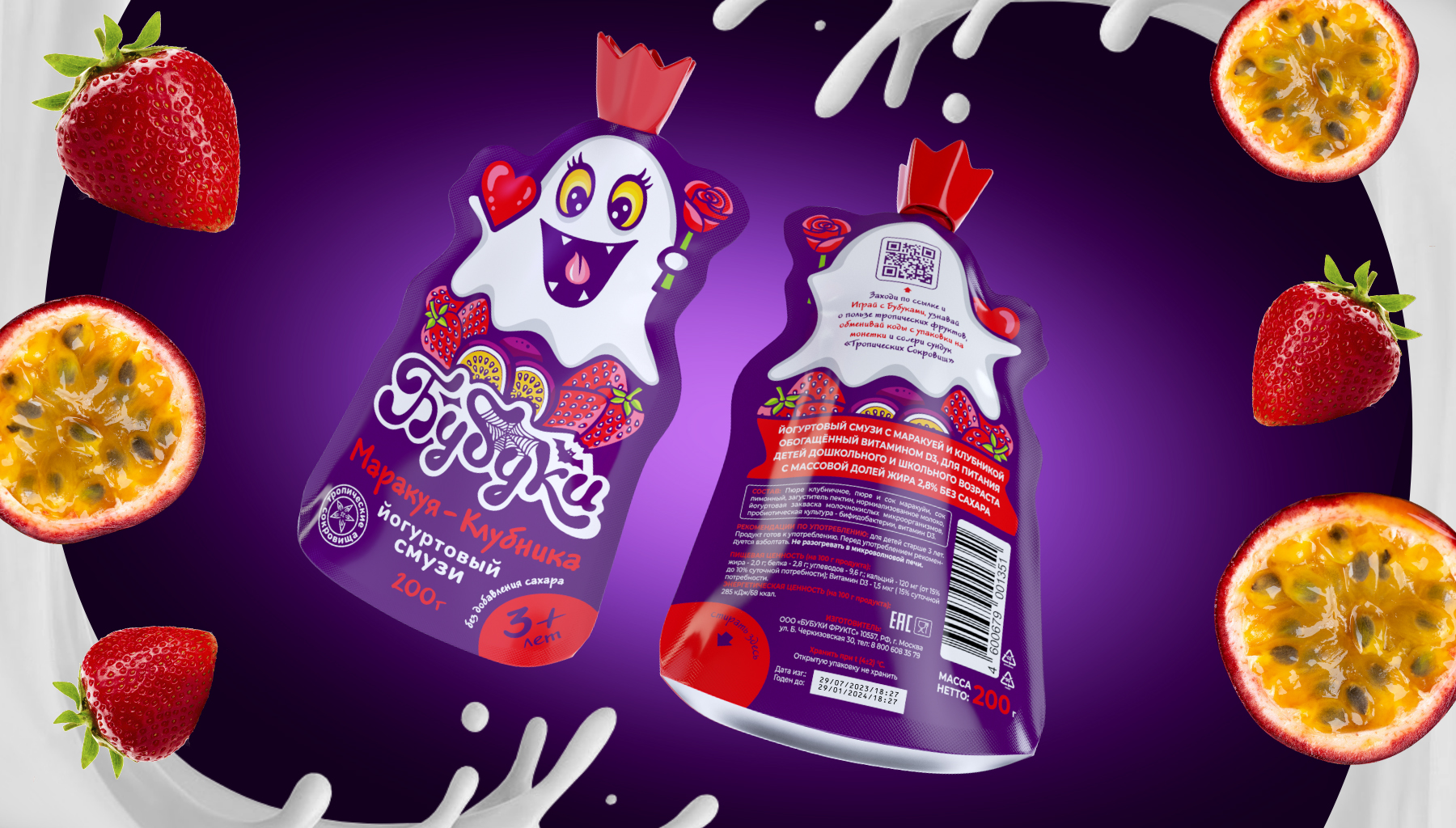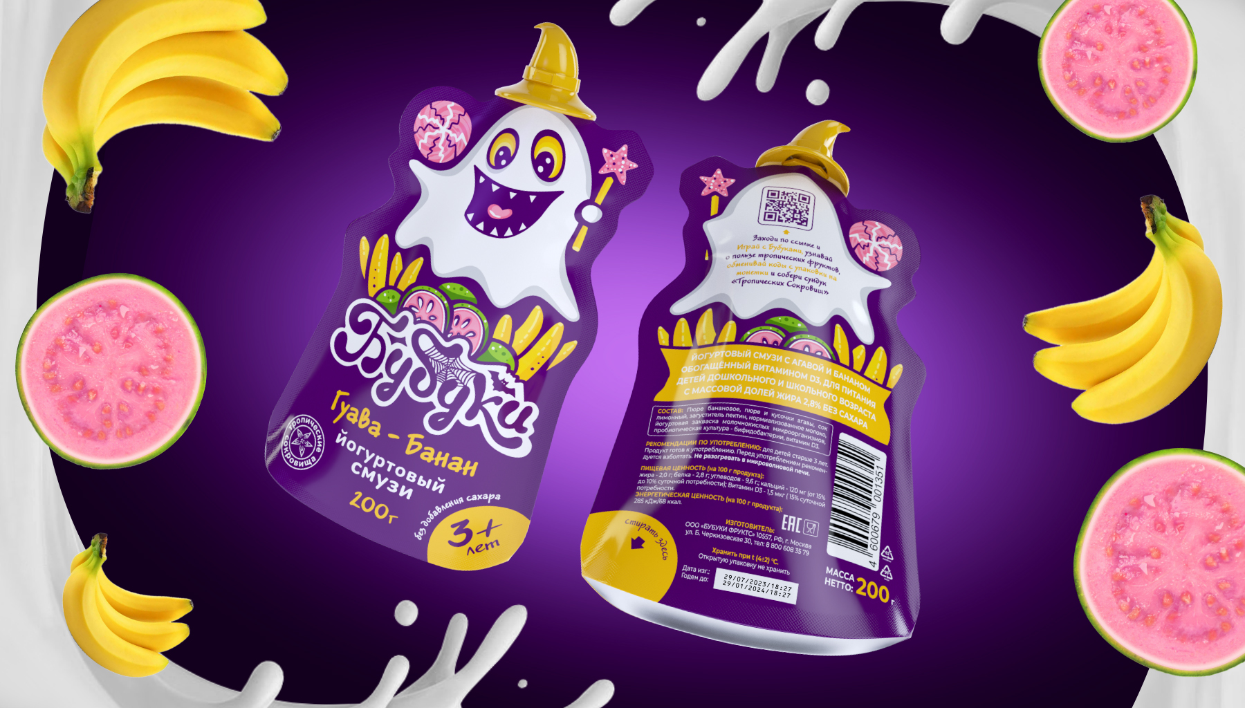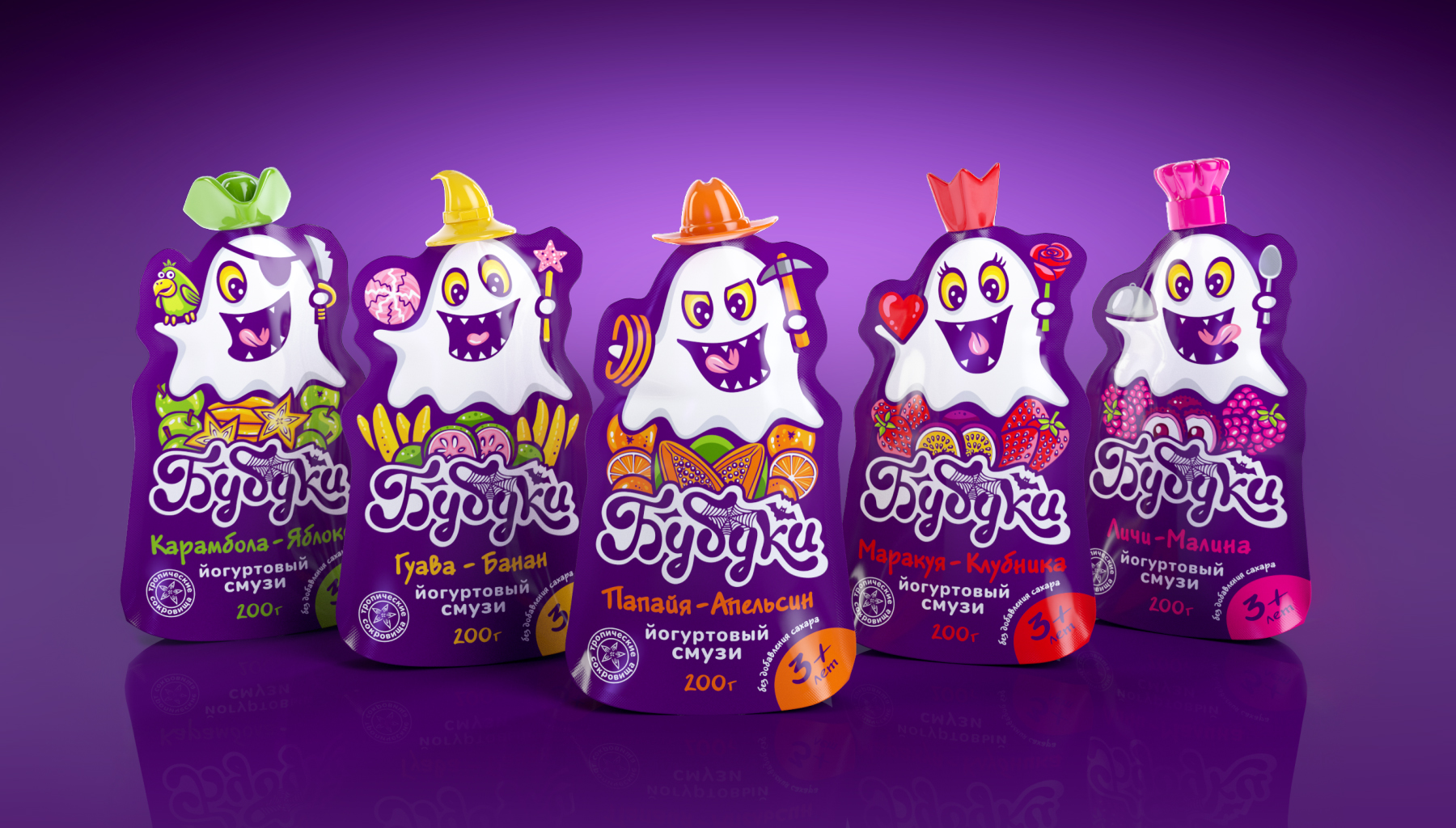 Решение: Яркая, привлекающая детские взгляды упаковка с нарисованными авторскими персонажами - привидениями Бубуками. У каждого персонажа свой характер и цветовой идентификатор, своя крышка-шляпка и конечно, у каждого свой мешочек фруктов, которые входят в состав смузи. А ещё наши персонажи светятся в темноте и любят играть.