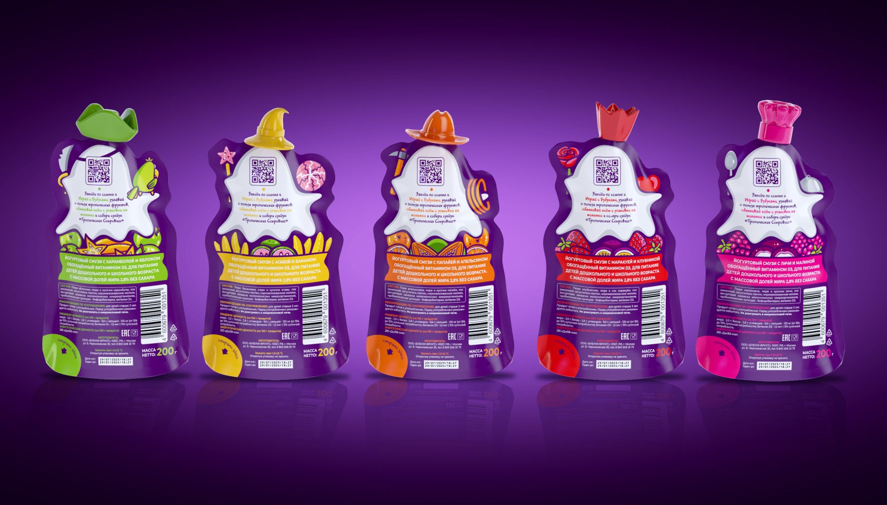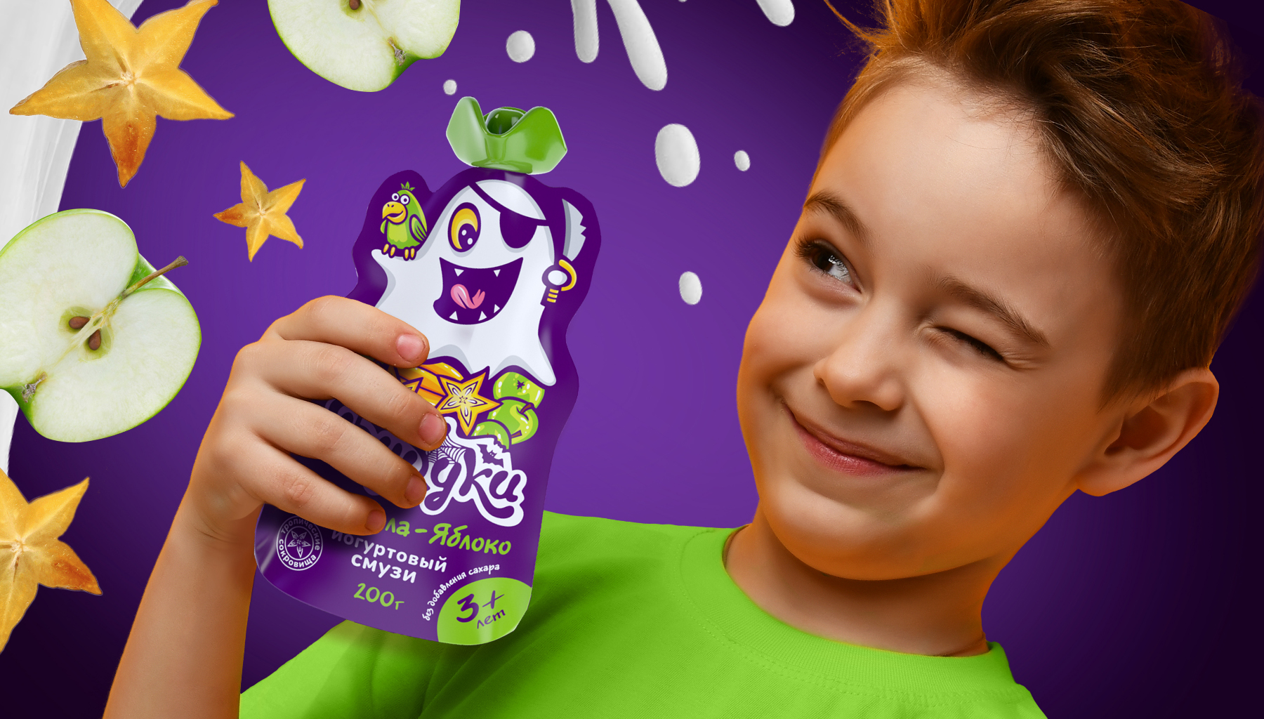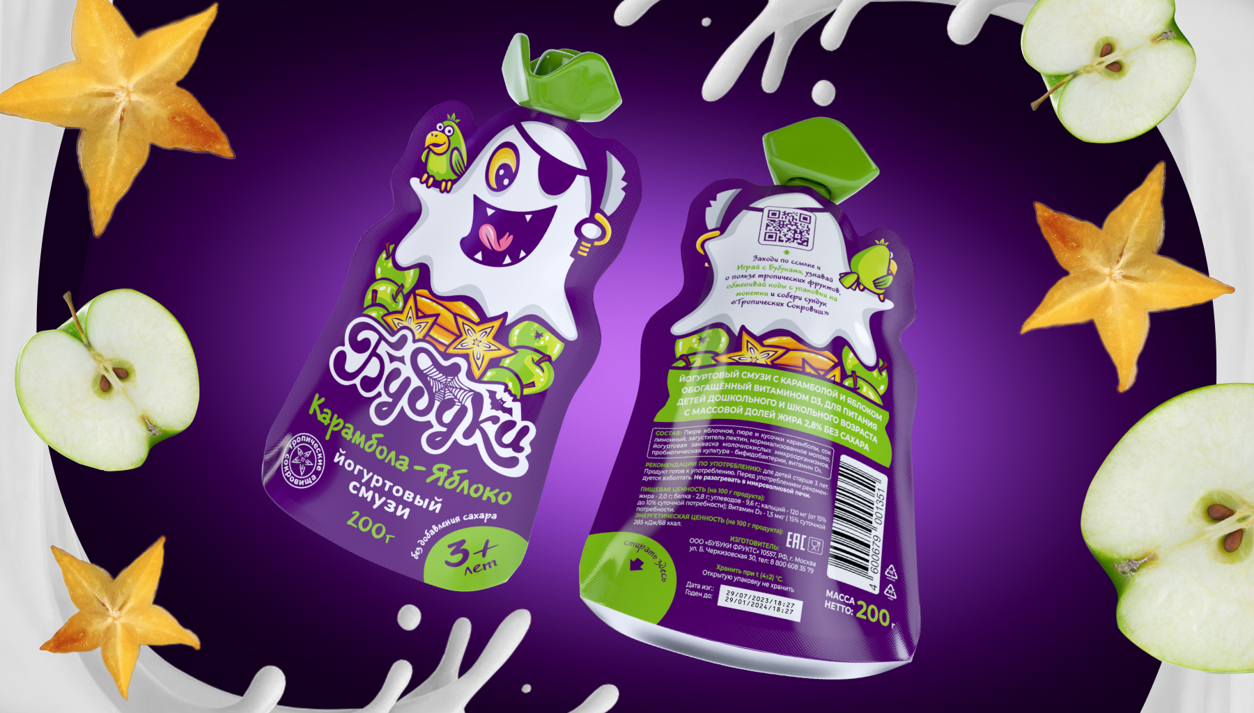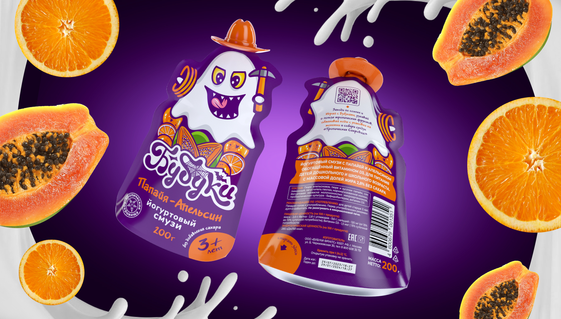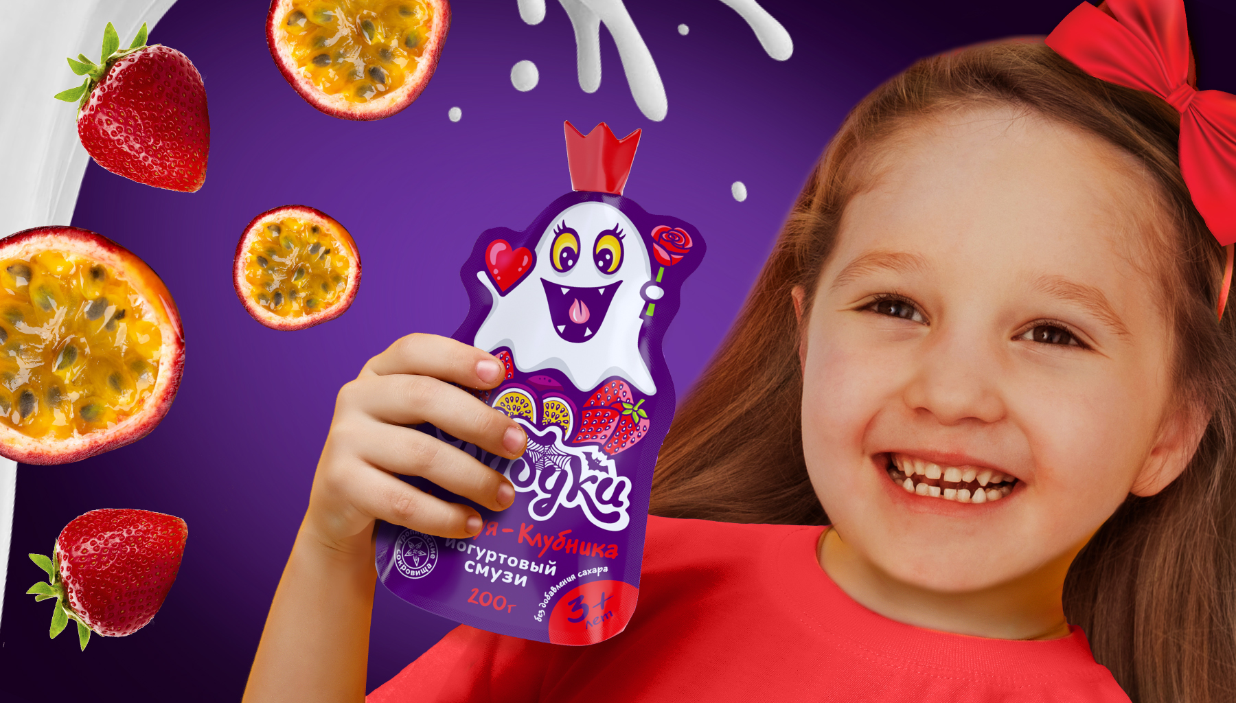 Решение: Яркая, привлекающая детские взгляды упаковка с нарисованными авторскими персонажами - привидениями Бубуками. У каждого персонажа свой характер и цветовой идентификатор, своя крышка-шляпка и конечно, у каждого свой мешочек фруктов, которые входят в состав смузи. А ещё наши персонажи светятся в темноте и любят играть.
