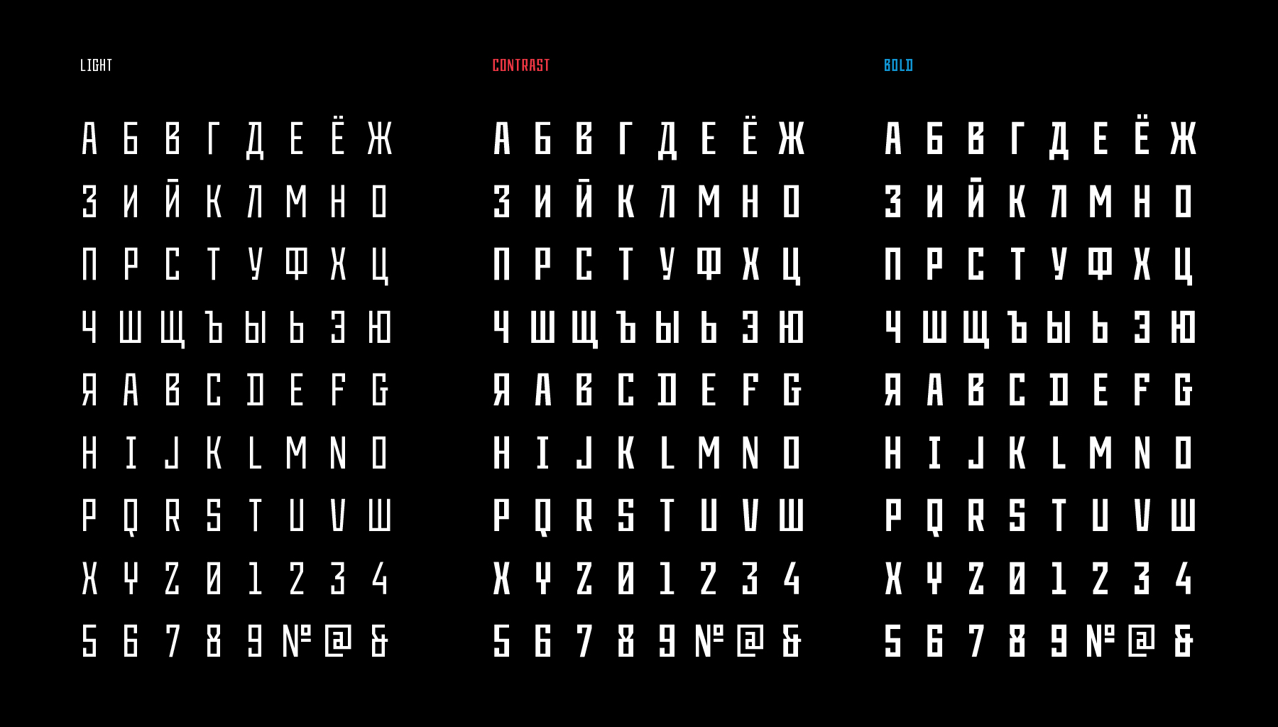 Светлое начертание послужило своеобразным остовом шрифта. Увеличивая насыщенность по горизонтали, оно превращается в переходное контрастное начертание. А добавив такое же утолщение по вертикали, мы получаем полужирное начертание.