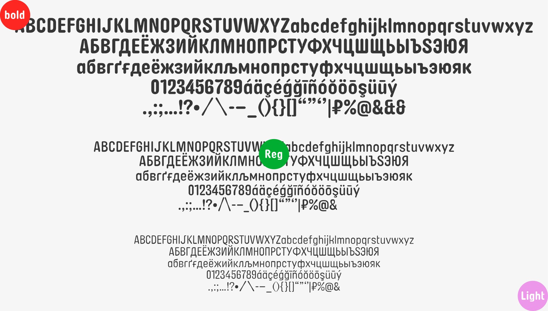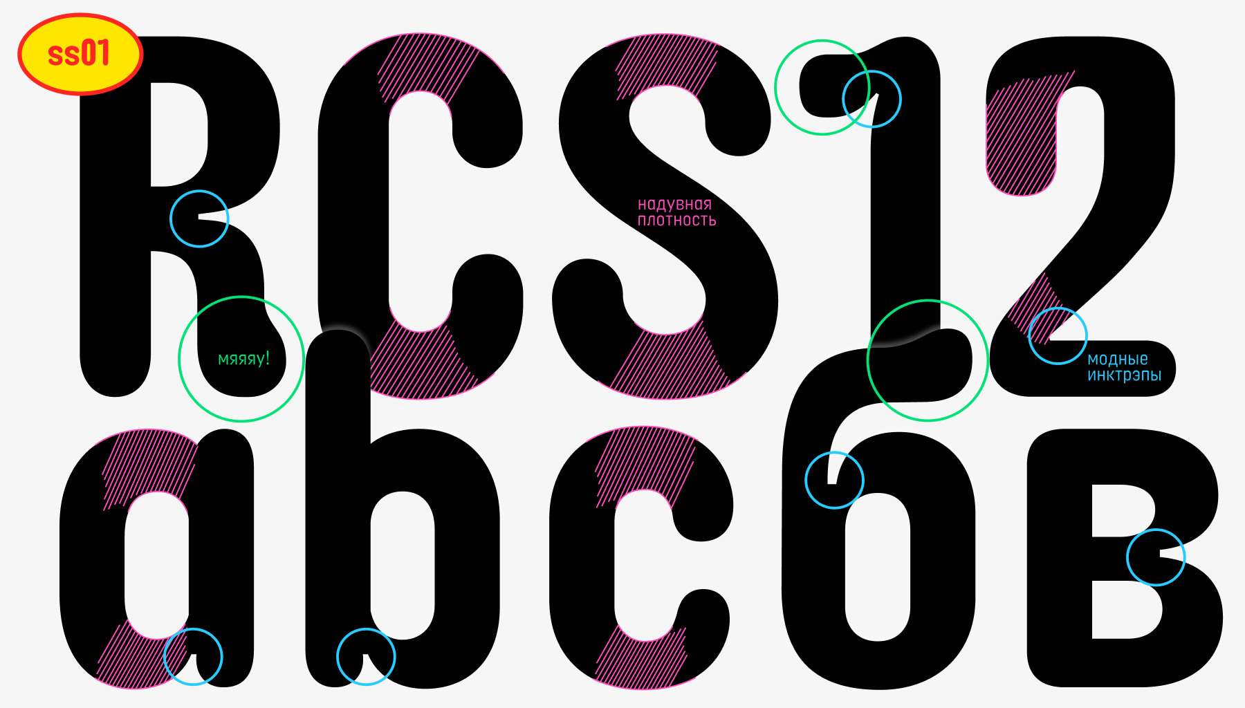 Отсюда в шрифте «плавающая плотность», «мягкие лапки», неожиданные конструкции знаков, как в основном наборе так и в альтернативных знаках. Важно было, чтобы шрифт был не слишком системным, чтоб в нем были живость и даже некоторая непредсказуемость, и даже «цирк» — это цитата.