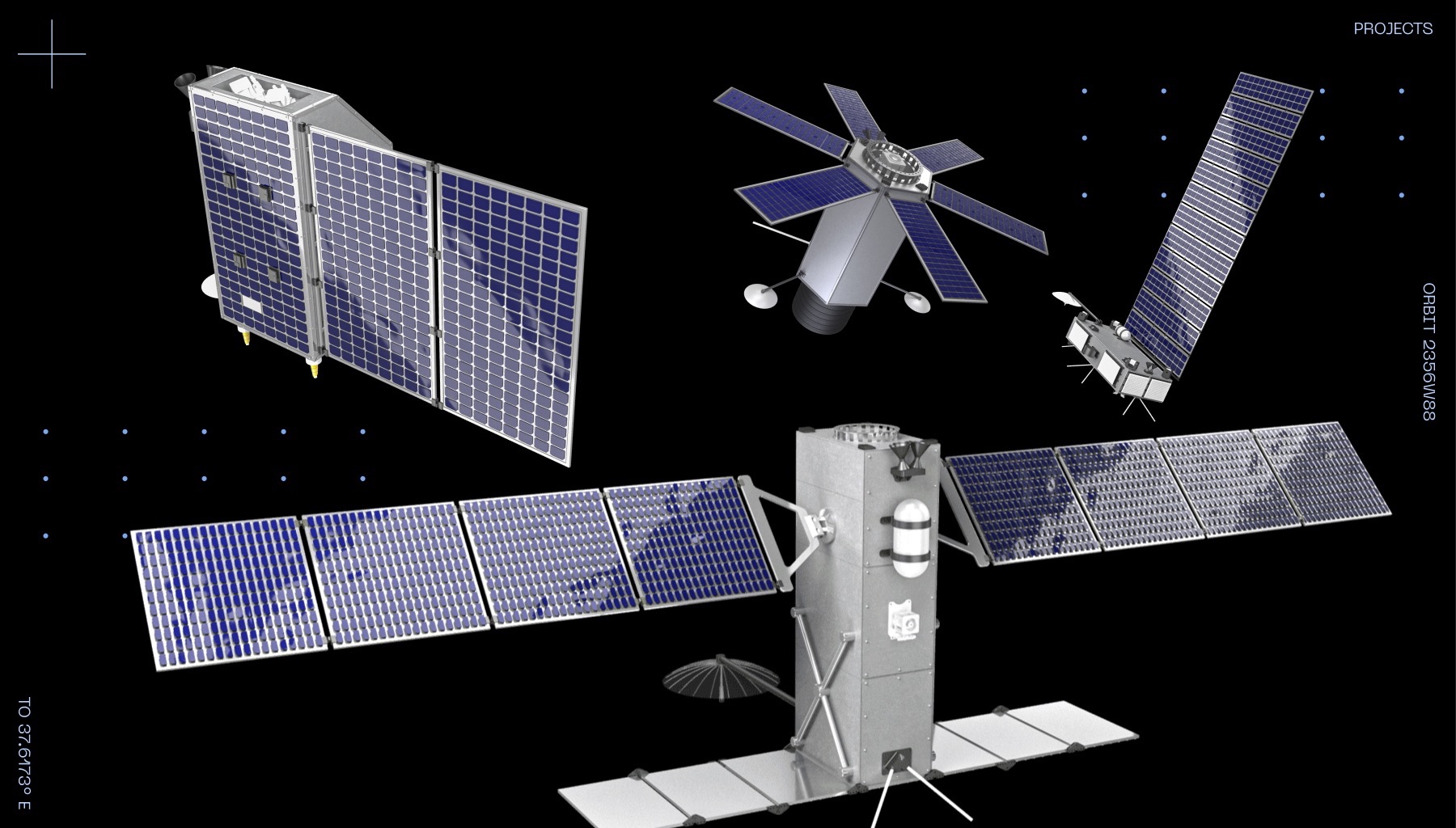 Основным визуальным элементом на сайте стали обрывистые формы фотомозаики (именно в таком виде снимки, сделанные в космосе, передаются на Землю). Эти формы асимметричных многоугольников бесконечны в своих вариациях и делают стиль бренда живым и адаптивным. В зависимости от иллюстрируемого продукта или направления работы компании формы сочетаются с тематическими графическими паттернами, фотографиями и цветами.