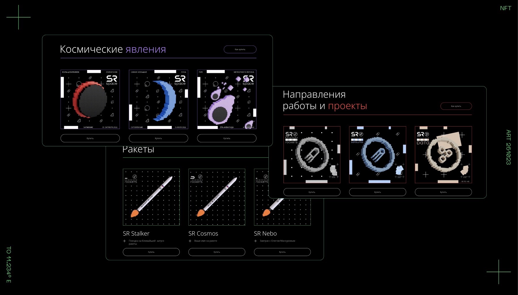 Чтобы решить амбициозную задачу по привлечению на сайт более широкой аудитории, интересующейся технологиями и космосом, мы сделали страницу NFT-коллекции бренда и оформили саму коллекцию. Она состоит из 3 наборов карточек, которые рассказывают о моделях ракет, направлениях деятельности и проектах SR Space и позиционировании компании. Каждый покупатель NFT, кроме самой карточки, получает бонус. Например, фирменный мерч, деловой завтрак с основателем Олегом Мансуровым или даже возможность разместить своё имя на ракете.