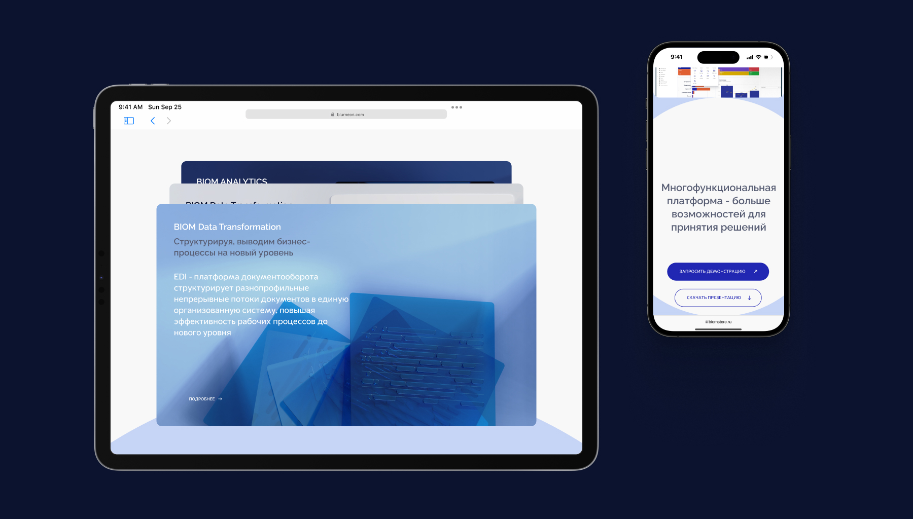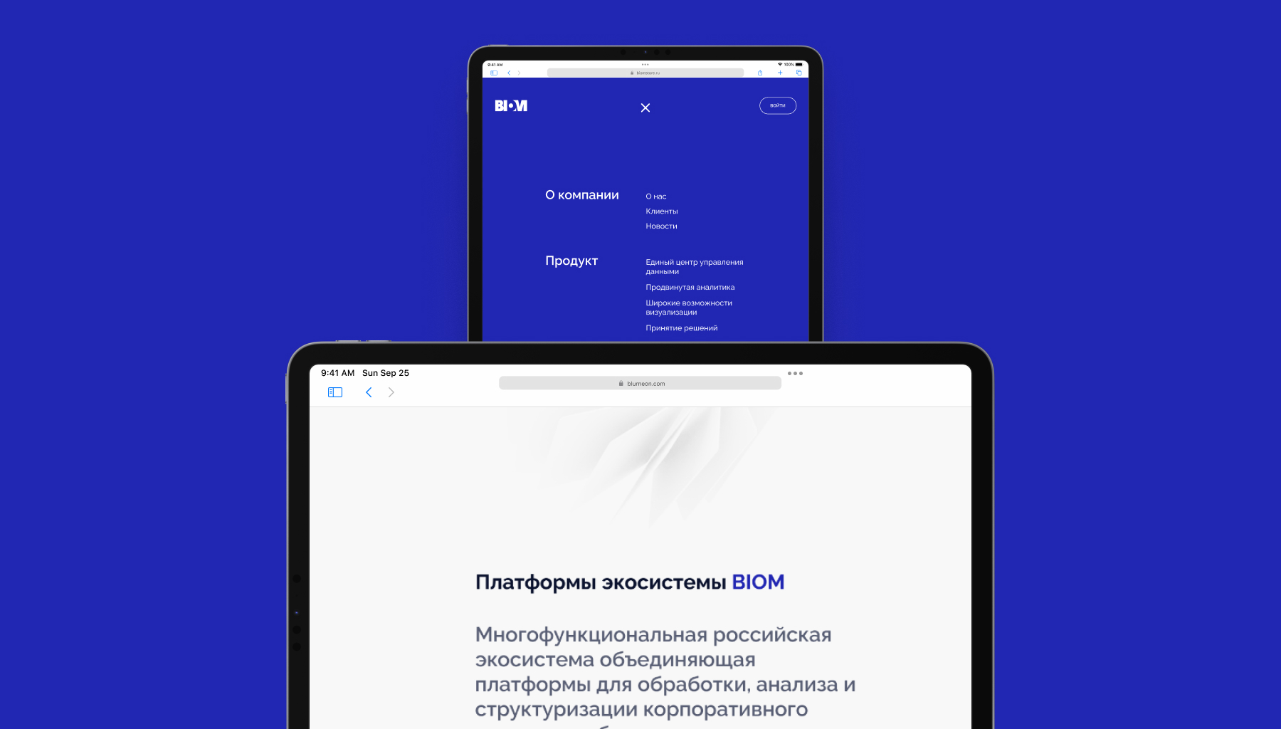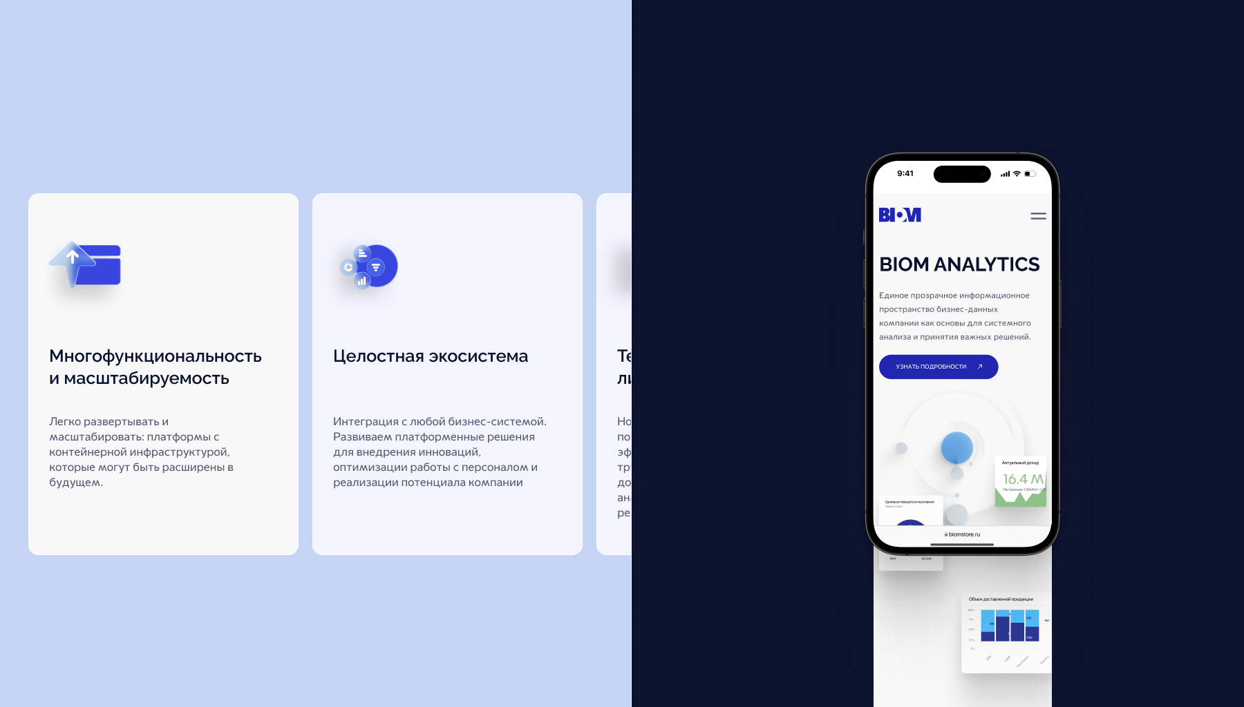 В основе дизайна лежит концепция анализа больших данных. Образ послойности и выделения активных зон стал основной идеей, реализованной в стилеобразующих элементах. Вся дизайн-композиция интернет-сайта отражает комплекс эмоций, которые вызывают ассоциации с отраслью и самими продуктами: прозрачность, надежность, и простота. Все это связали с образом бренда экосистемы BIOM, как многослойного технологичного продукта.