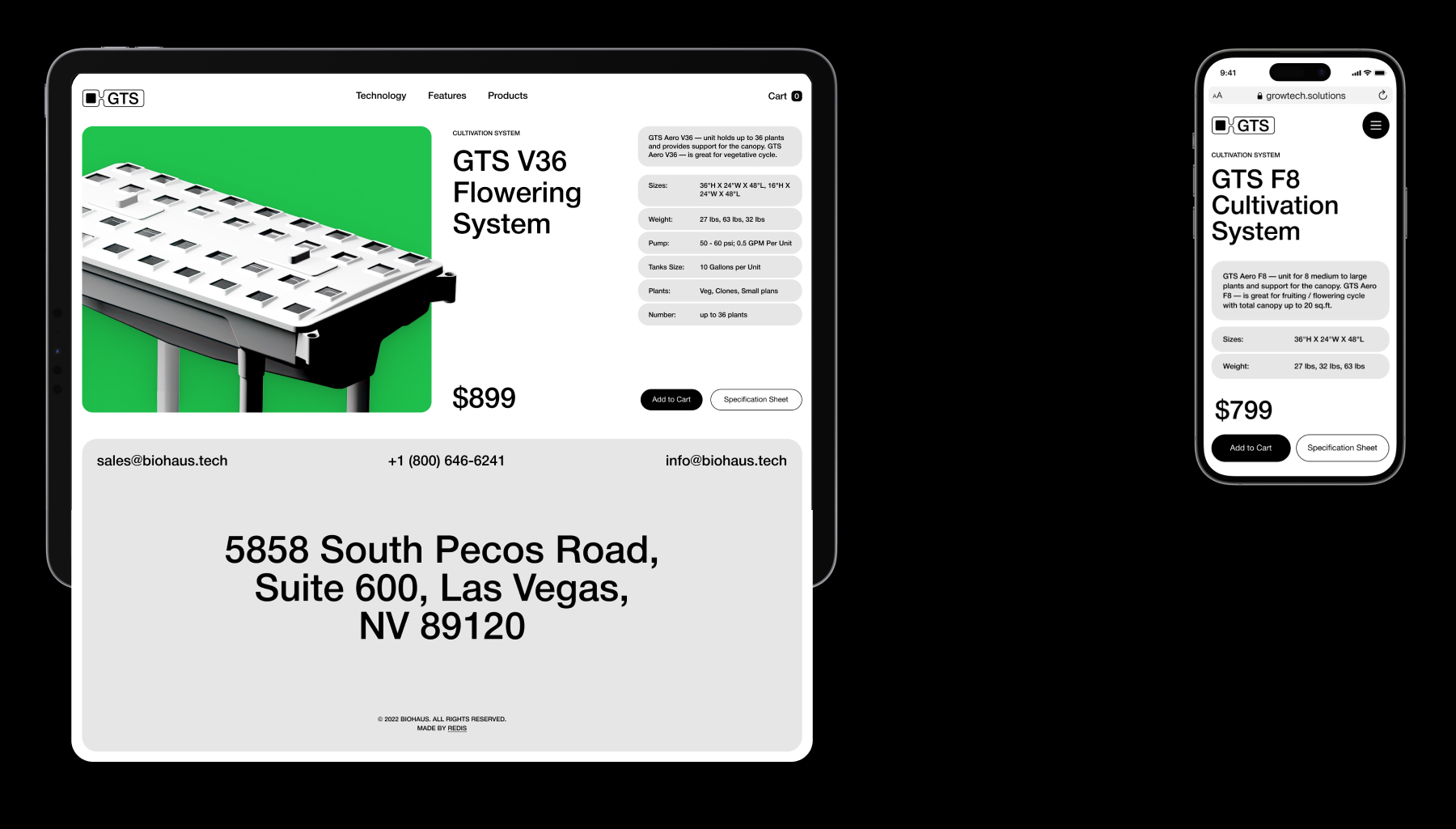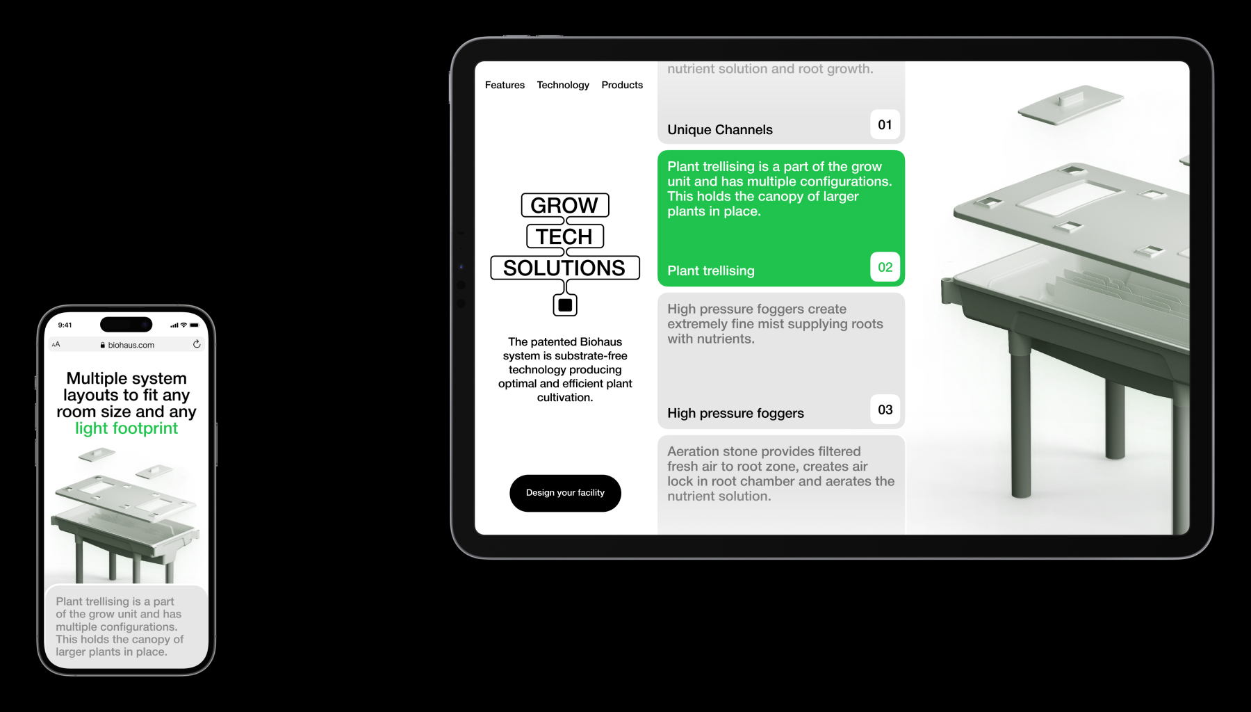 Чтобы обыграть связь бренда с природой, использовали плавные формы, напоминающие растения, а крупную графику — для акцента на фичах бренда. Также мы внедрили 3D-модель продукта, чтобы показать его во всех деталях. Пользователь скроллит сайт, в то время как одна анимация сменяет другую и подробно демонстрирует, как работает GrowTech Solutions.