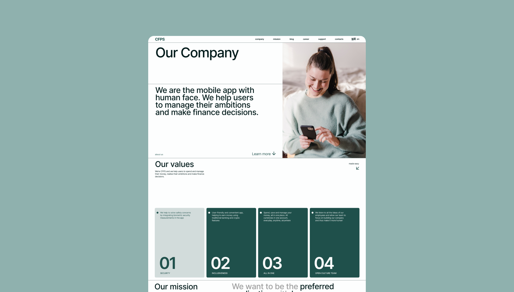 CFS — интеллектуальное кроссплатформенное мобильное приложение. Он основан на новейших технологиях, облегчающих людям управление своими финансами. Мы также гордимся тем, что сделали удобный веб-сайт для пользователей этого приложения. Наш веб-сайт разработан, чтобы быть удобным и интуитивно понятным, с четкой структурой и простой навигацией.