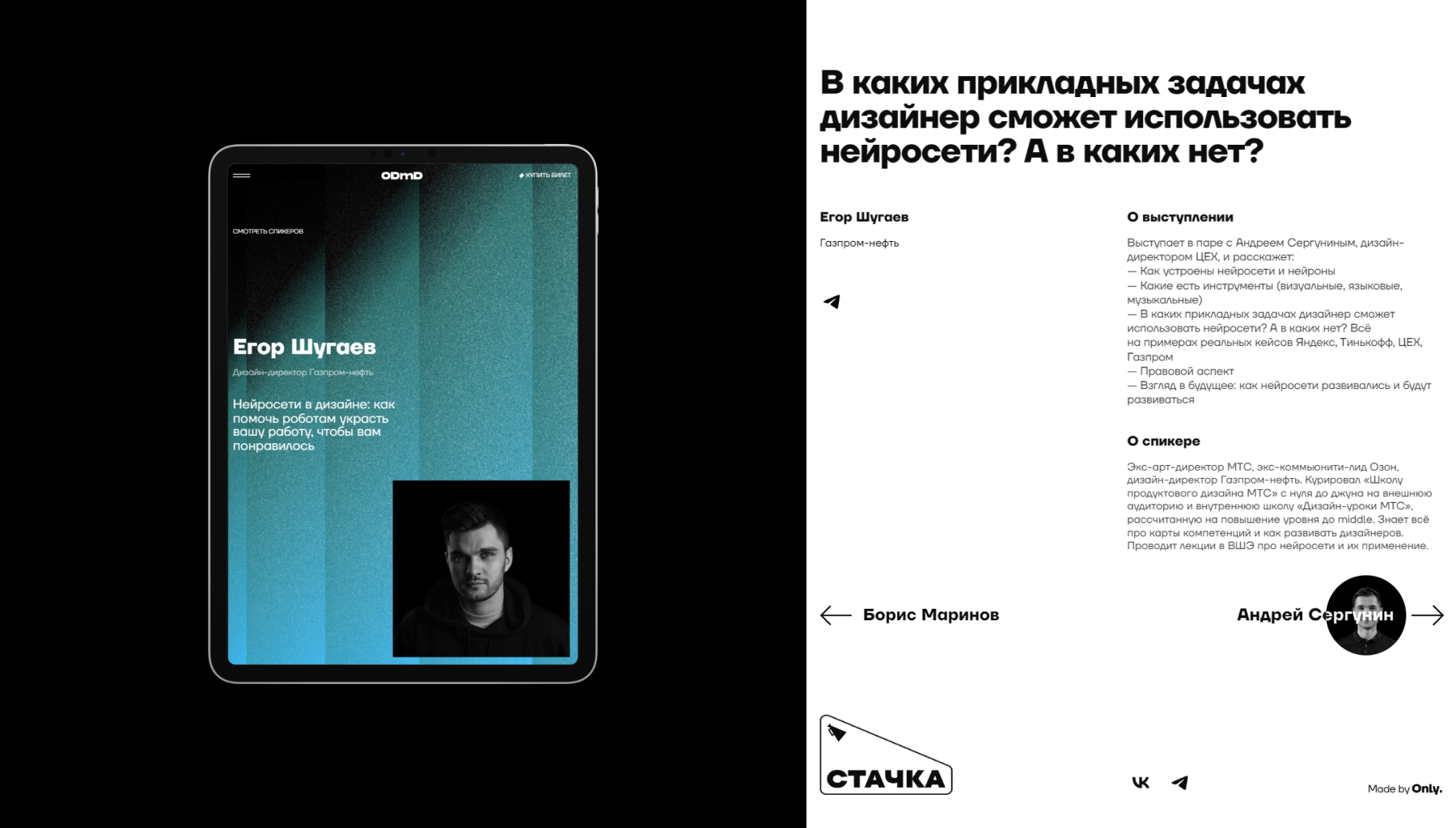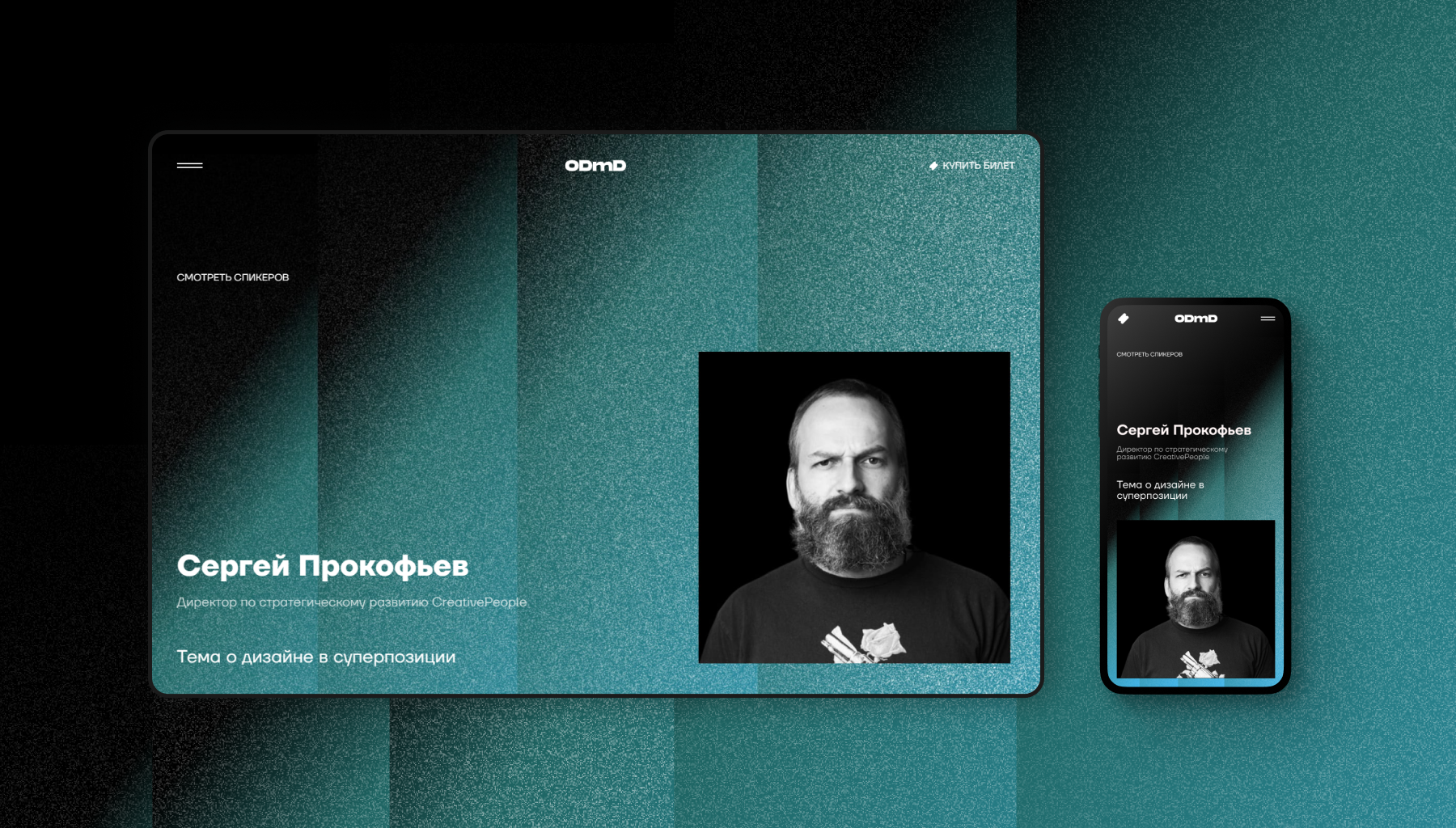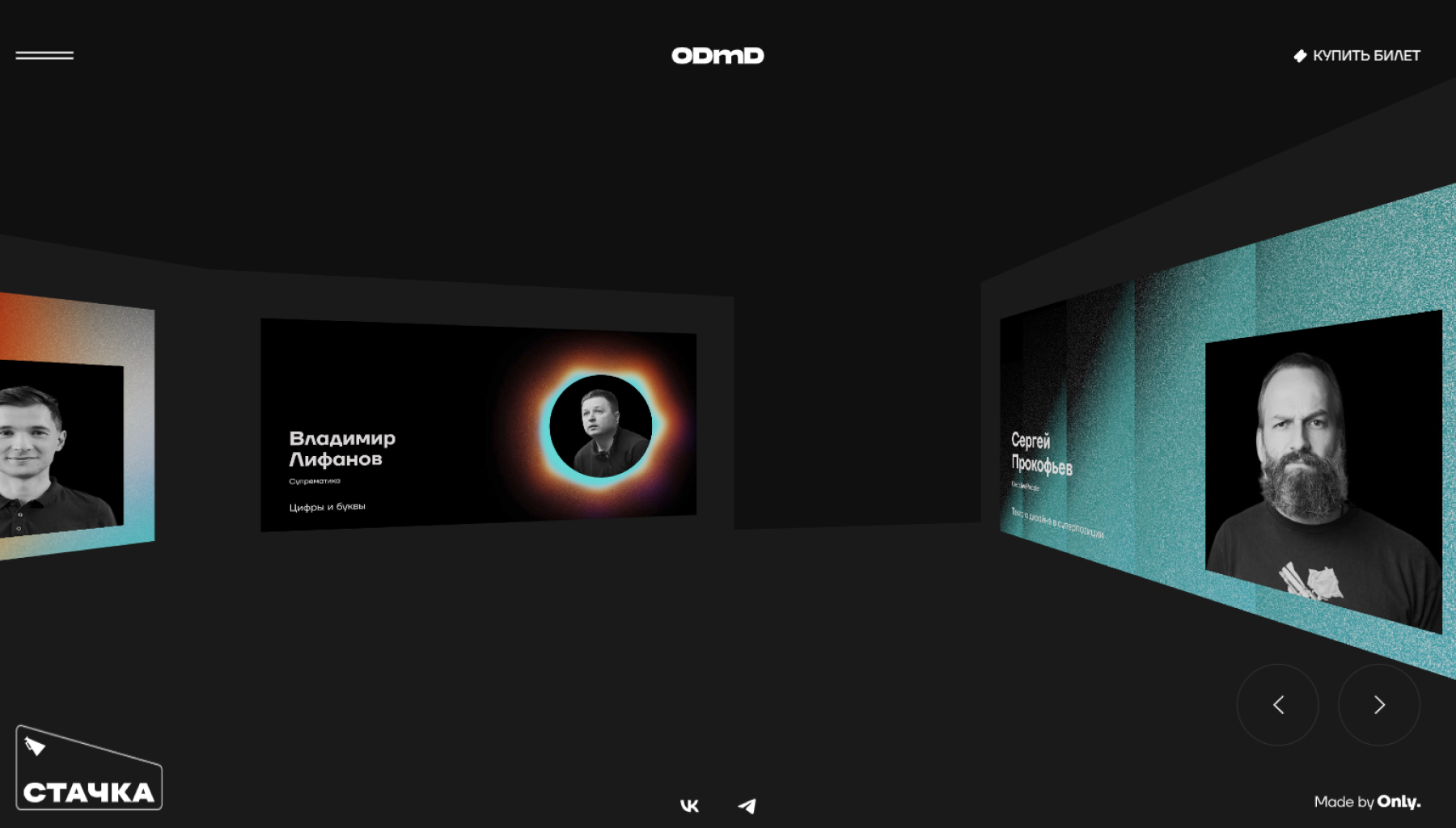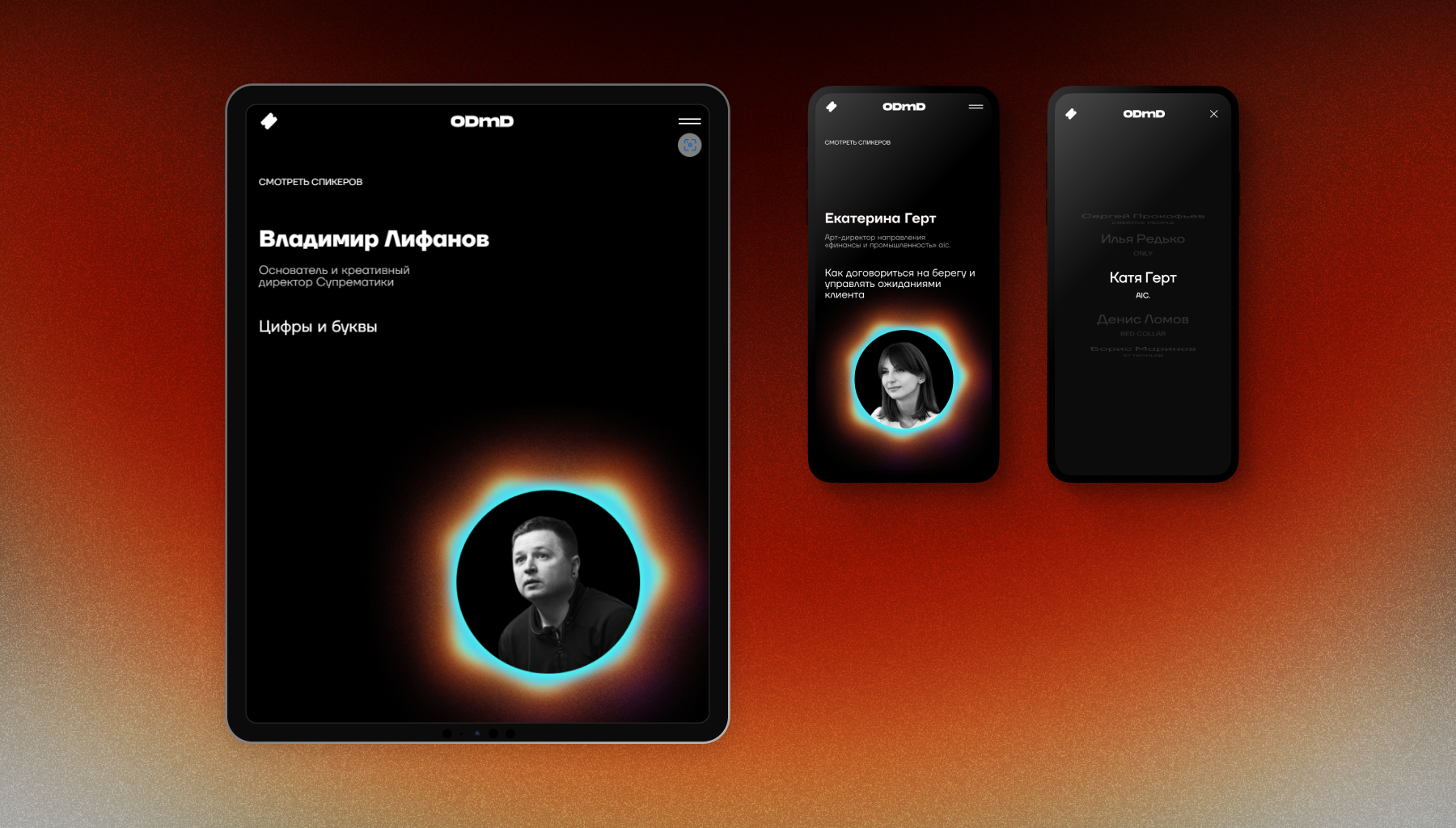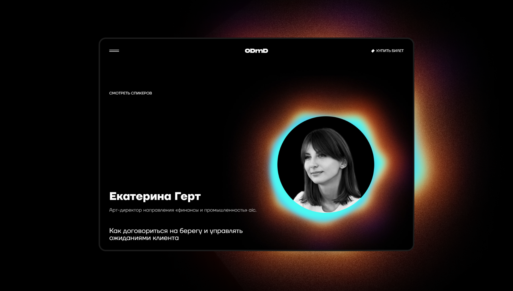 Дизайн сайта — визуальное воплощение концепции. Черно-белая палитра, неоновые градиенты, гипнотическая черная дыра. Галерея спикеров создана с использованием технологий WebGL и Three.js.