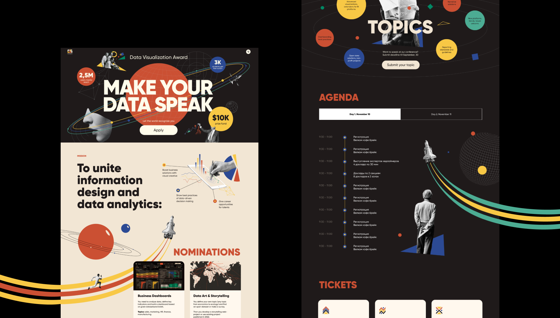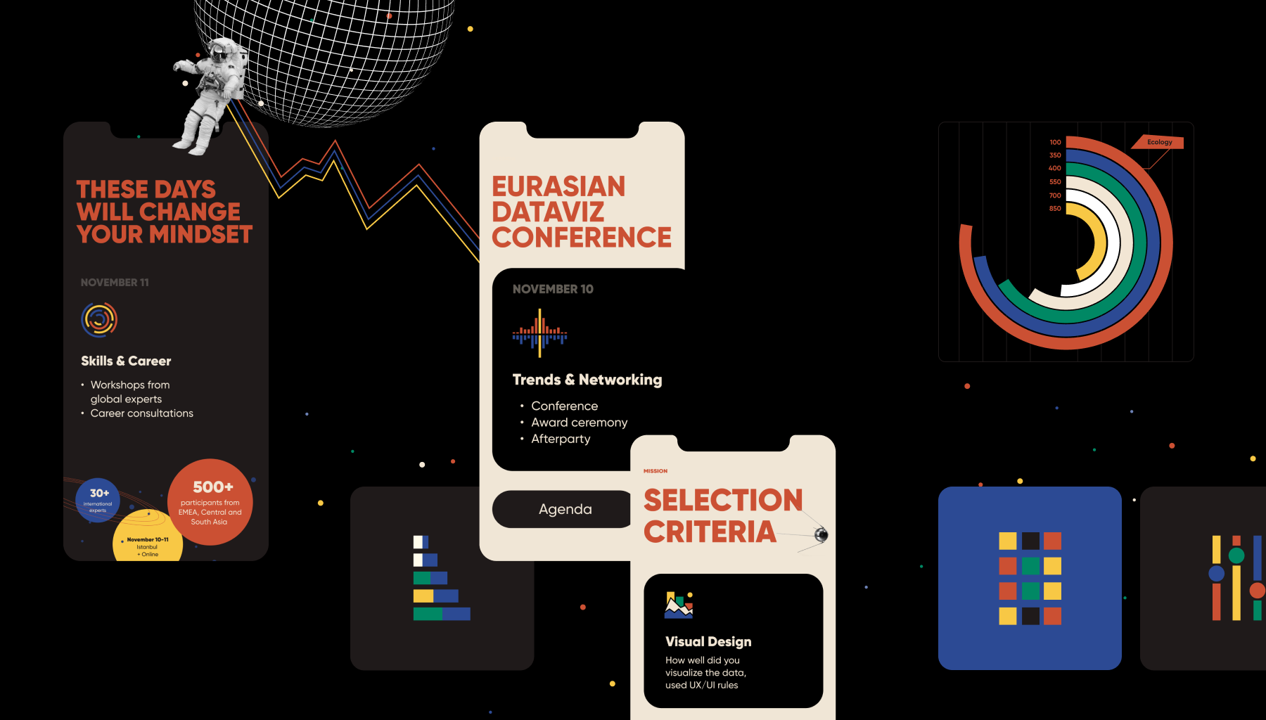 Оставив колористику стиля, мы внедрили космическую тематику, как символ интернациональности и безграничности события, с элементами диаграмм и графиков.
