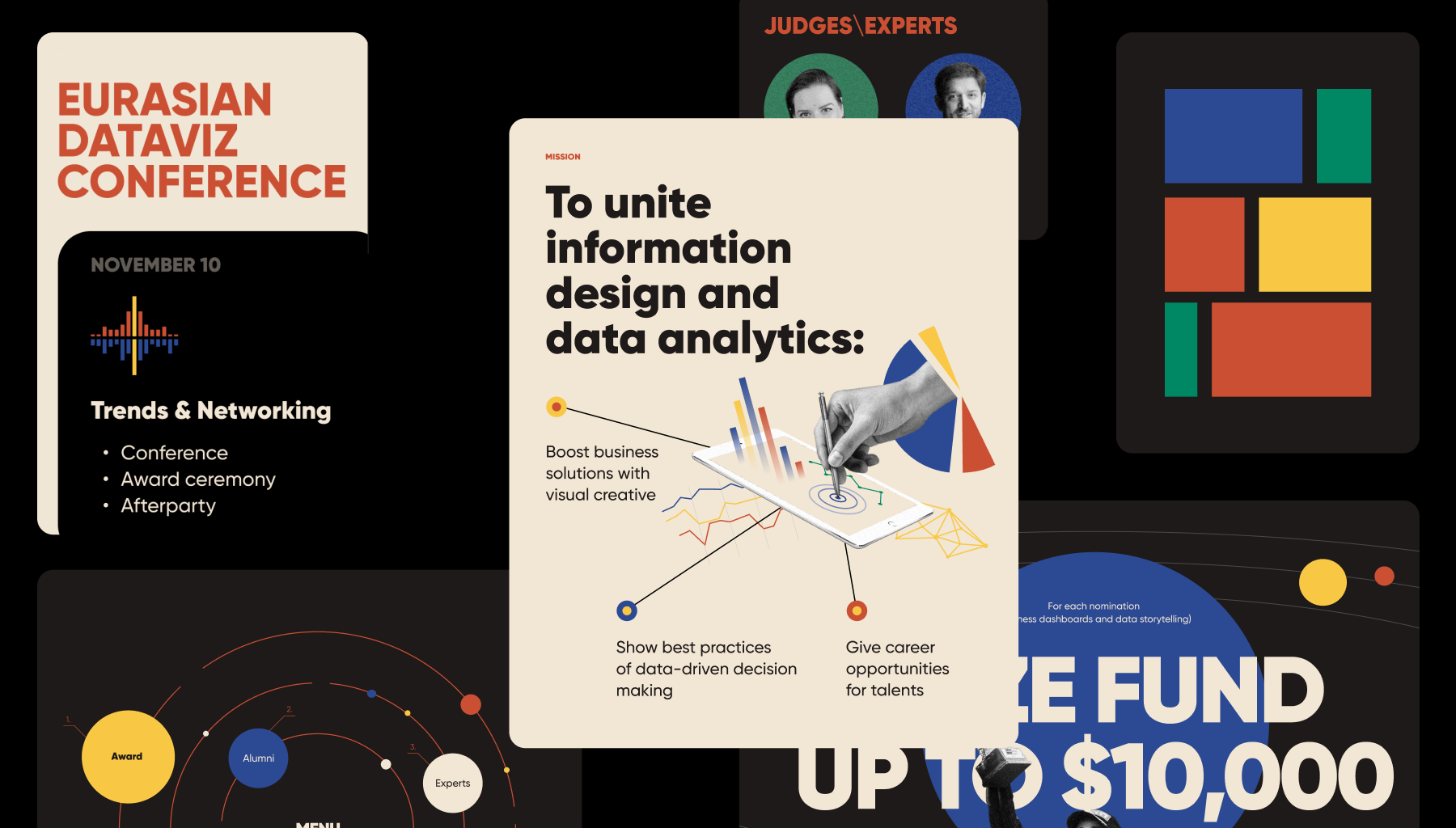 Айдентика конференции должна сочетаться с основным стилем компании — баухаус, коллажи, простые яркие формы и инфографика. Акцентировать внимание на международном статусе и масштабности мероприятия.