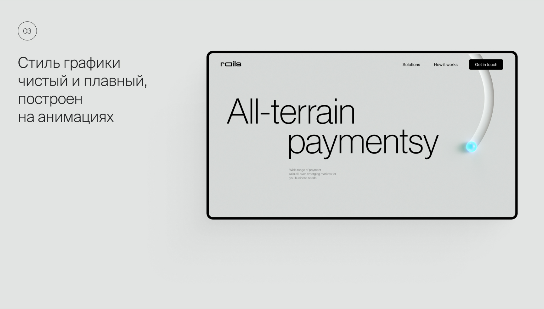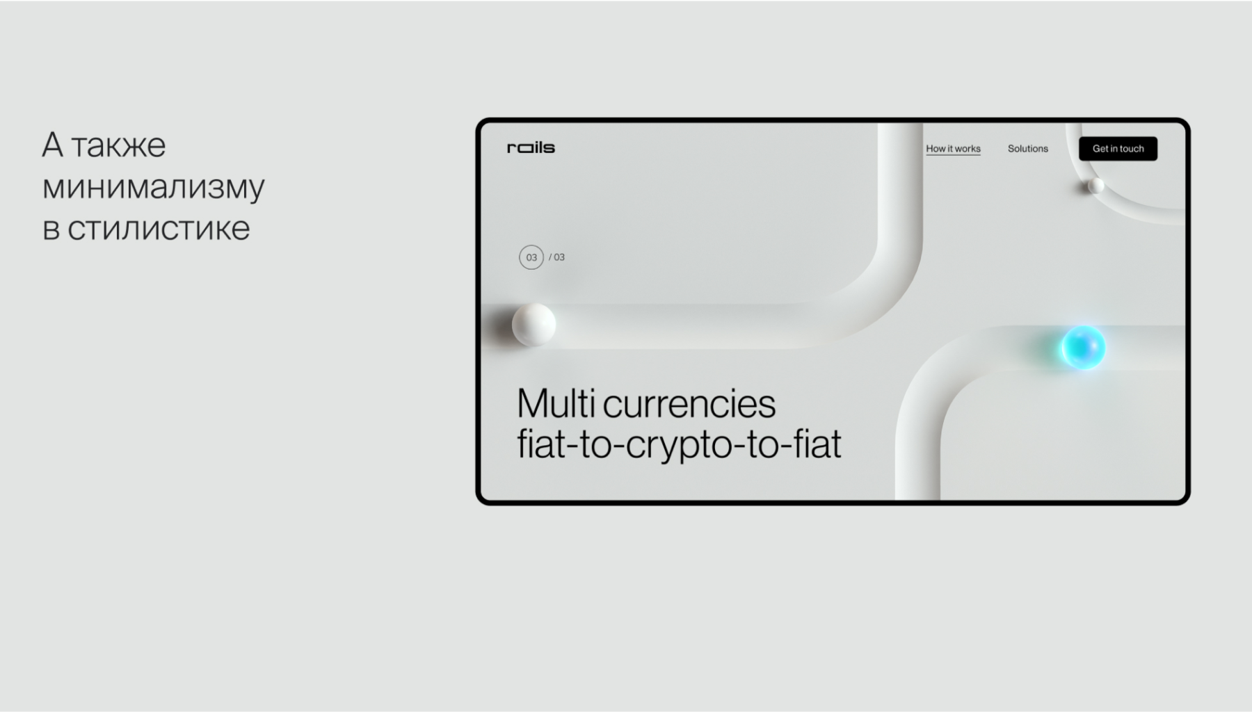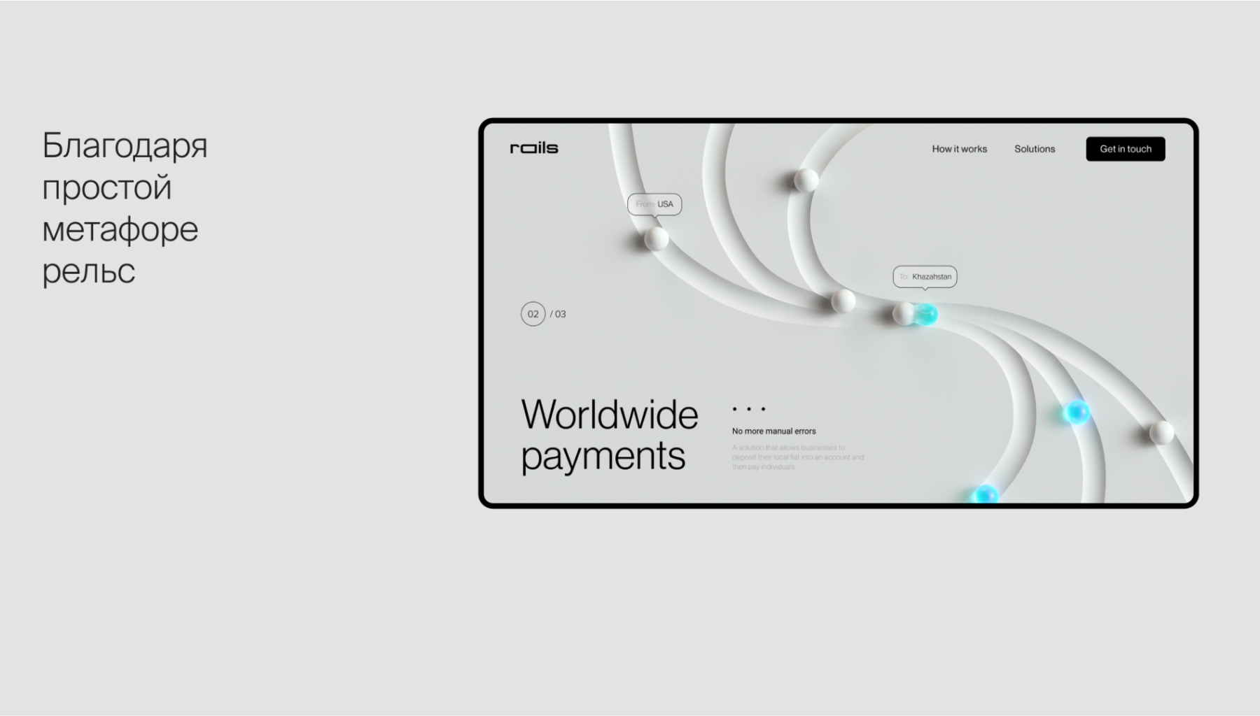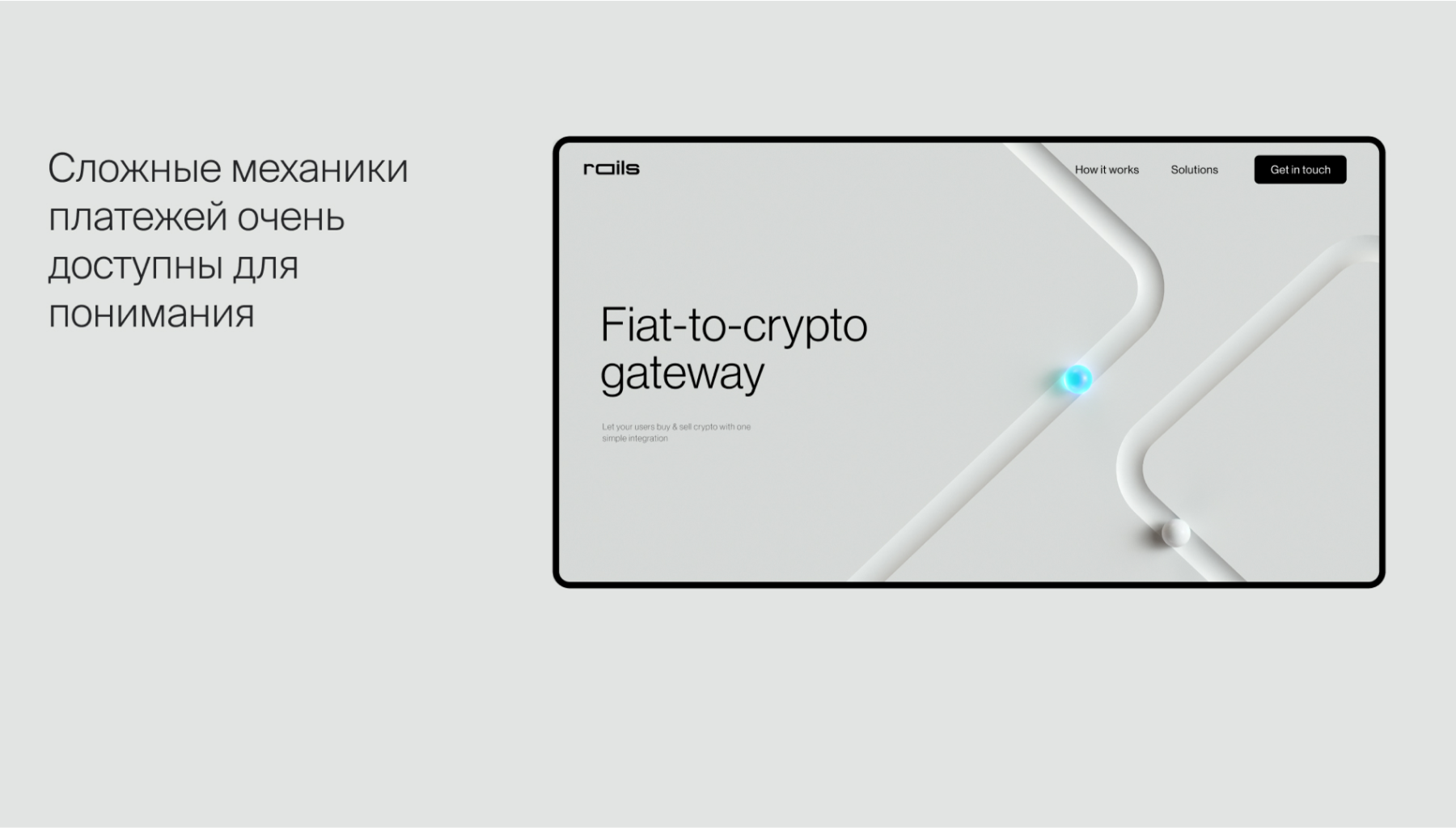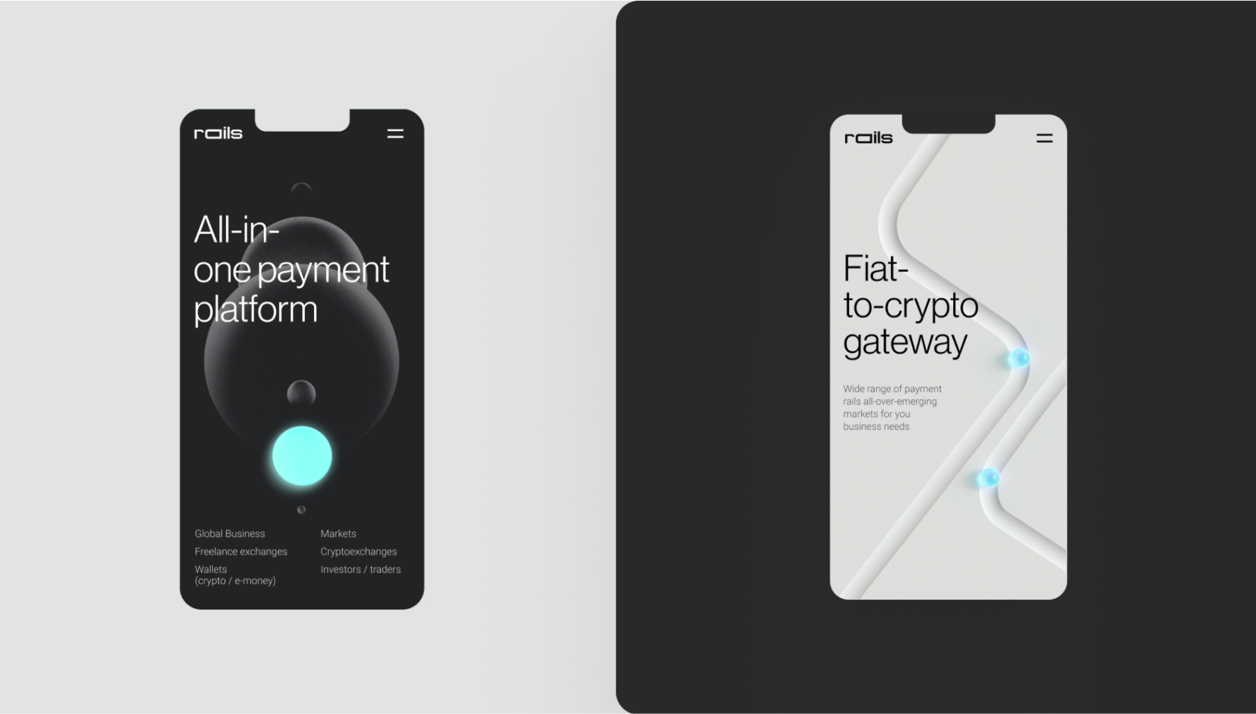 В сфере блокчейн часто используется сленговое выражение «отправить деньги по рельсам» — именно с этим выражением заигрывает нейминг компании Rails, и на идее «рельсов» построена вся дизайн-концепция проекта. Мы выбрали в качестве основных графических приемов мягкую анимацию и 3D, что безусловно помогает передать динамику продукта, но также используем типографику, цепляющую палитру, что позволяет интегрировать данный стиль в статику и любые другие digital-форматы.