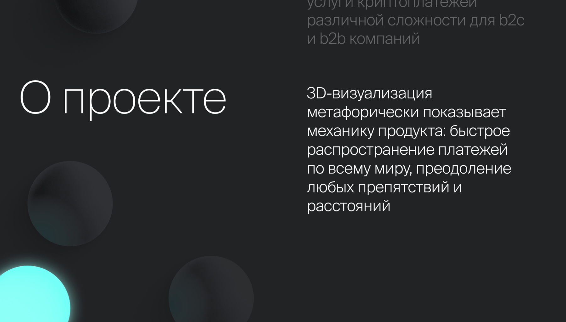 Не смотря на то, что платформа продукта работает на блокчейне, для компании было важно уйти от типового «пёстрого» дизайна, свойственного крипто-проектам. Задачей студии было отразить в дизайне технологичность, инновационность продукта, а также создать впечатление практичности, атмосферы надежности и доверия.
