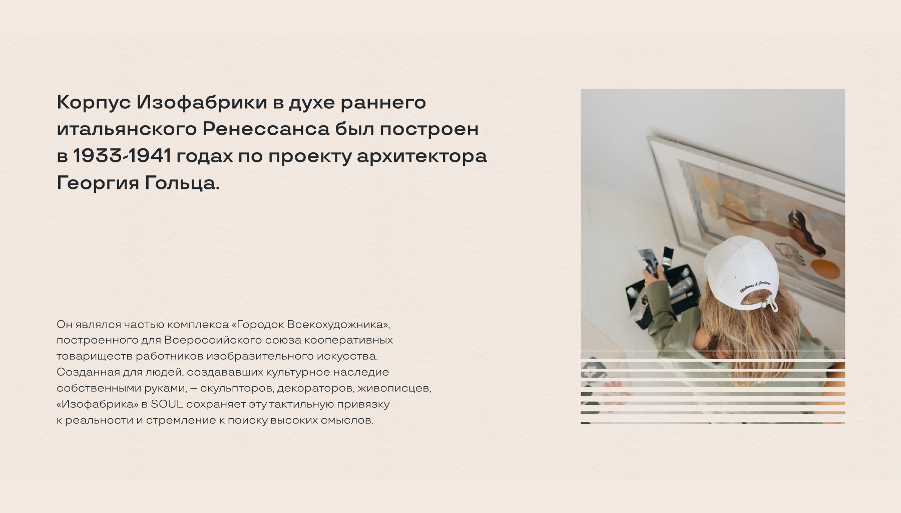 SOUL — это жилой комплекс бизнес-класса от девелопера FORMA. В центре проекта Изофабрика — объект культурного наследия 1933-34 годов. В Москве середины XX века именно здесь была сконцентрирована творческая и созидательная мысль города. Опираясь на историческую репутацию района, девелопер проекта сделал ставку на образовательную и творческую импакт-инфраструктуру.