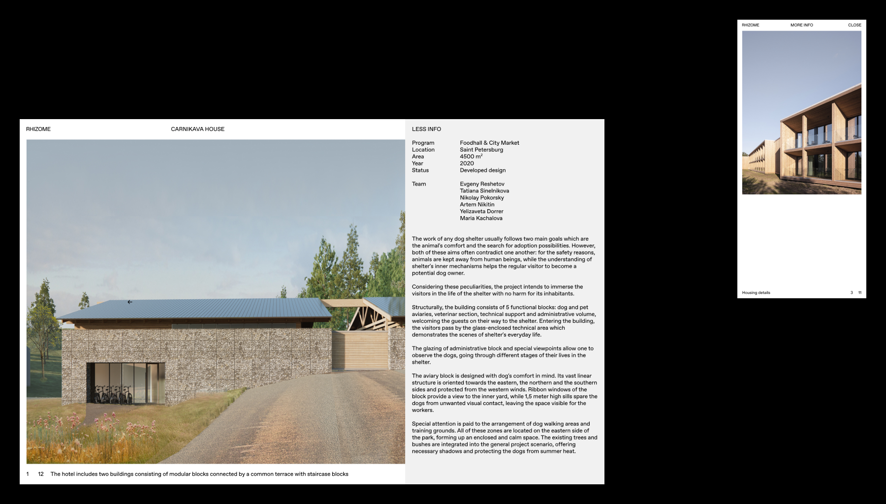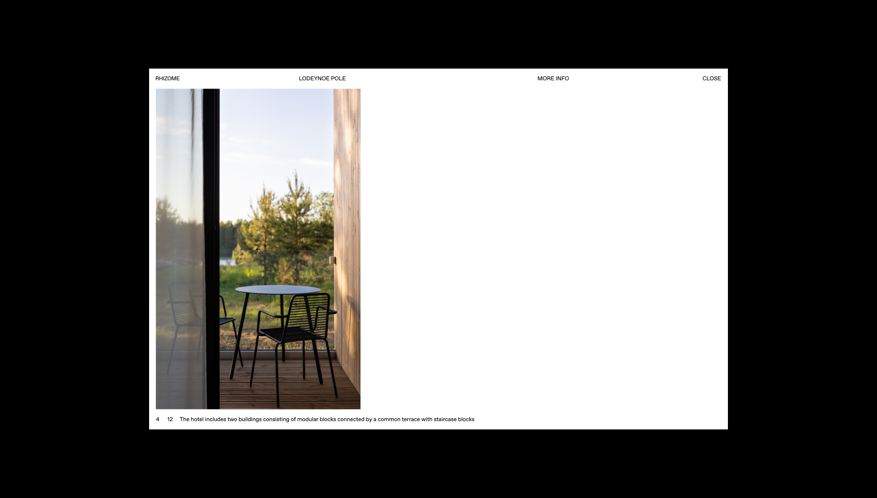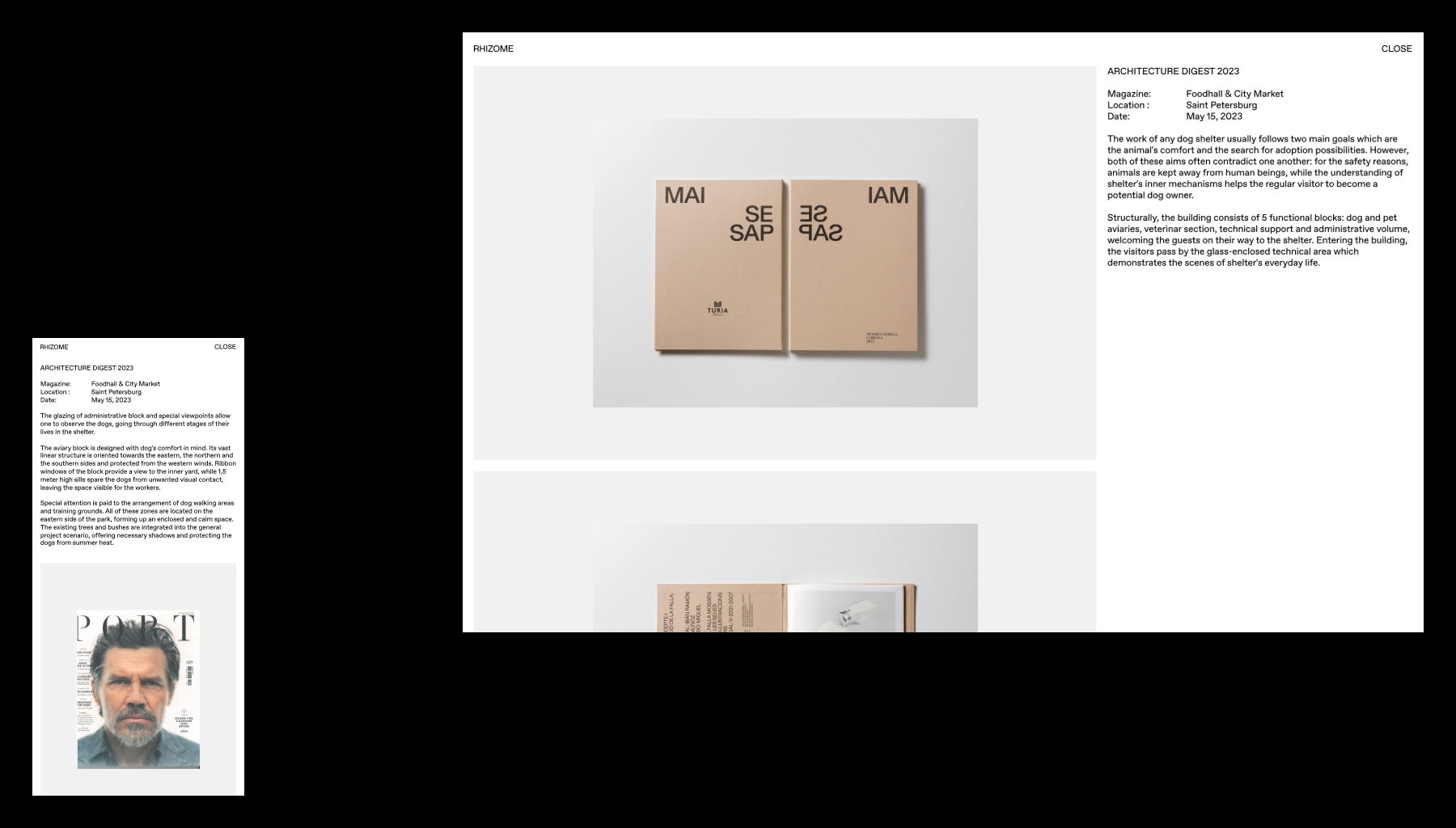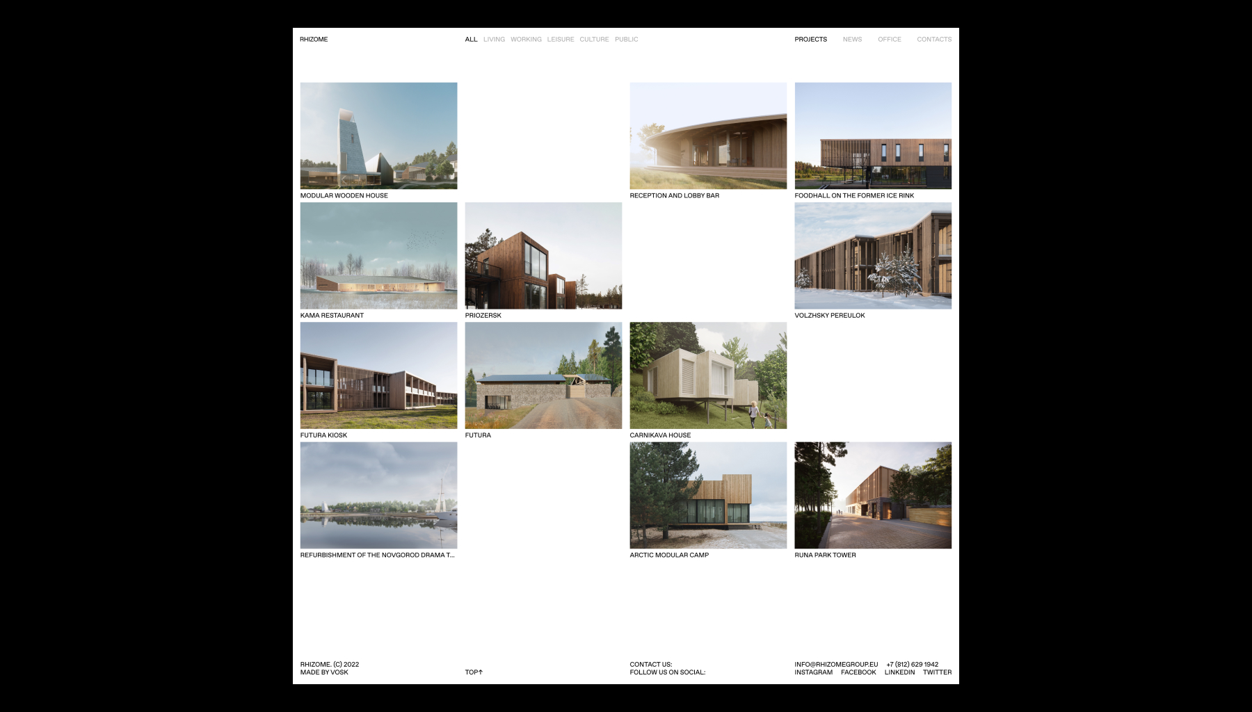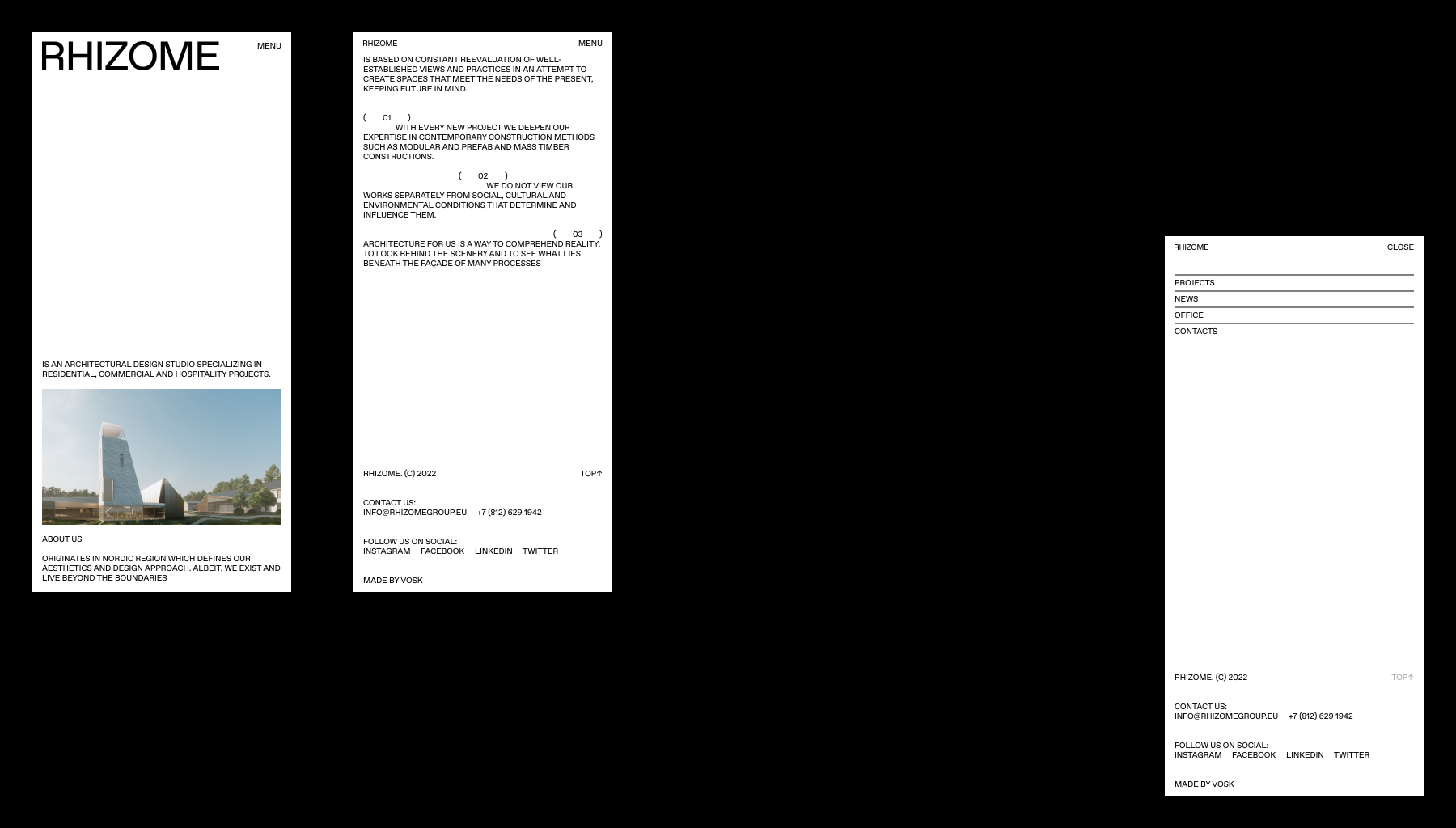 В основе айдентики простота, лаконичность и взаимосвязанность. Слово Rhizome переводится как «корневище» и является горизонтальными связями всех элементов друг с другом. Мы разработали веб-сайт, отражающий этот подход и демонстрирующий проекты таким образом, что это не заигрывает со зрителем, и при этом эффектно выделяет работы бюро.