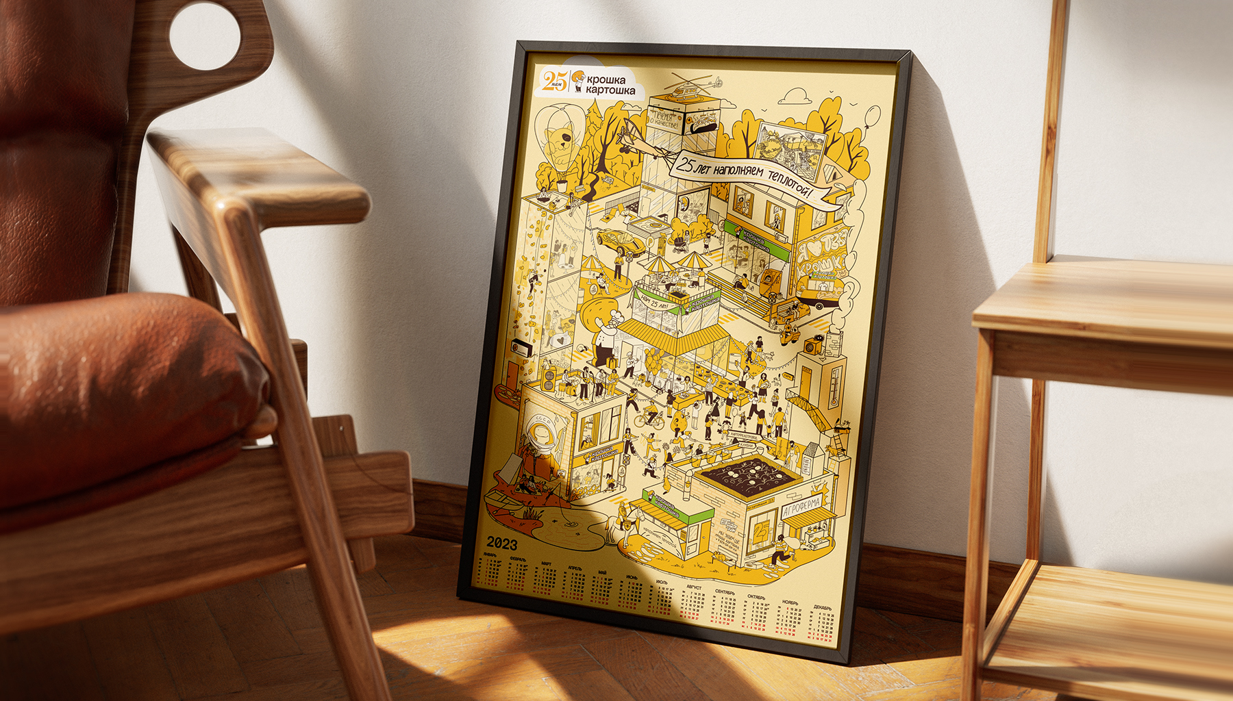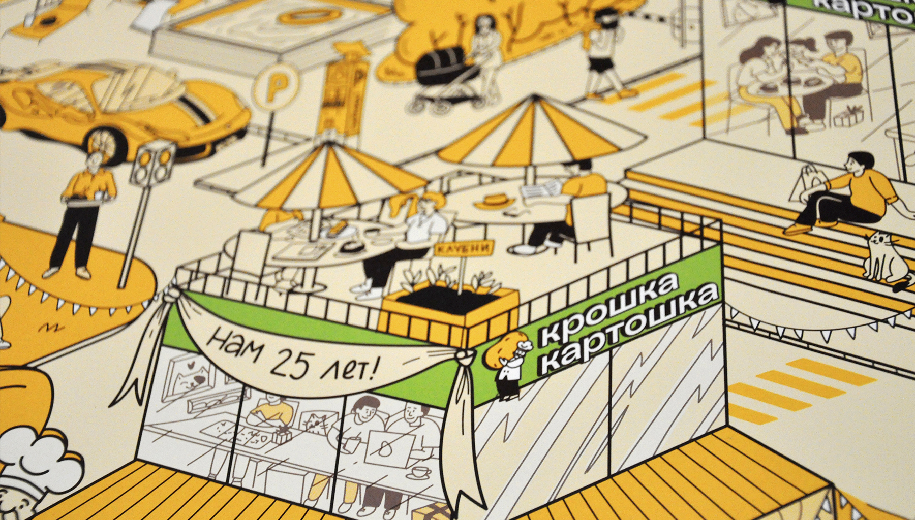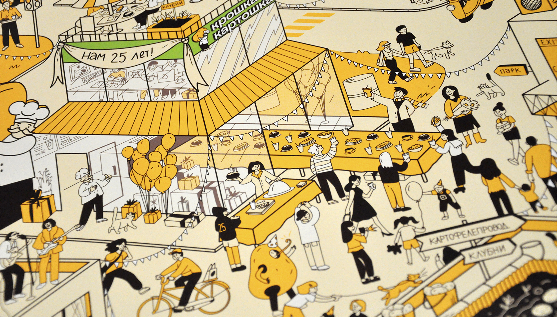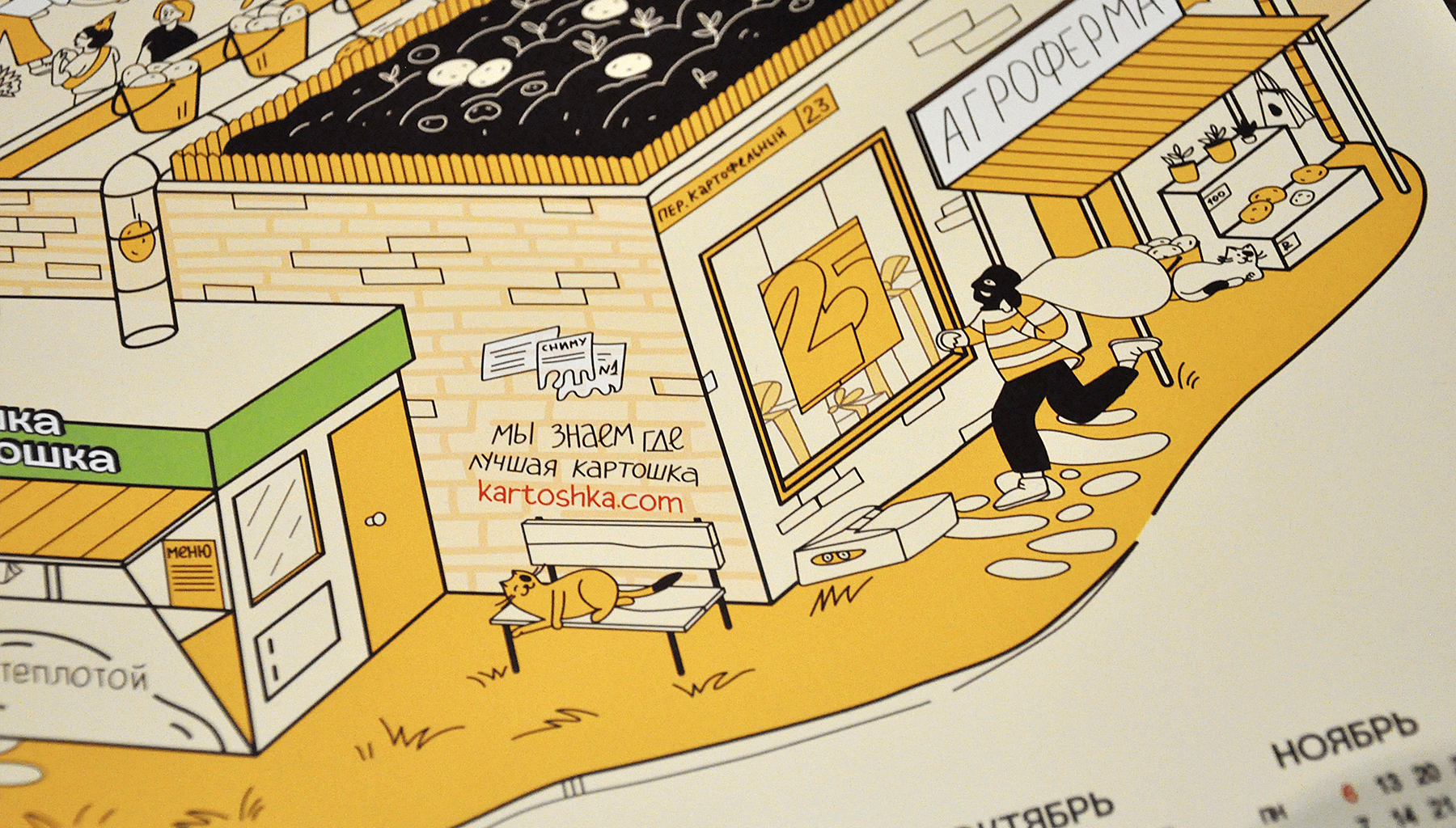 Остановились на стиле виммельбух — иллюстрации с множеством деталей, которые помогают рассказать большую историю компании и разместить пасхалки, которые интересно искать. Например, в честь круглой даты в календаре спрятались 25 кошек, а еще можно найти клубнепровод и граффити с признанием в любви к картошке.
