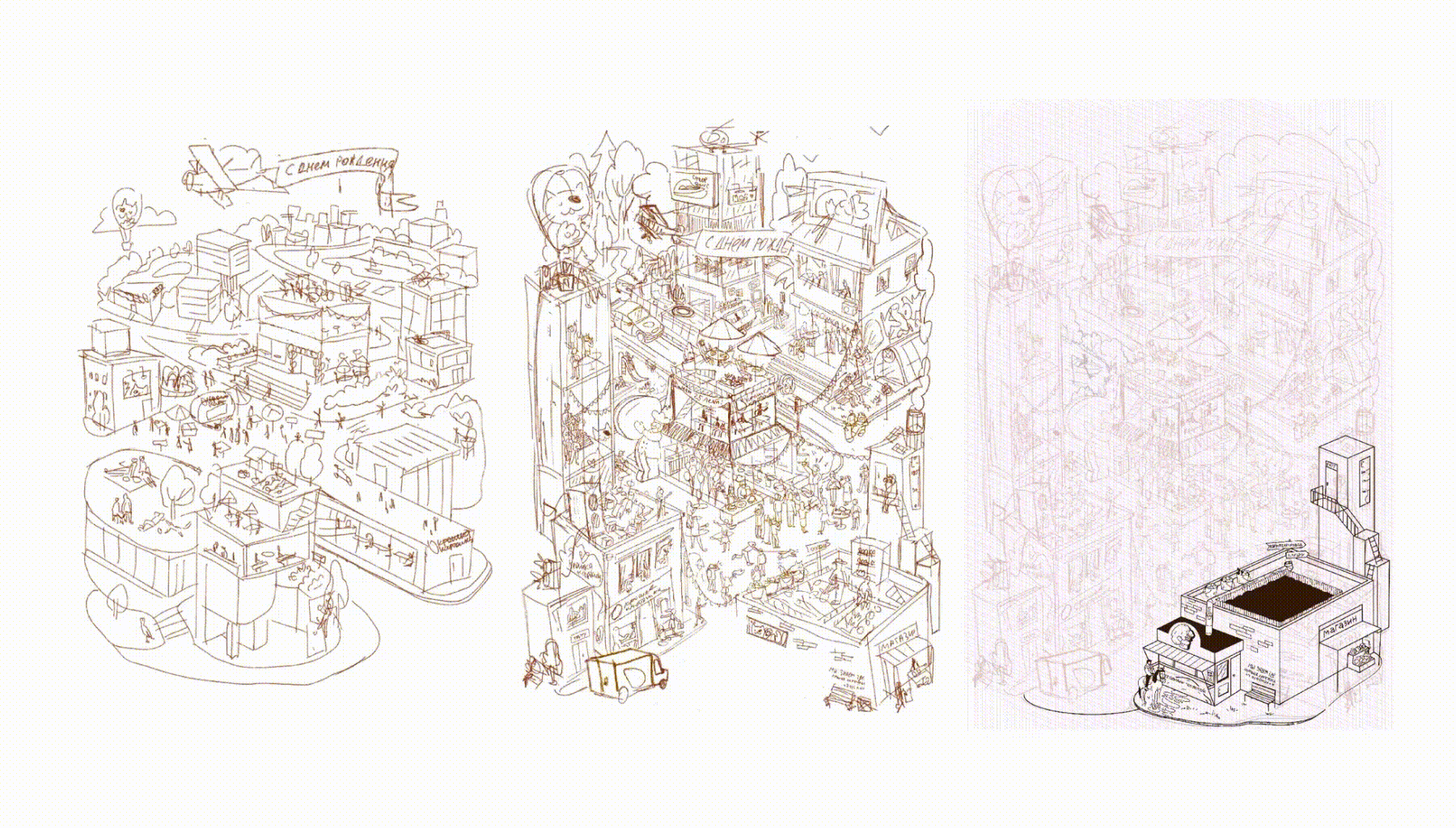 Главная тема иллюстрации — большой праздник в честь открытия нового флагманского кафе. В то же время город пропитан атмосферой расслабленного выходного дня: кто-то неторопливо гуляет с ребенком, кто-то сидит на рыбалке, а кто-то просто отдыхает на лавочке и наслаждается праздником. Многие из этих персонажей, в которых посетители Крошки Картошки могут узнать себя, появились в рамках разработки ребрендинга и иллюстративного стиля.