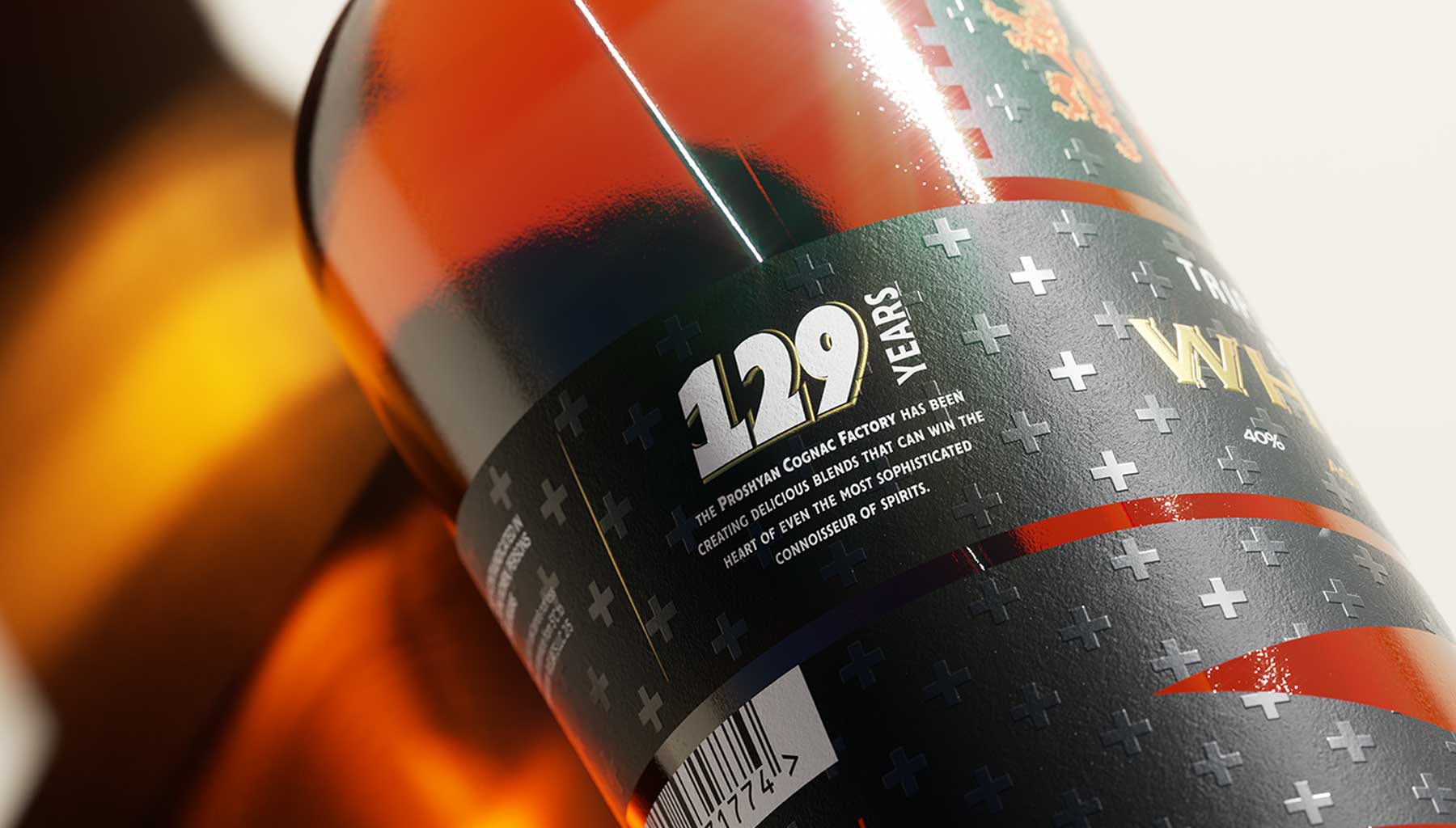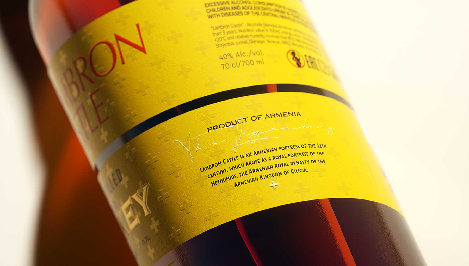 Идея: Название виски — Lambron Castle. Это реально существовавший армянский замок, история которого тянется с XI века. Именно история и легла в основу брендинга: герб княжеского дома Ламброна, рыцарский вымпел, краткая историческая справка. При этом дизайн упаковки выглядит современно — мы намеренно не использовали готические шрифты, выбрав актуальный гротеск.