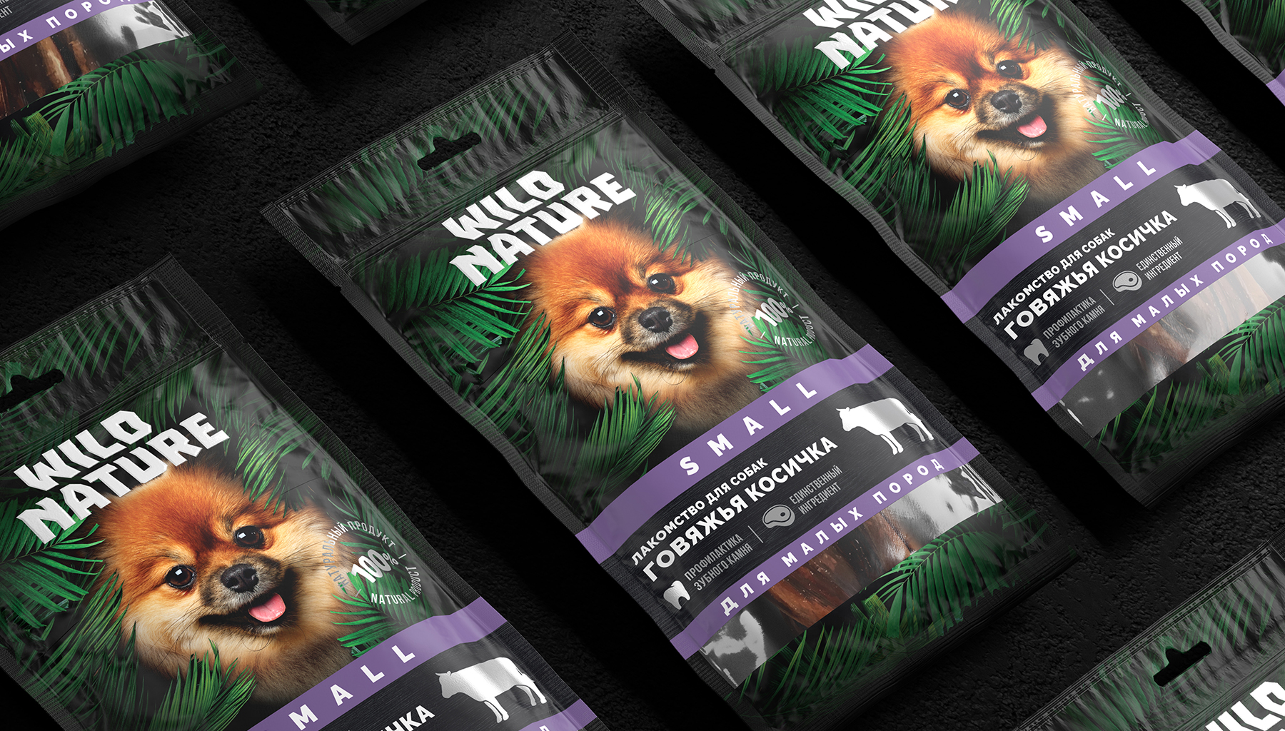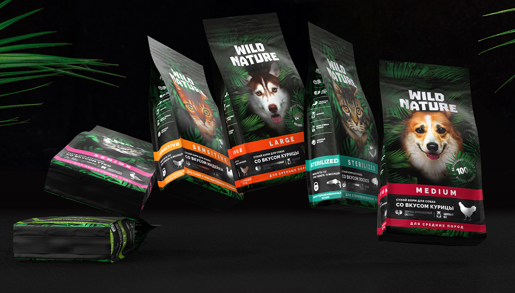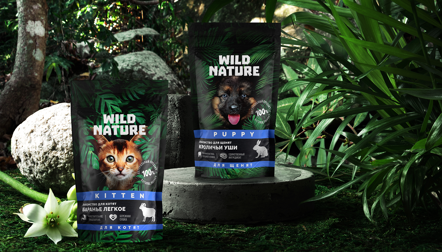 Wild nature – это напоминание владельцам пушистых друзей об их сущности, природе, а также уникальности каждого четвероногого представителя. Именно это команда хотела отразить в дизайне упаковки. Дизайнеры подчеркнули натуральность бренда, использовав сочетание двух цветов – благородного черного и природного зеленого. Эти оттенки также позволяют выделить продукцию бренда на фоне более светлых конкурентов.