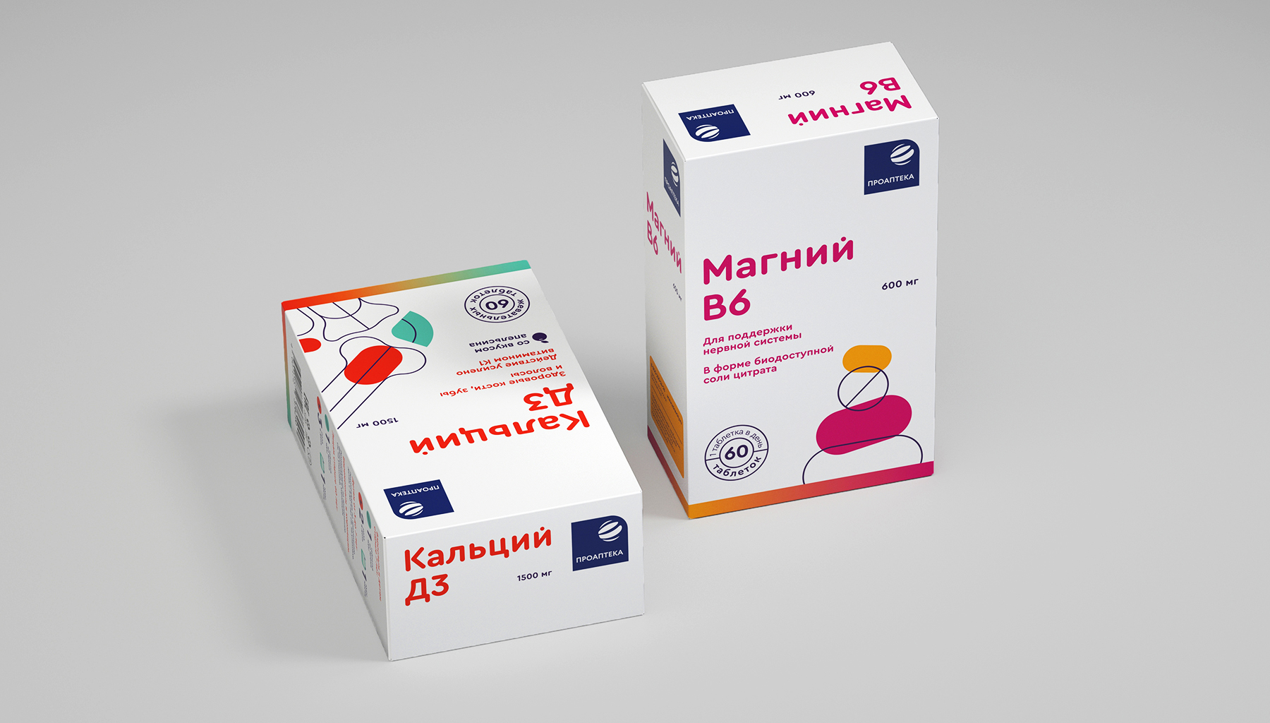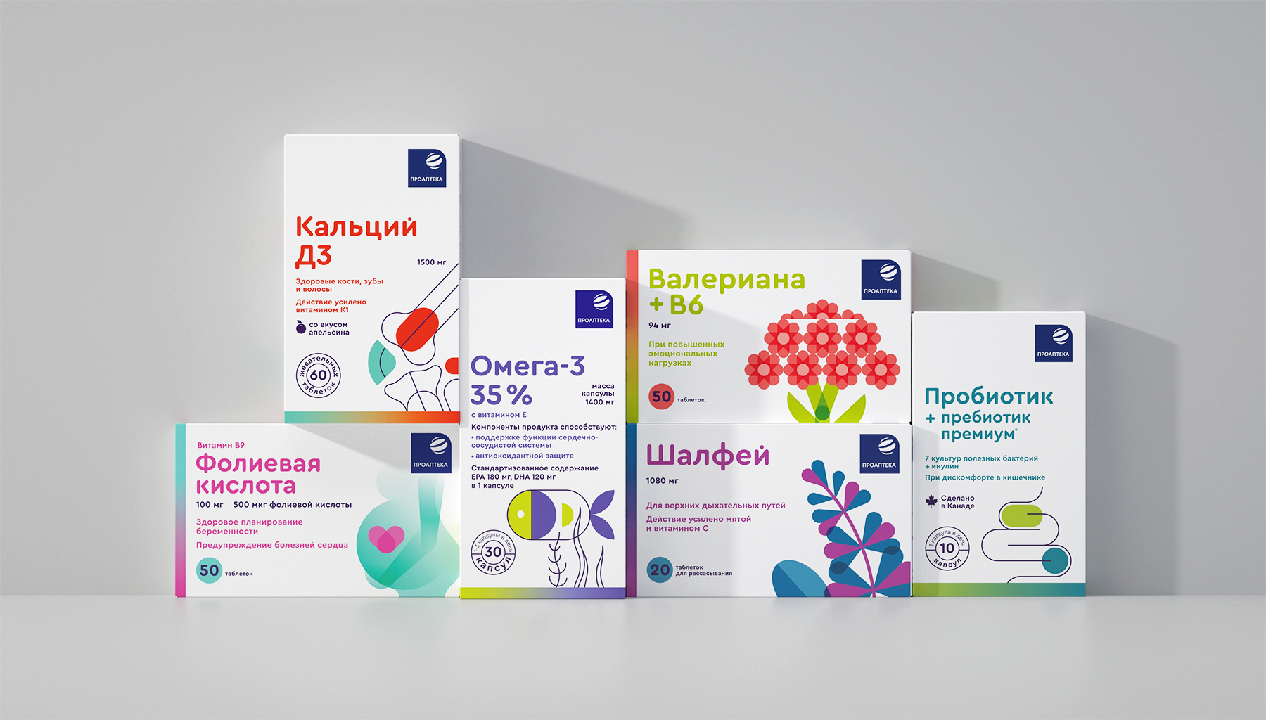 Дизайн всех упаковок выдержан в едином стиле, но содержит нюансы. 10 SKU — это «базовые» БАДы, таблетки и капсулы в блистерах в горизонтальных картонных коробках. Здесь все максимально ярко и крупно. Еще 6 SKU — добавки из более дорогого сегмента, такие как Магний B6 или полиненасыщенные жирные кислоты в банках в вертикальных коробках. Здесь в иллюстрациях появляется дополнительная изящная графика, а экспертные клеймы становятся более «академичными».