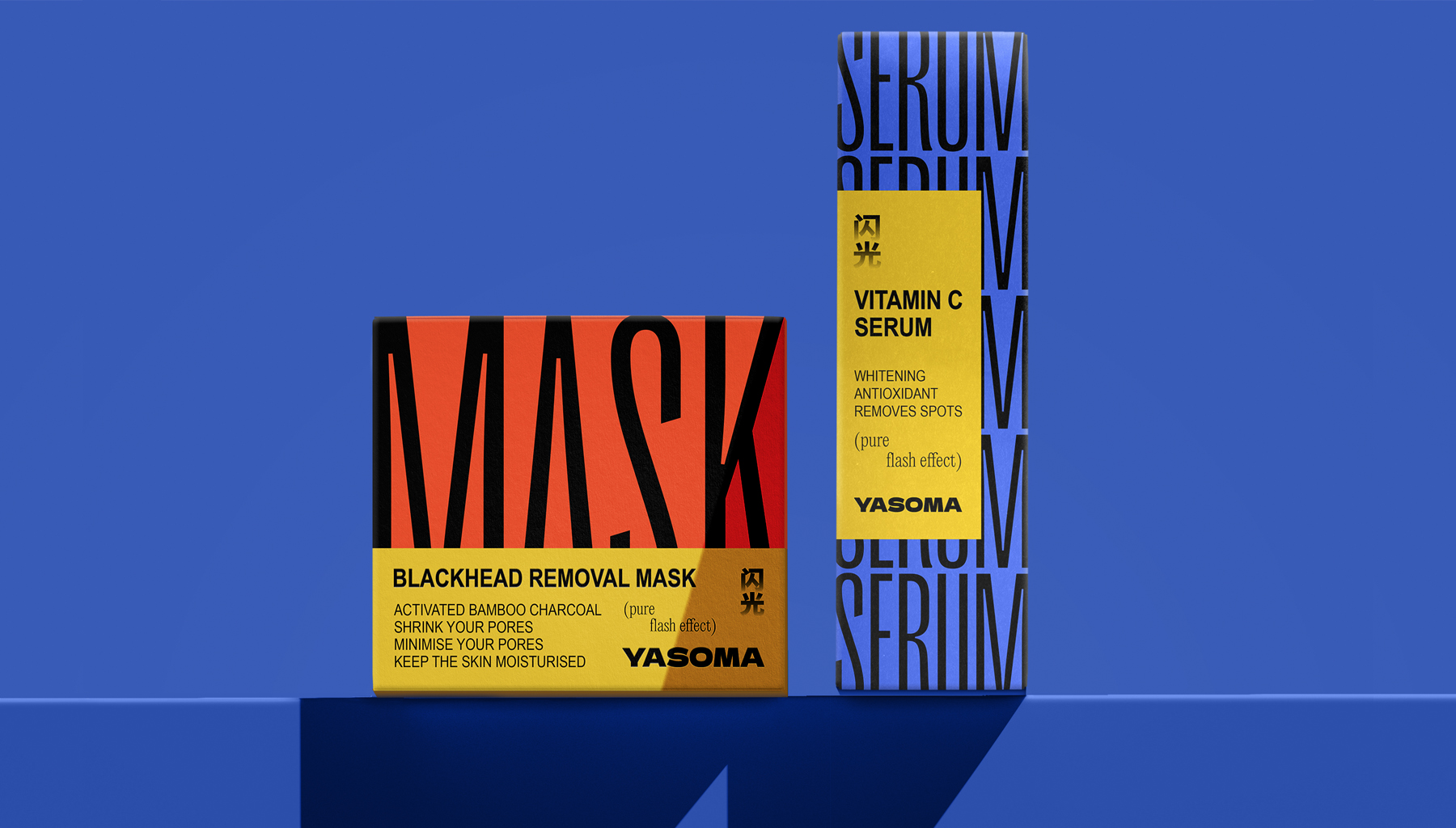 с бренд-зоной и более размеренный по динамике фон. Взаимодействуя друг с другом, они создают ощущение flash-эффекта, переключая внимание с помощью акцентов. В центр упаковки помещен блок с составом и элементами бренда. Современный логотип в гротескном начертании сочетается с традиционными иероглифами, эмоциональный слоган — с преимуществами продукта.
