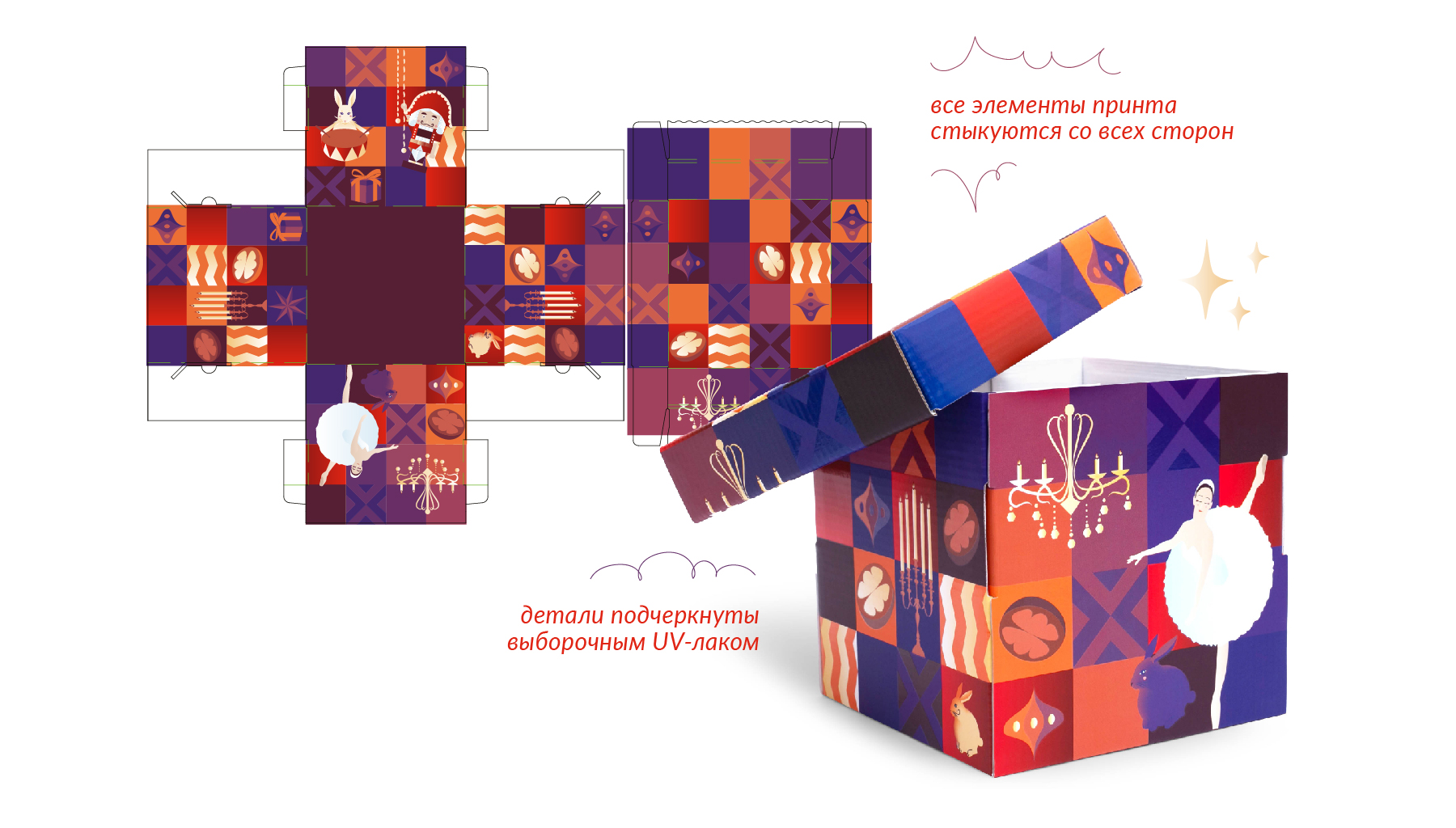 География продаж упаковки: Россия, Франция и Латвия. В основу легли образы из истории, написанной Эрнстом Т.В.Гоффманом в 1816 году. Спустя 73 года был поставлен знаменитый балет с музыкой Чайковского, который теперь неразрывно связан этой сказкой. Сказка, ставшая символом зимних чудес во всём мире, раскрылась по новому - в ярком модульном принте со сложной цветовой гаммой.