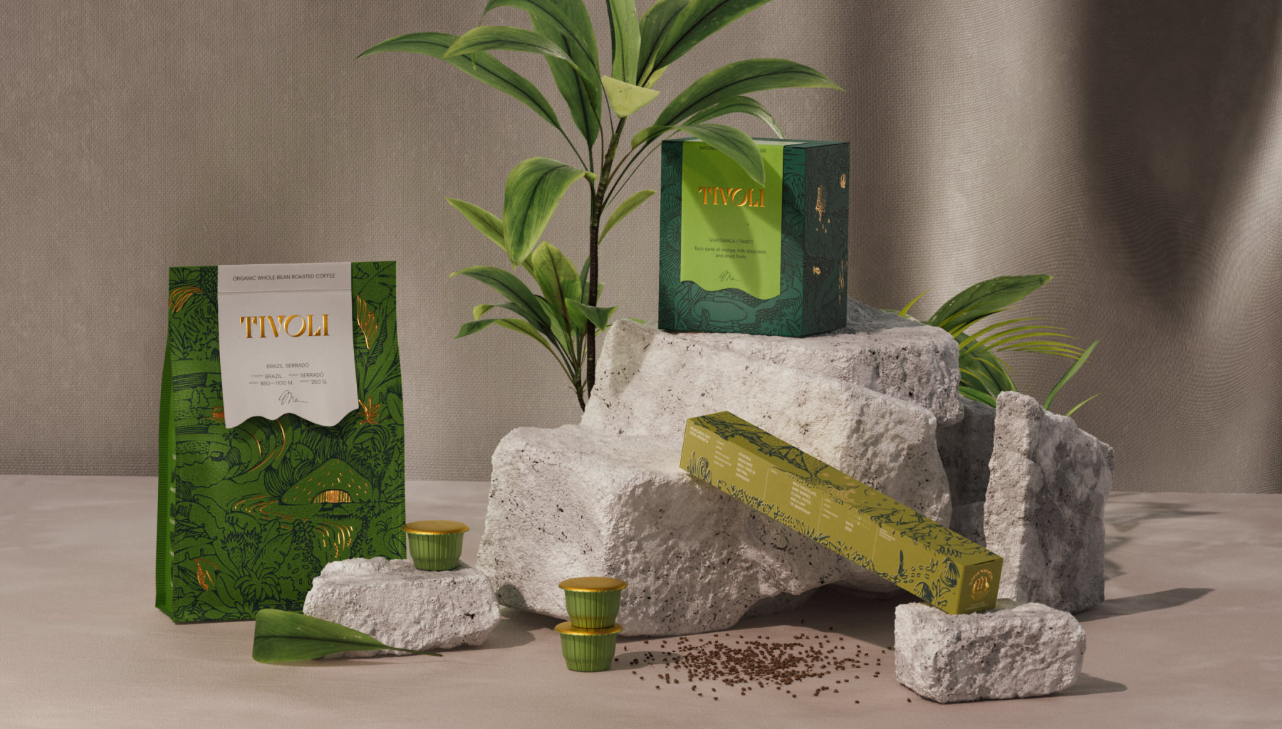 Создать айдентику и упаковку для компании TIVOLI, продающую лучший кофе из Колумбии, Бразилии, Вьетнама, Уганды и Эфиопии.