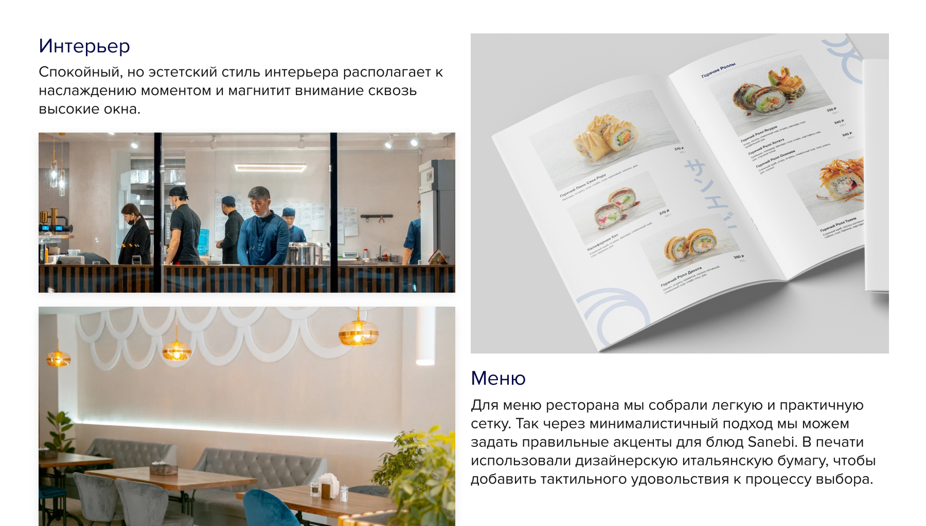 Пластичность и гармония в сочетании с минимализмом. Вертикальный ритм японских гравюр и небоскребов, философские концепции востока, восходящее солнце и силуэт креветки как главного блюда.