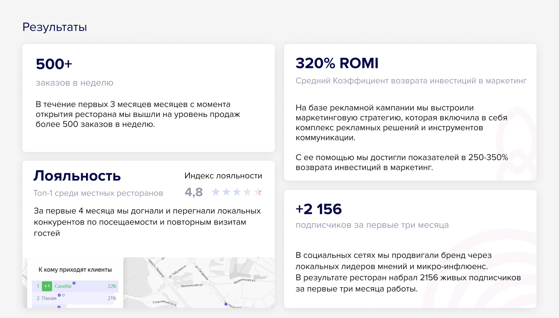 В социальных сетях мы продвигали бренд через локальных лидеров мнений и микро-инфлюенс. В результате ресторан набрал 2156 живых подписчиков за первые три месяца работы.