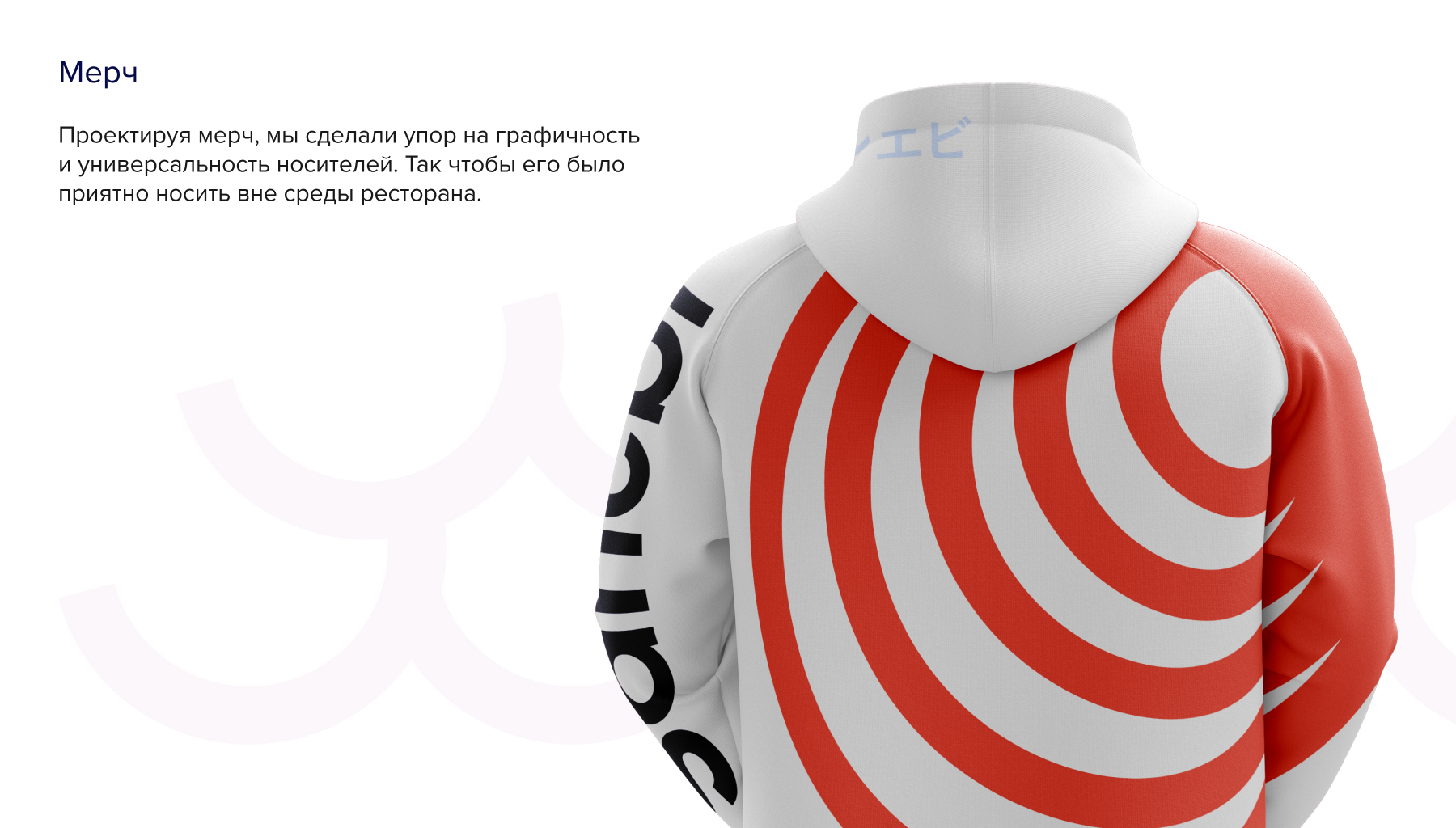 Форма персонала предполагает осторожные отсылки к японской культуре, но в первую очередь, стремится быть удобной для сотрудников. Проектируя мерч, мы сделали упор на графичность и универсальность носителей. Так чтобы его было приятно носить вне среды ресторана.