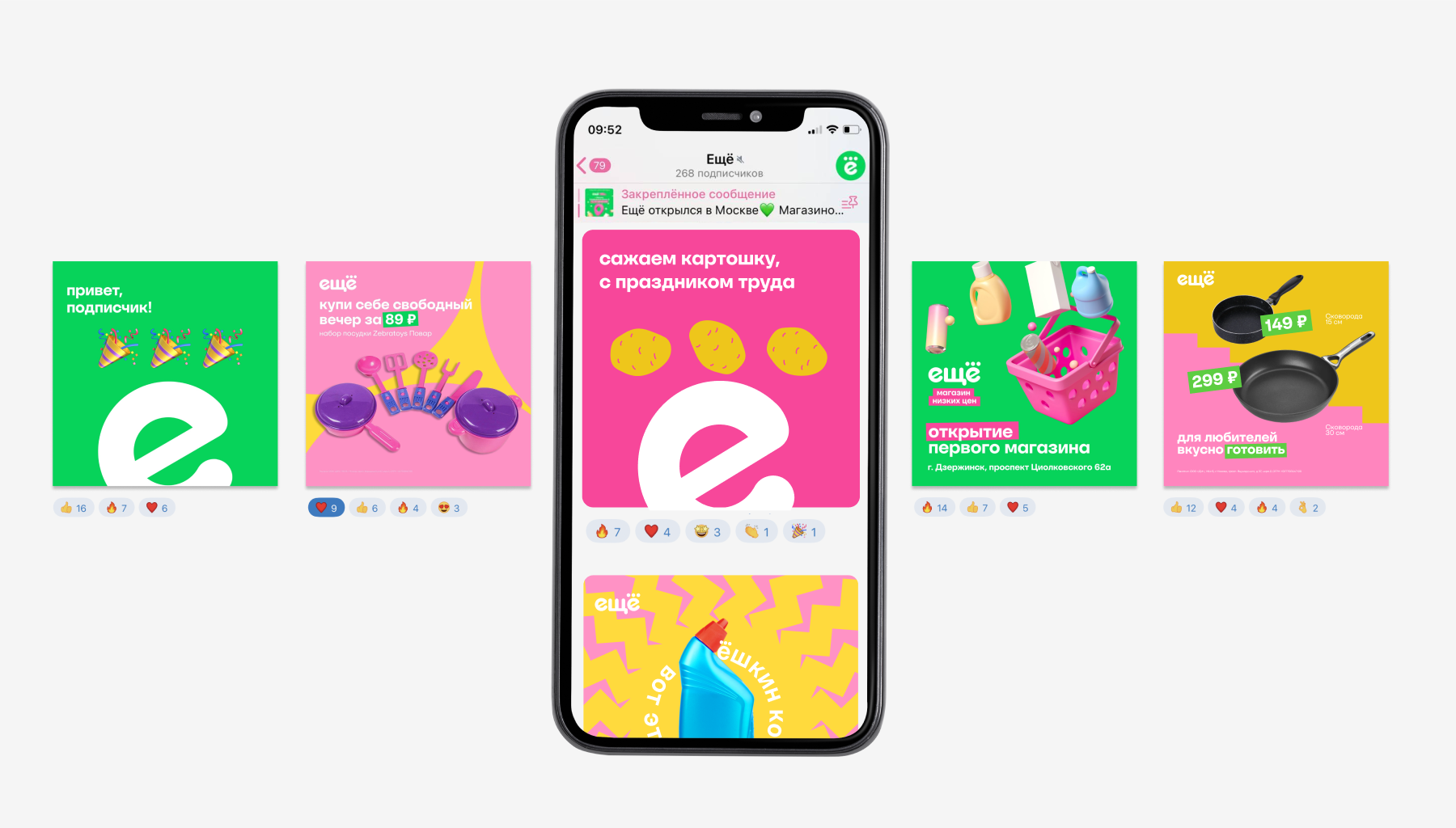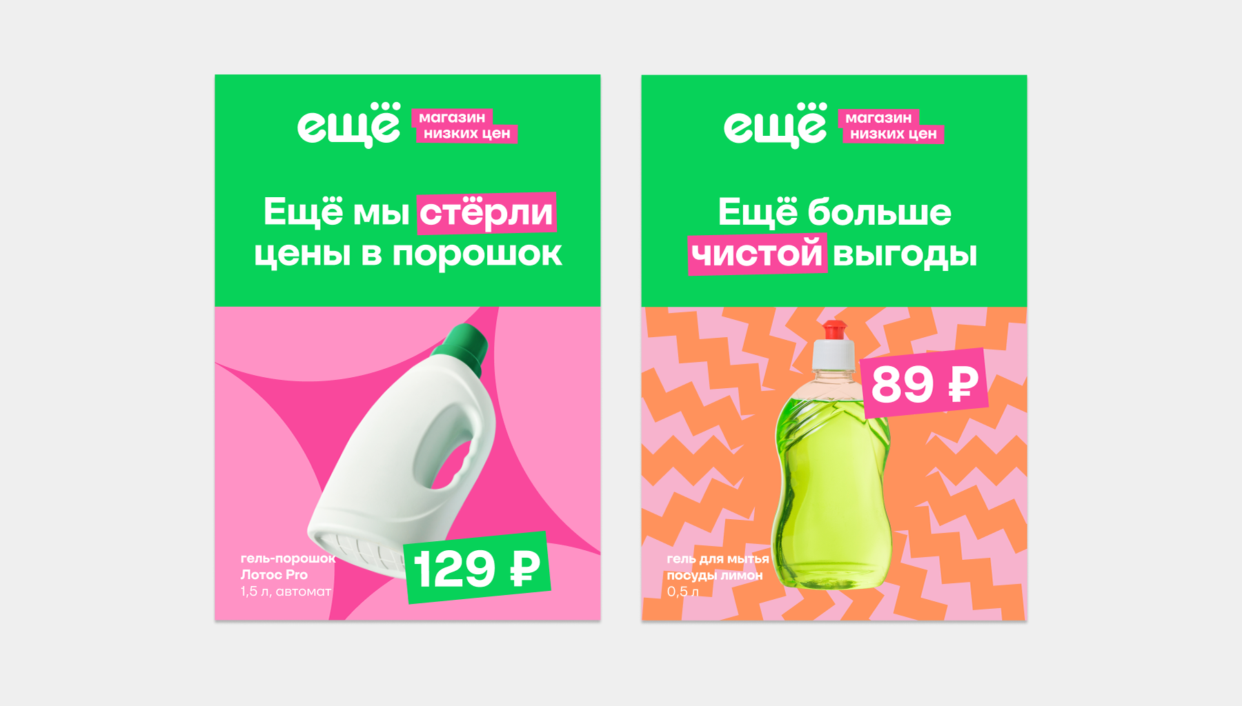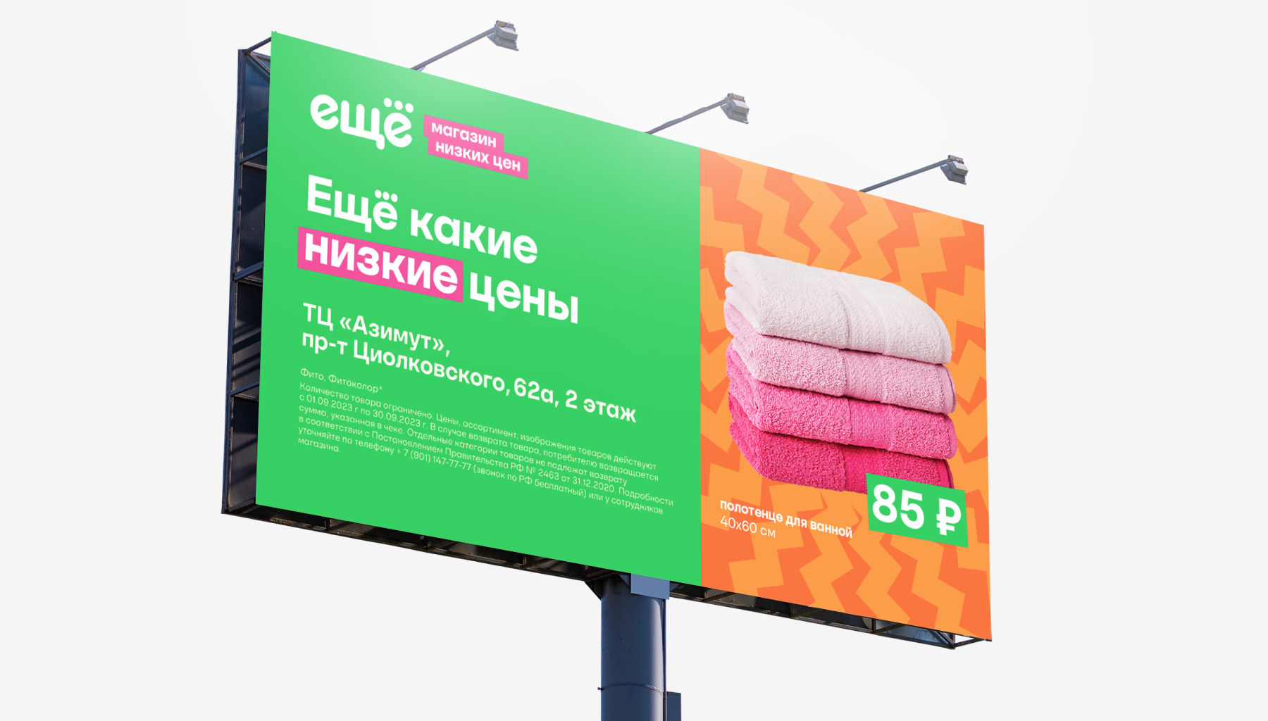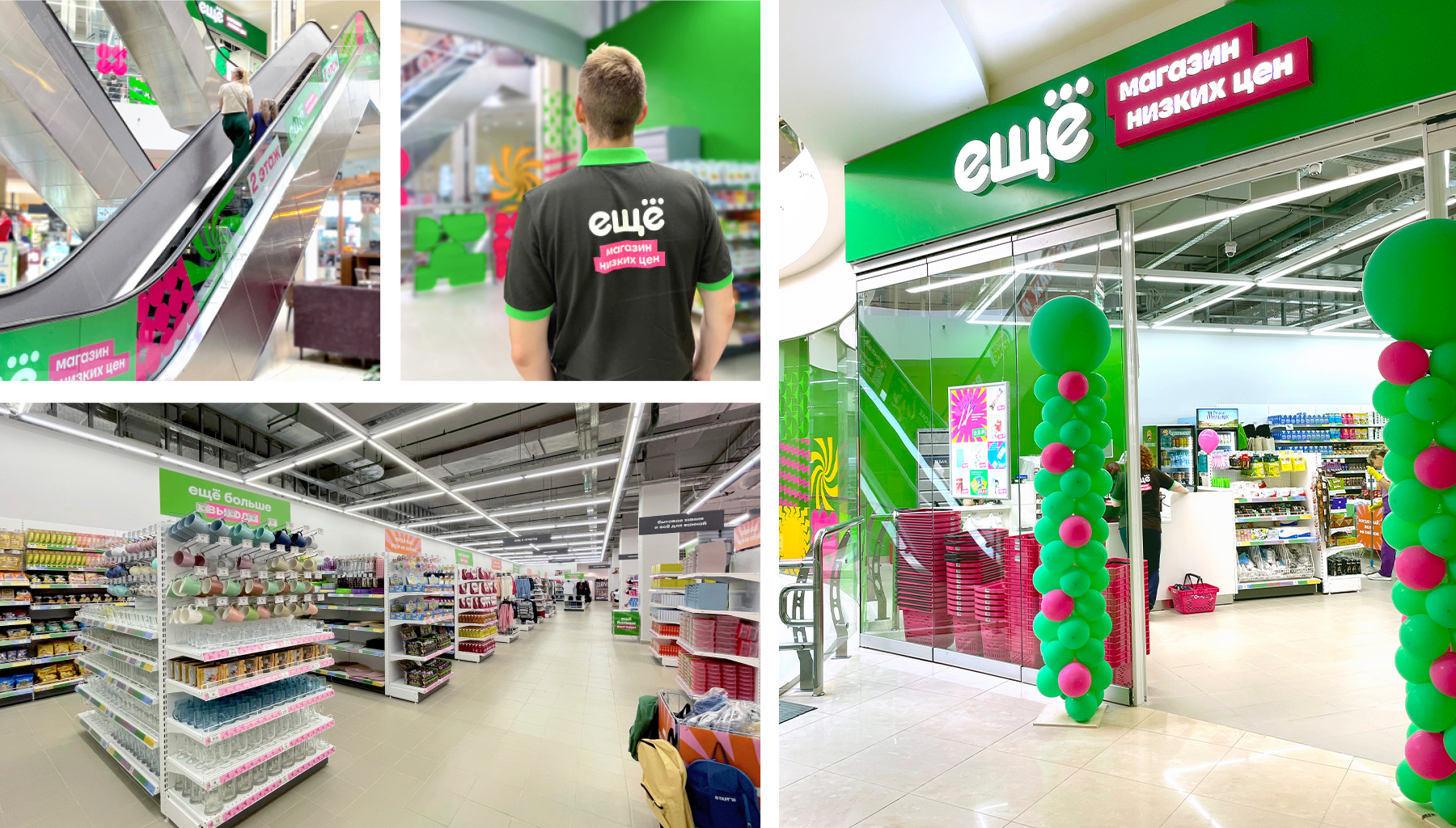 Ещё — новая федеральная сеть дискаунтеров. Это просторные светлые магазины с широким ассортиментом и акцентами на товарах для дома, гигиену, одежду и полезные сезонные подборки.