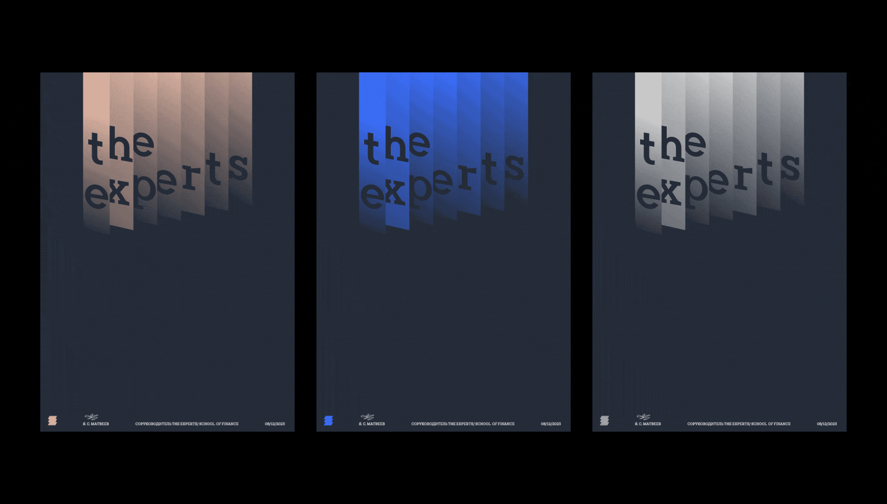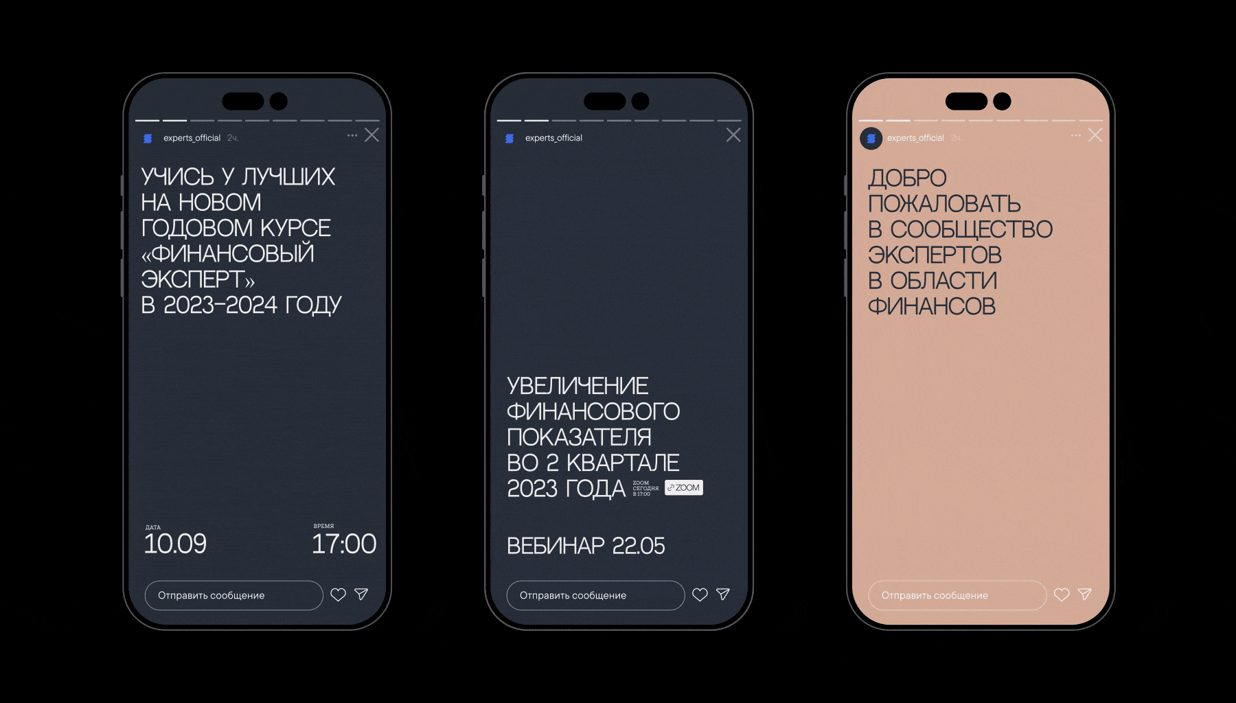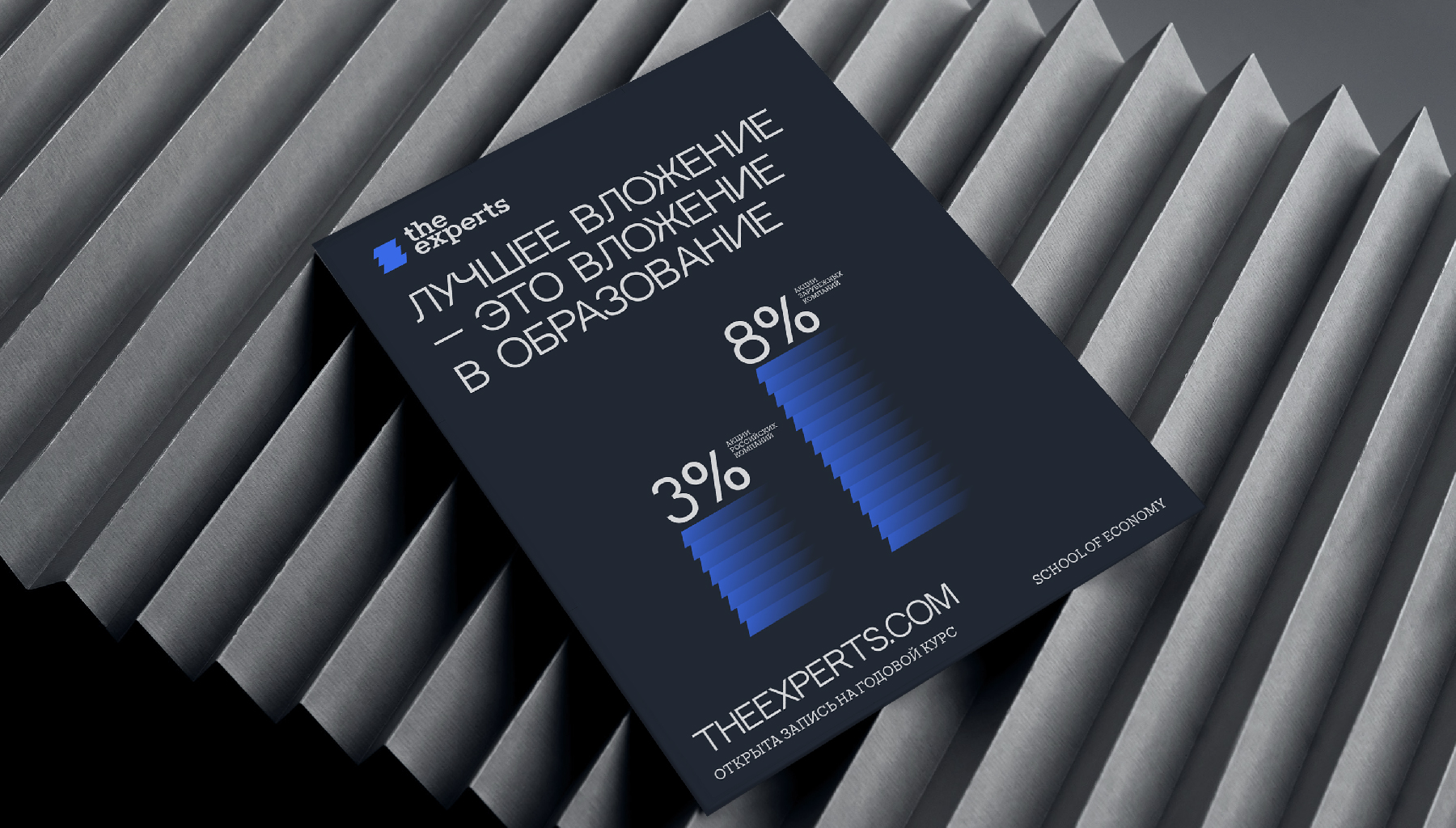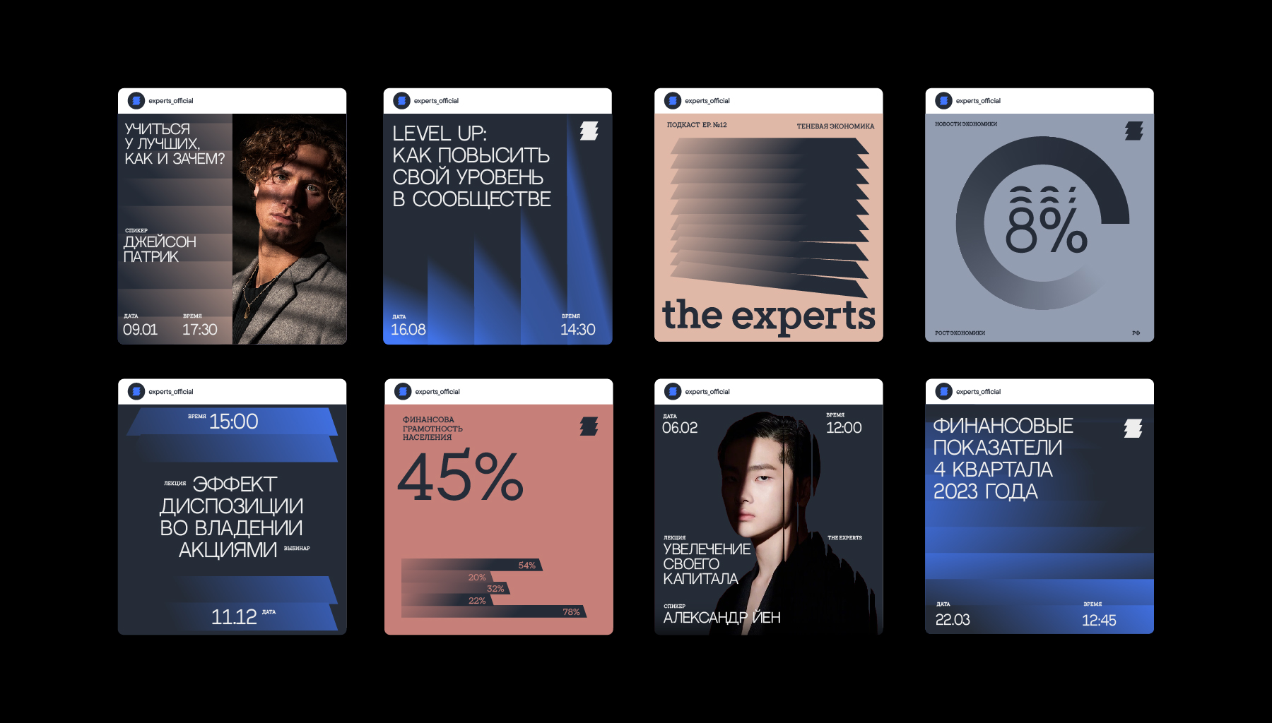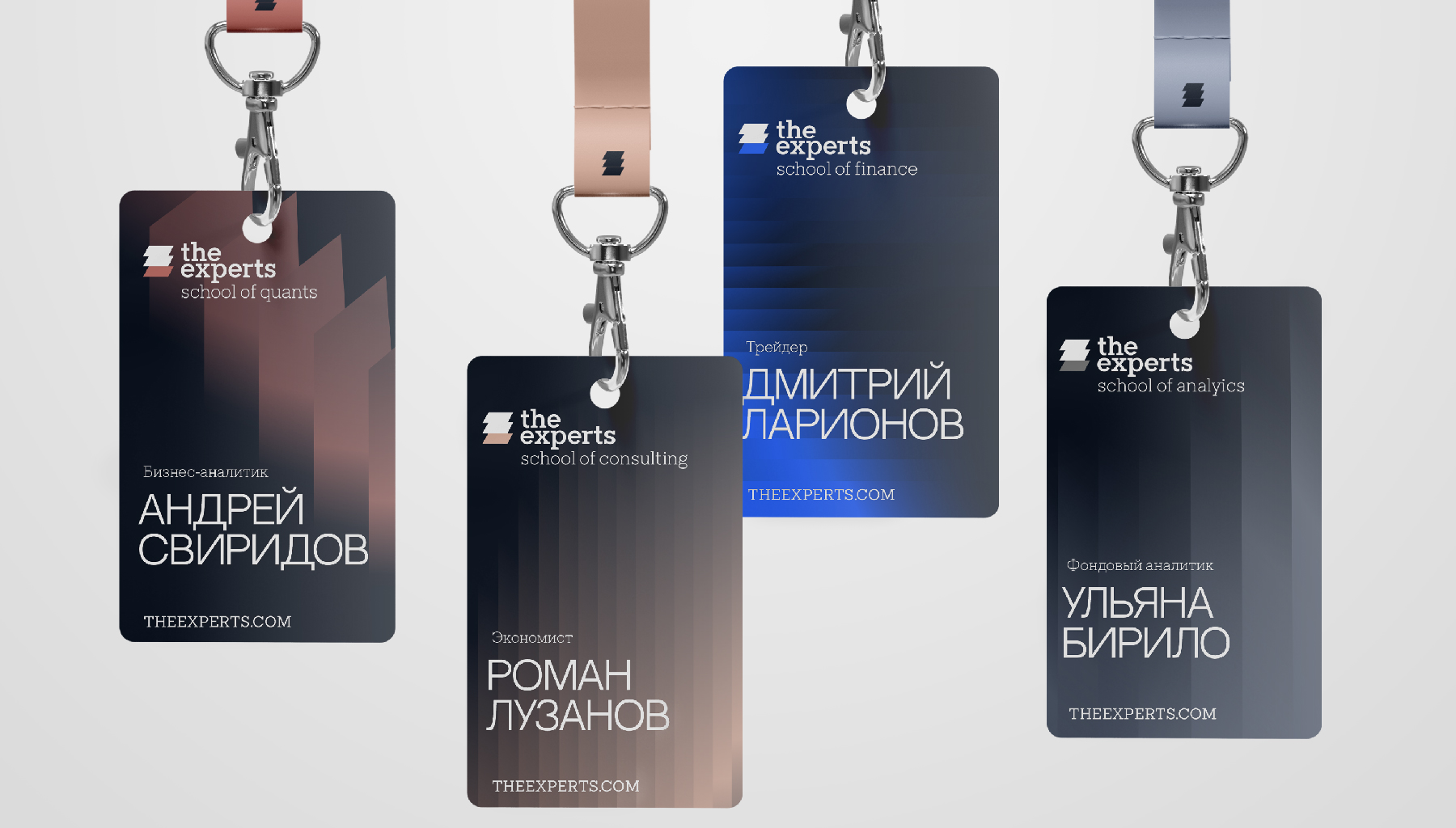 THE EXPERTS — образовательная платформа для опытных специалистов в сфере финансов. Это полузакрытое сообщество, но клиент не хотел говорить об элитарности напрямую, поэтому нам предстояло отразить этот факт с помощью визуального стиля.