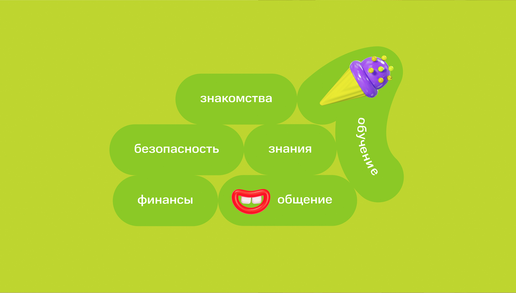 Из этого родилась метафора новой айдентики — яркие метаперсонажи, собранные из полярных фактур. Их можно разобрать, как конструктор, на отдельные части — глаза, рот, нос, уши, и они окружены множеством атрибутов детства. Фирменные контролсы тоже ведут себя как одушевленные персонажи — изгибаются, соприкасаются и слипаются друг с другом.